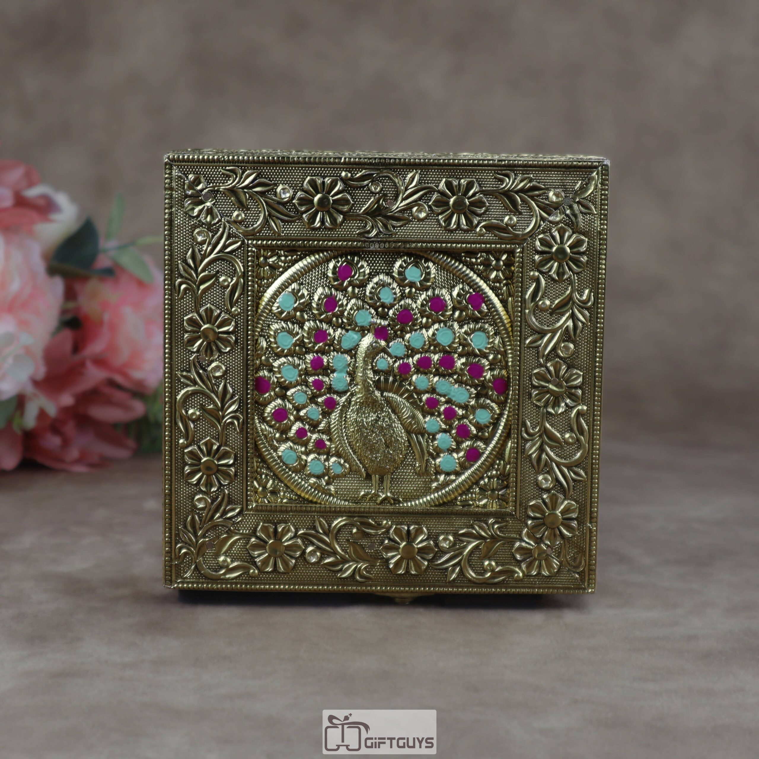 Intricate Artistry: The exterior features rich, embossed floral motifs and a central peacock motif adorned with vibrant teal and magenta enamel accents.