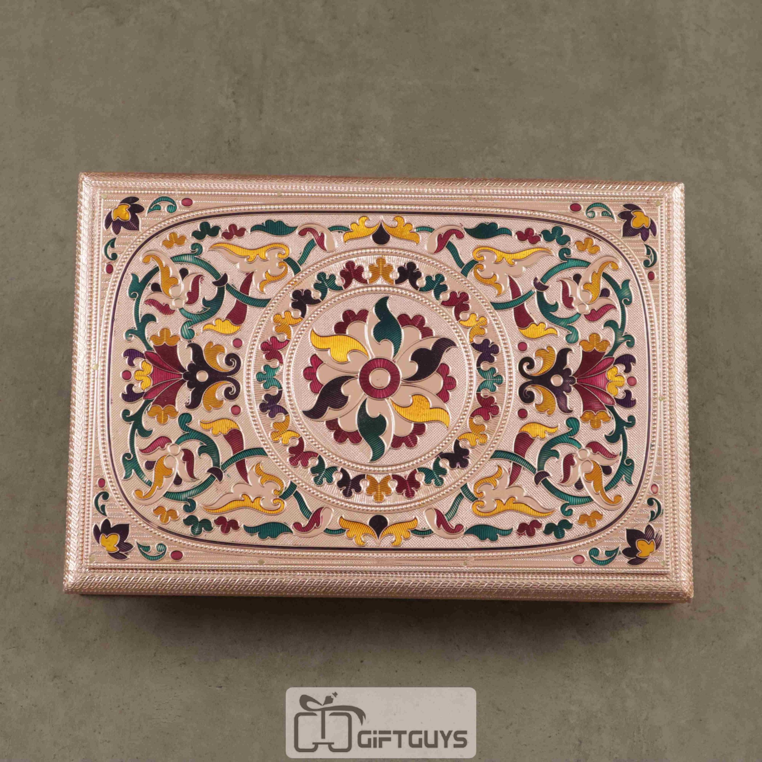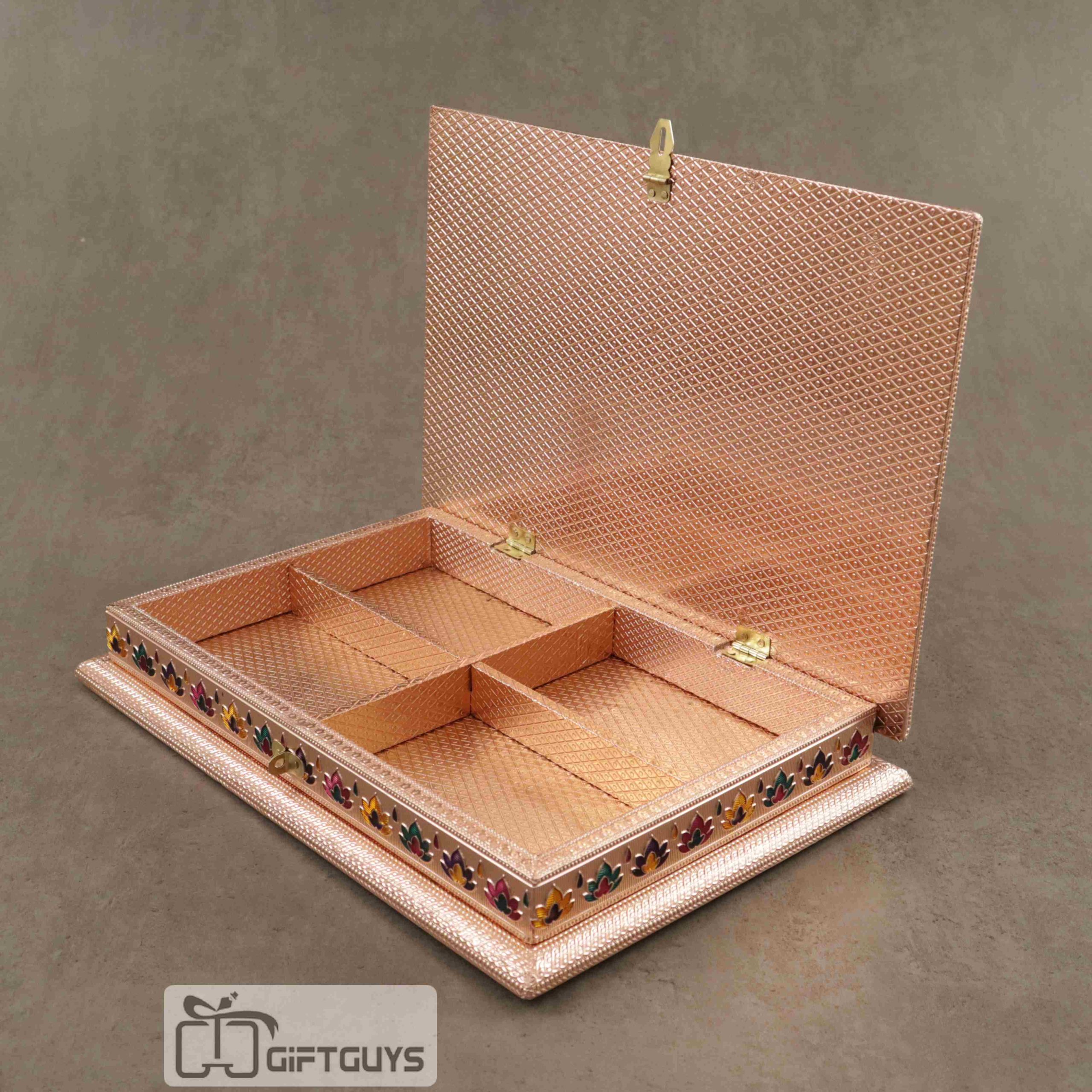 Celebrate tradition with this luxurious 13×9 Inch Floral Design Gift Box 🌸. Featuring intricate embossed floral Meenakari patterns and rich enamel detailing, this box opens to reveal 4 spacious compartments – ideal for dry fruits, sweets, or sacred items 🍬🪔. Its artistic finish and premium build make it perfect for weddings, festivals, or corporate gifting 💝.