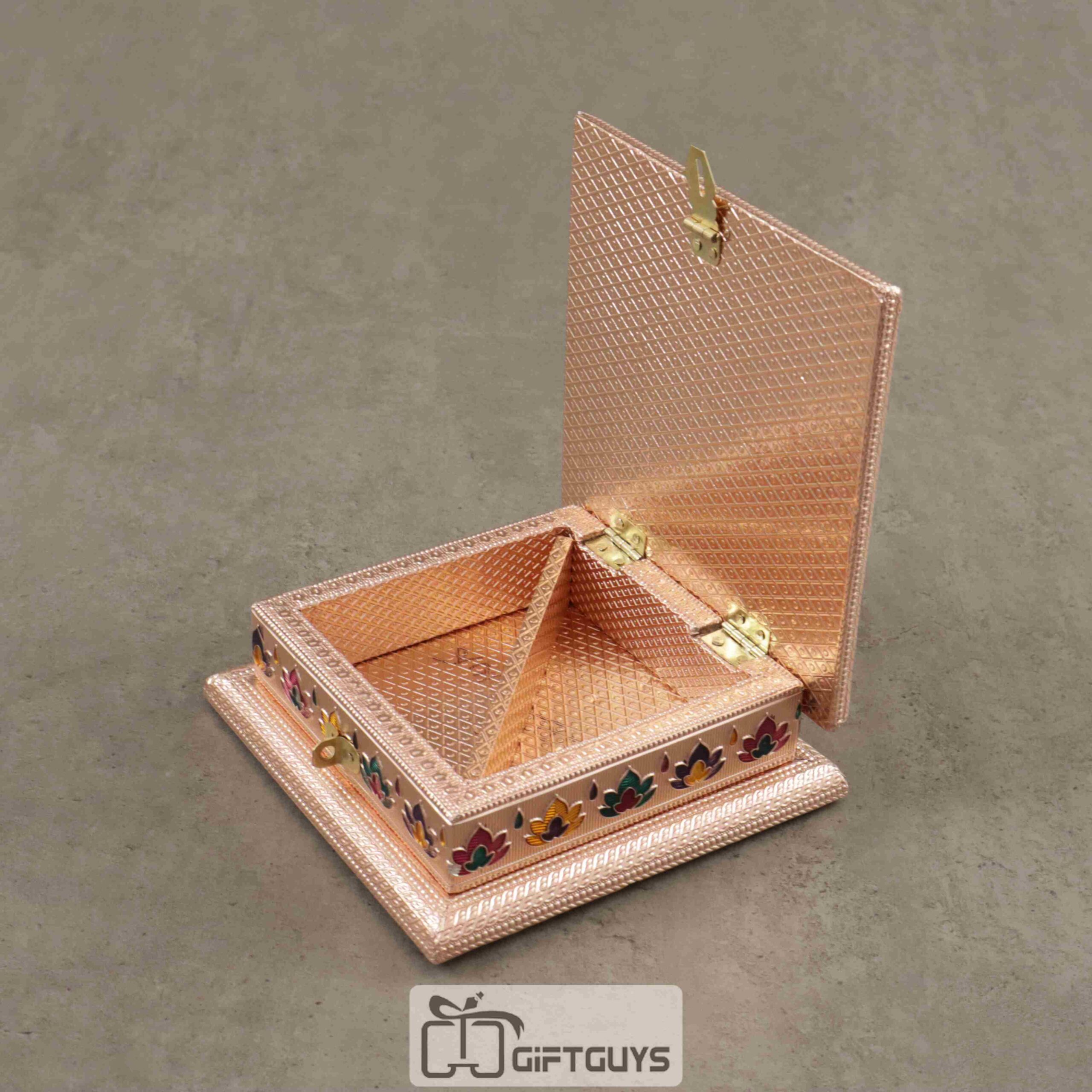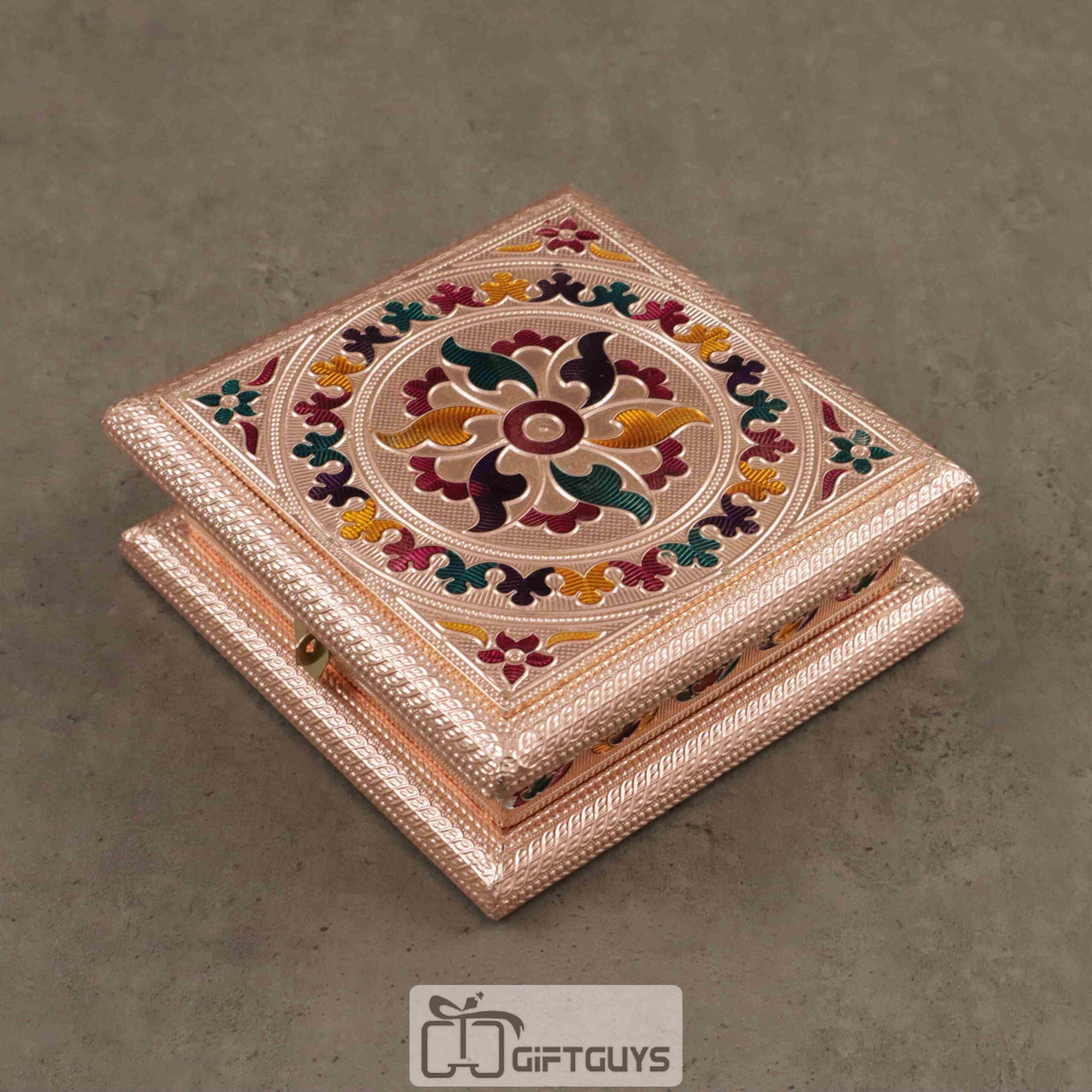 A Copper Meenakari dry fruit box with a floral design sounds like a beautiful and traditional piece of Indian craftsmanship. Meenakari is the art of decorating metal surfaces with colorful designs and patterns. A box of this kind would likely be intricately handcrafted, with vibrant enamel work depicting flowers or other intricate motifs.