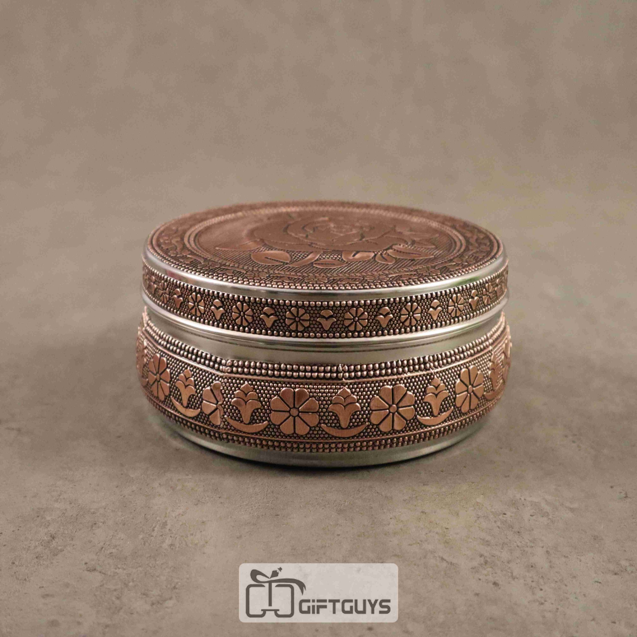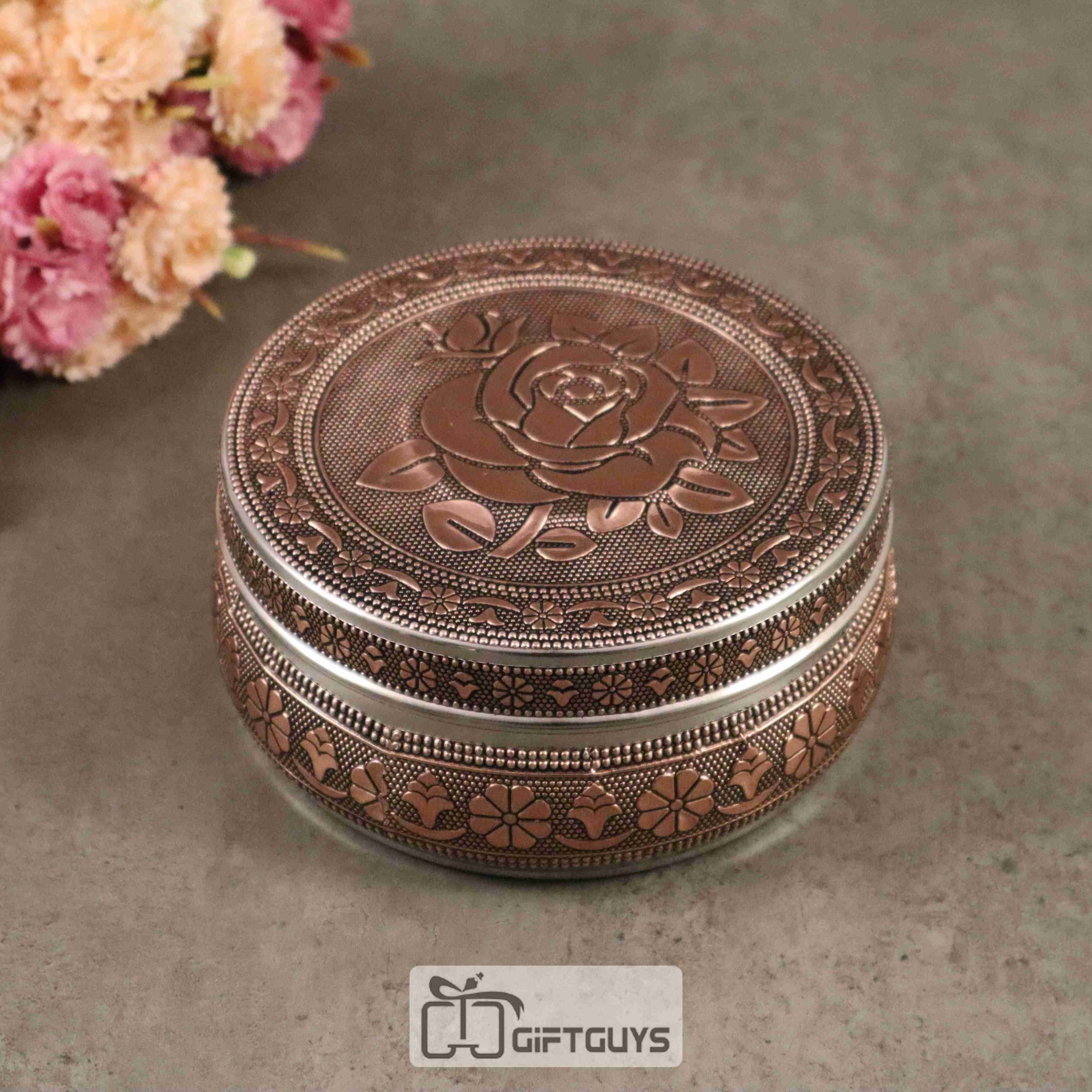 Elegant round copper-finish steel box with an embossed rose design. A perfect blend of utility and beauty for gifting and storage.