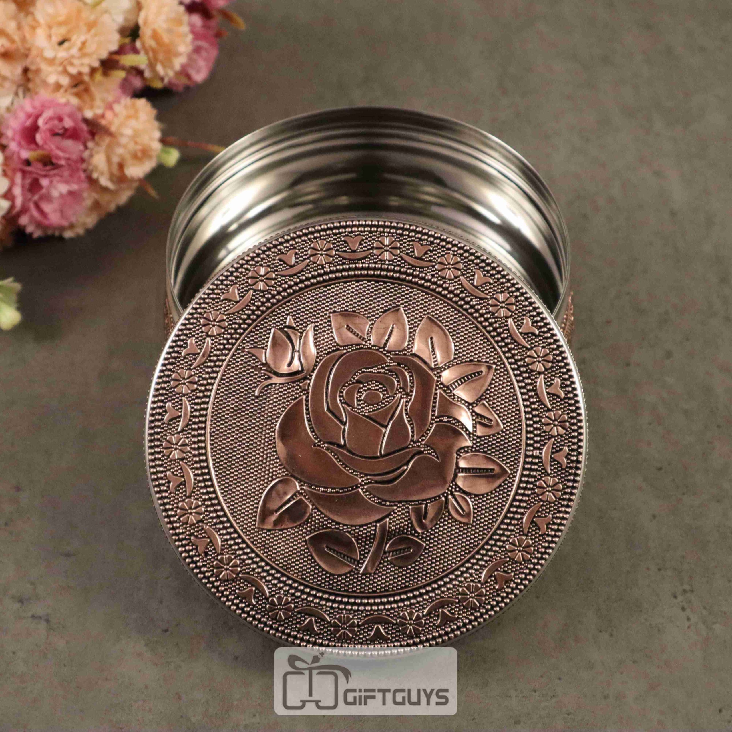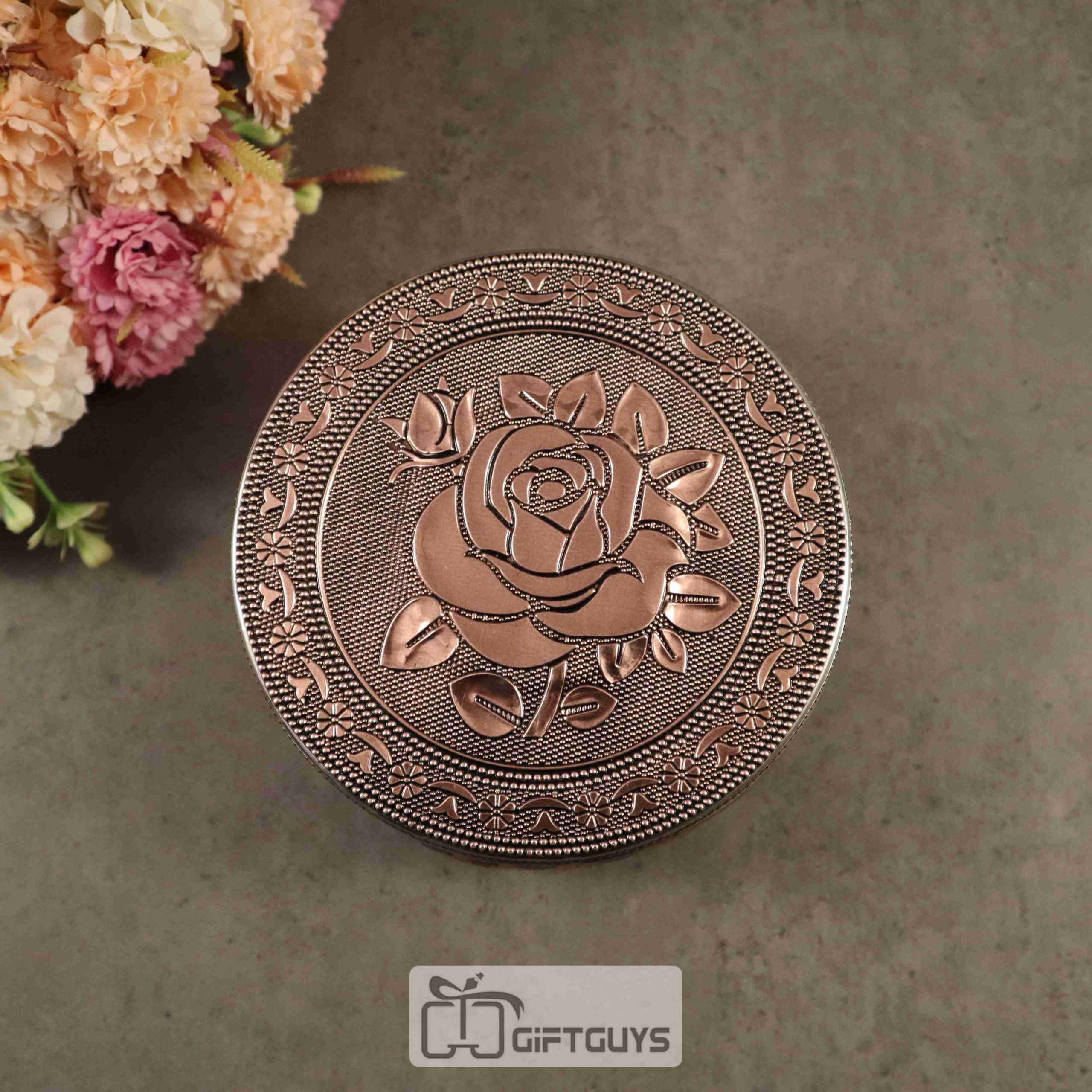 Copper Finish Rose Design Steel Box – Floral Gift Box for Pooja, Jewelry & Festive Return Gifts (5-Inch)