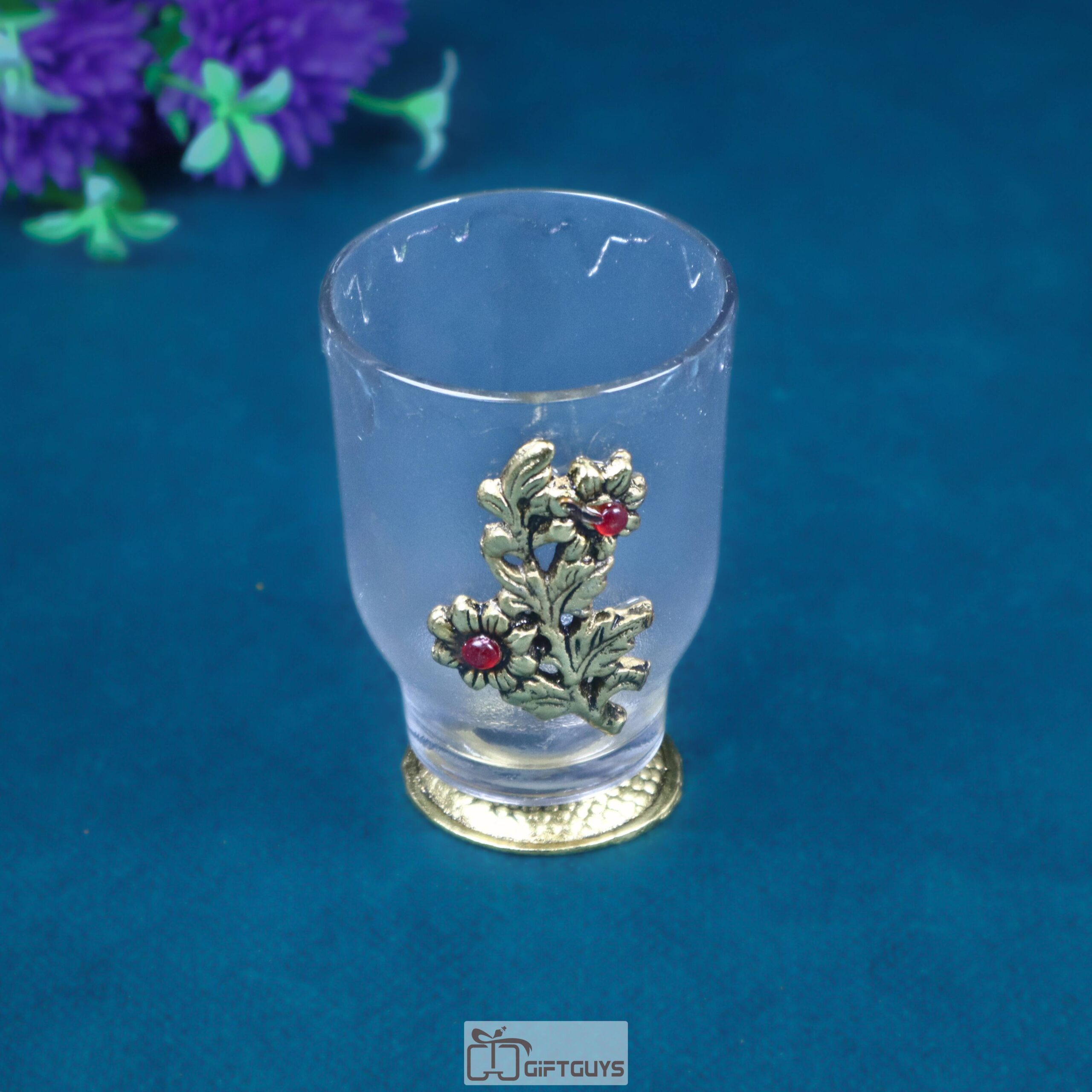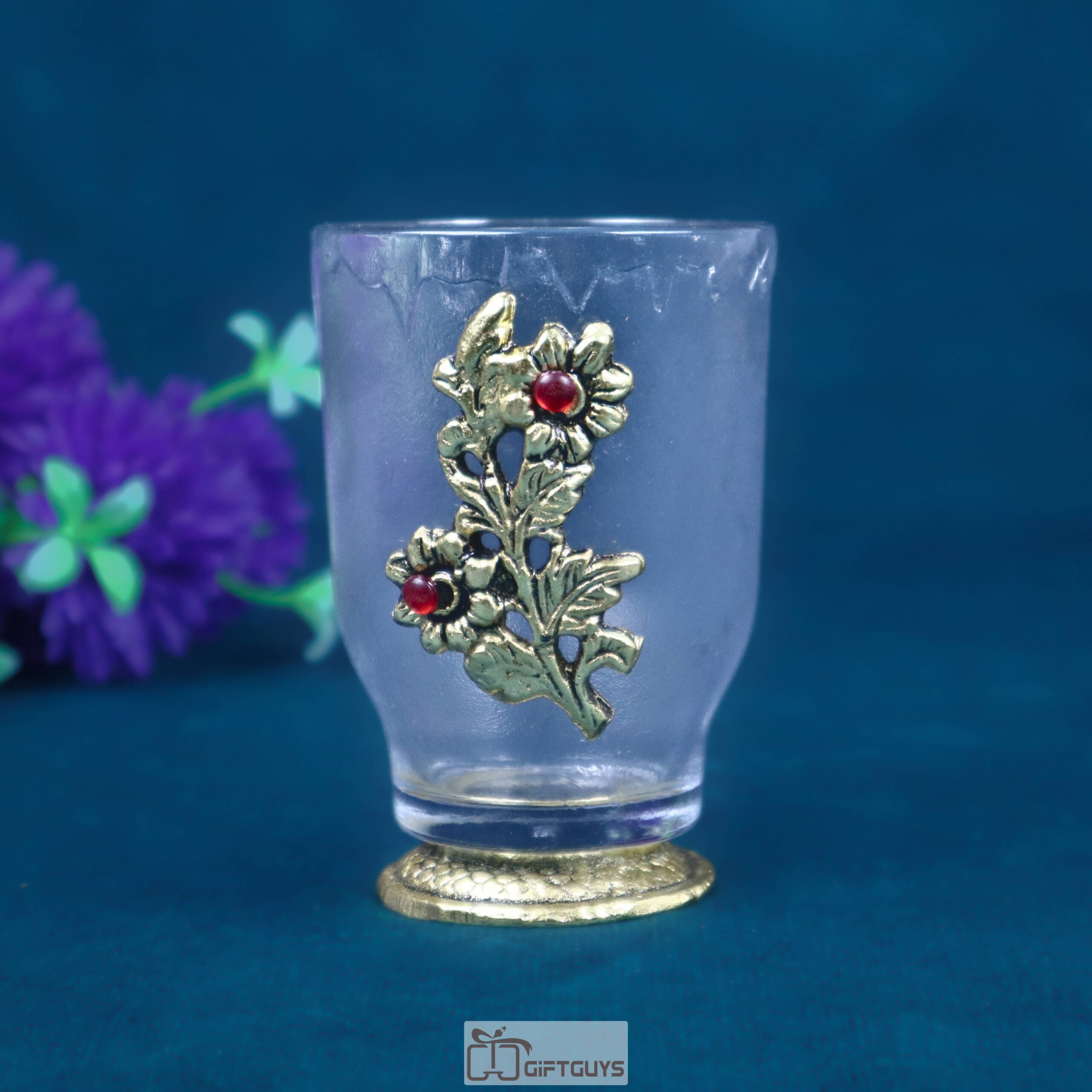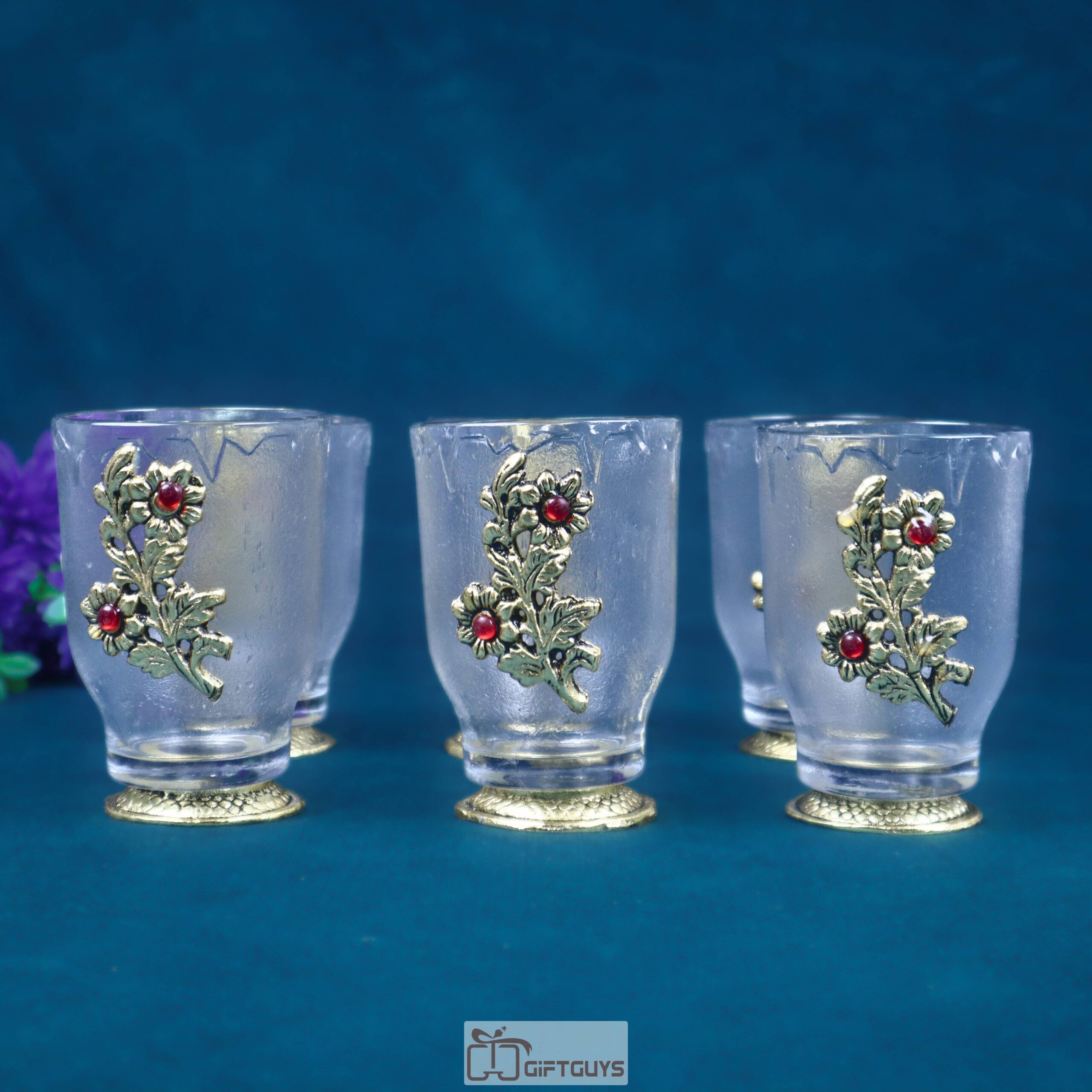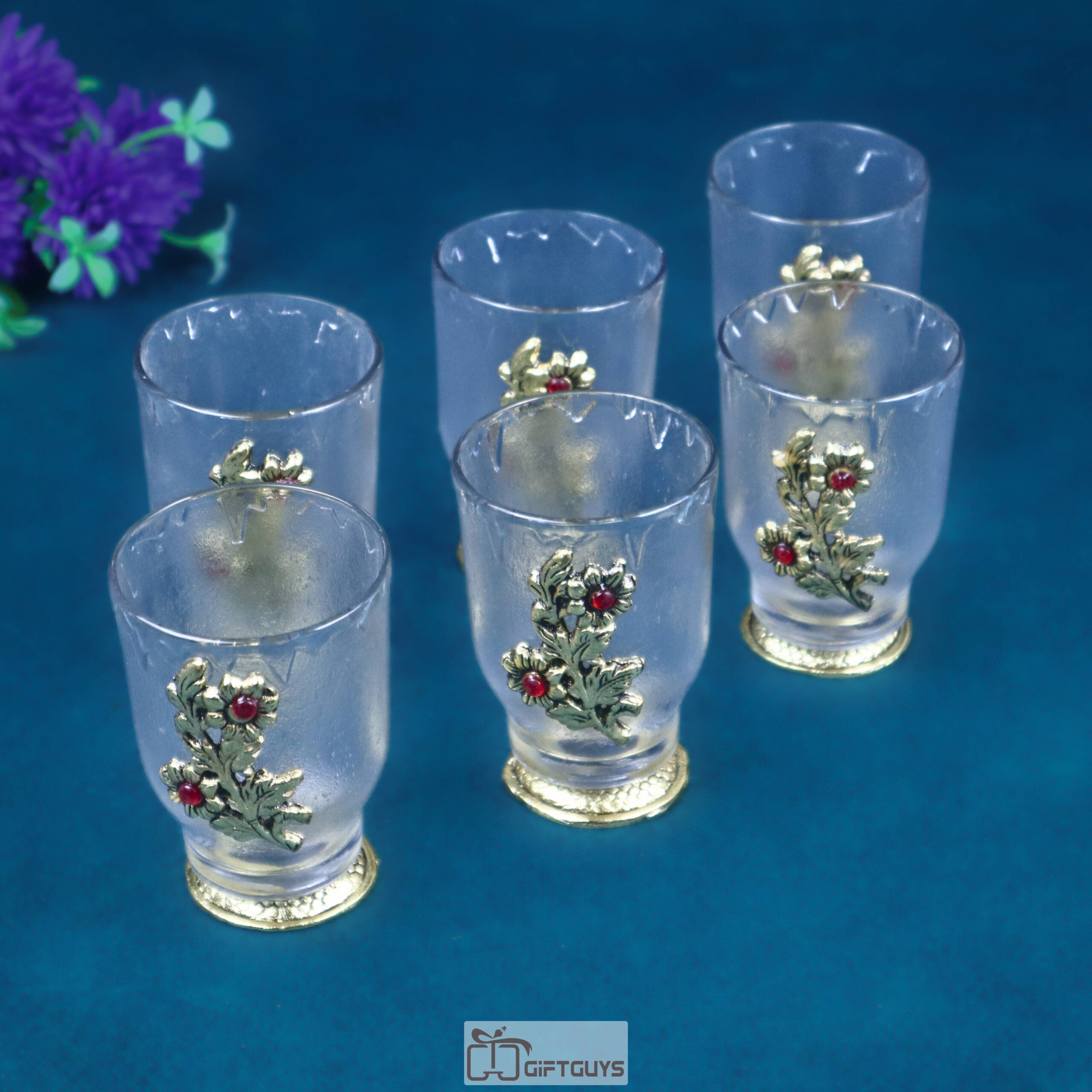 Add a touch of elegance to your drinkware collection with this set of six beautifully designed glass tumblers. Each tumbler measures 2.75×4 inches and has a sturdy feel, weighing 200 grams. The glasses feature a frosted finish and are adorned with a stylish golden floral motif with sparkling red accents, adding a luxurious touch to any occasion. Perfect for serving water, juice, or your favorite beverage, this set is ideal for entertaining guests or as a unique gift.