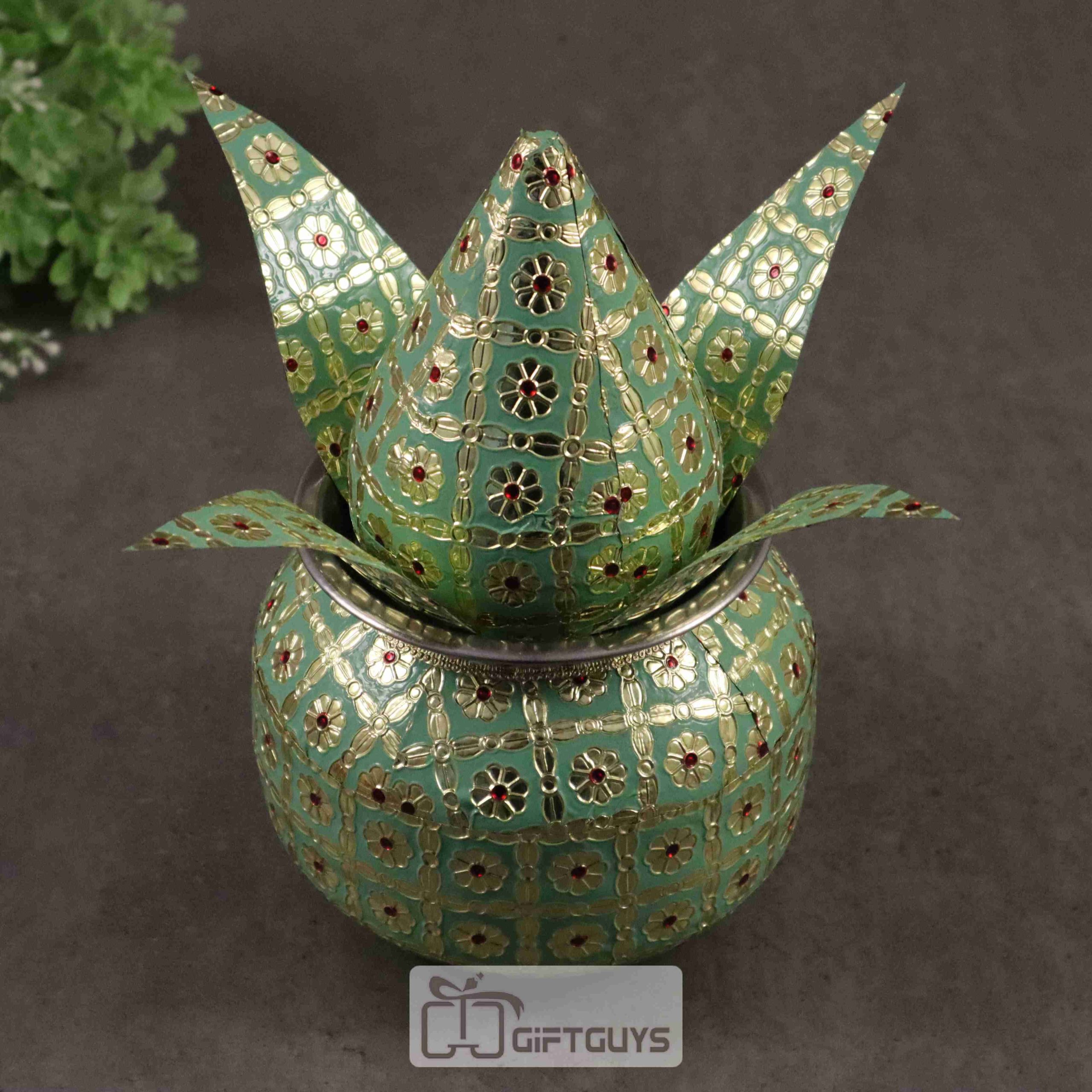 Meenakari Steel Kalash Decorative Pooja Showpiece – Green Gold Finish