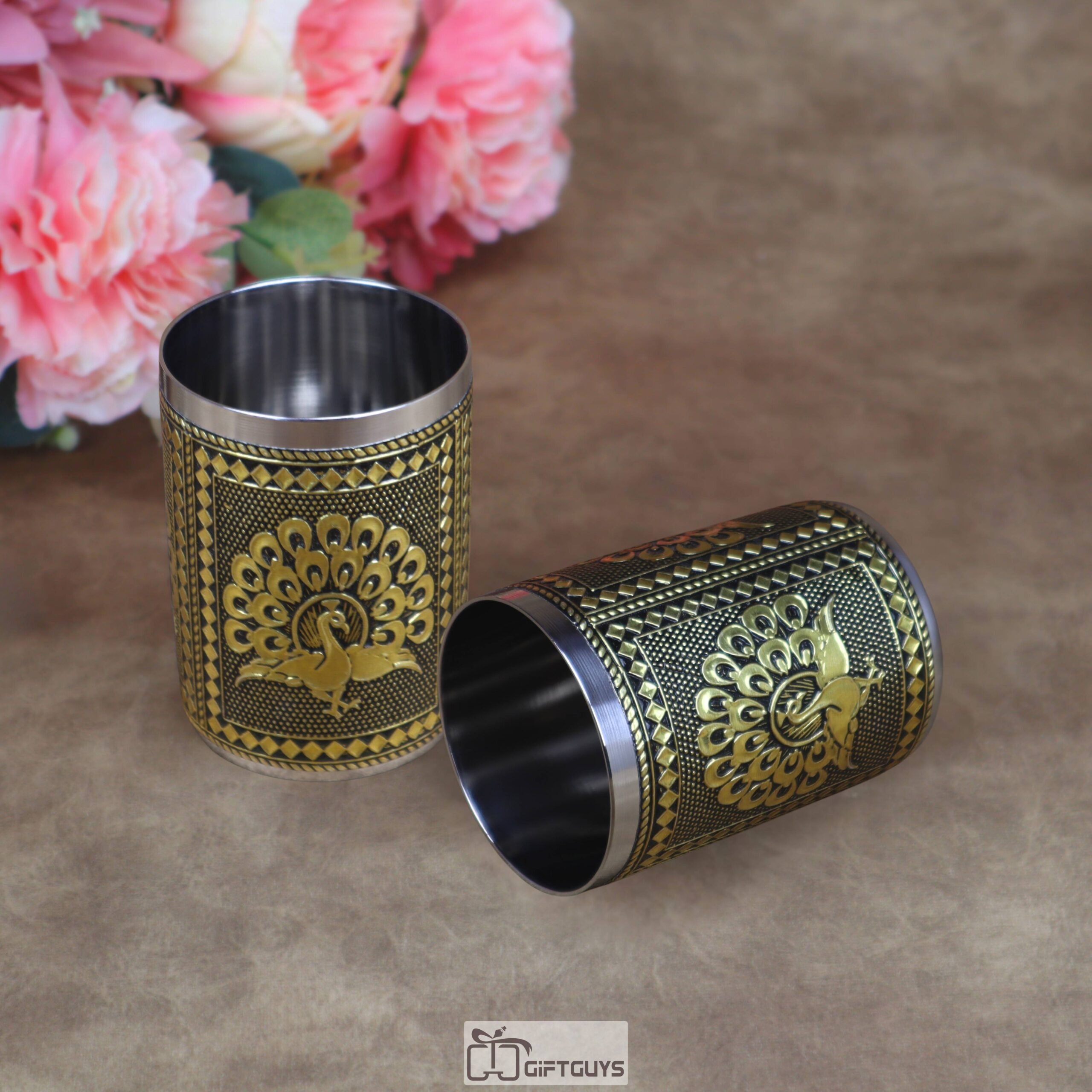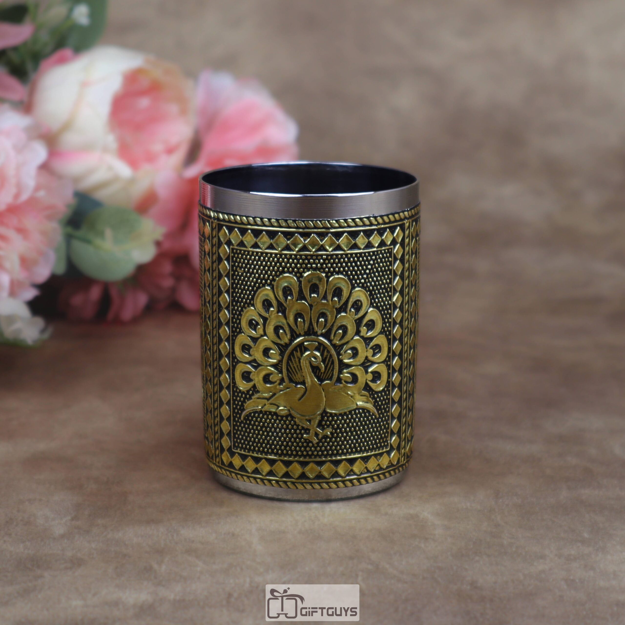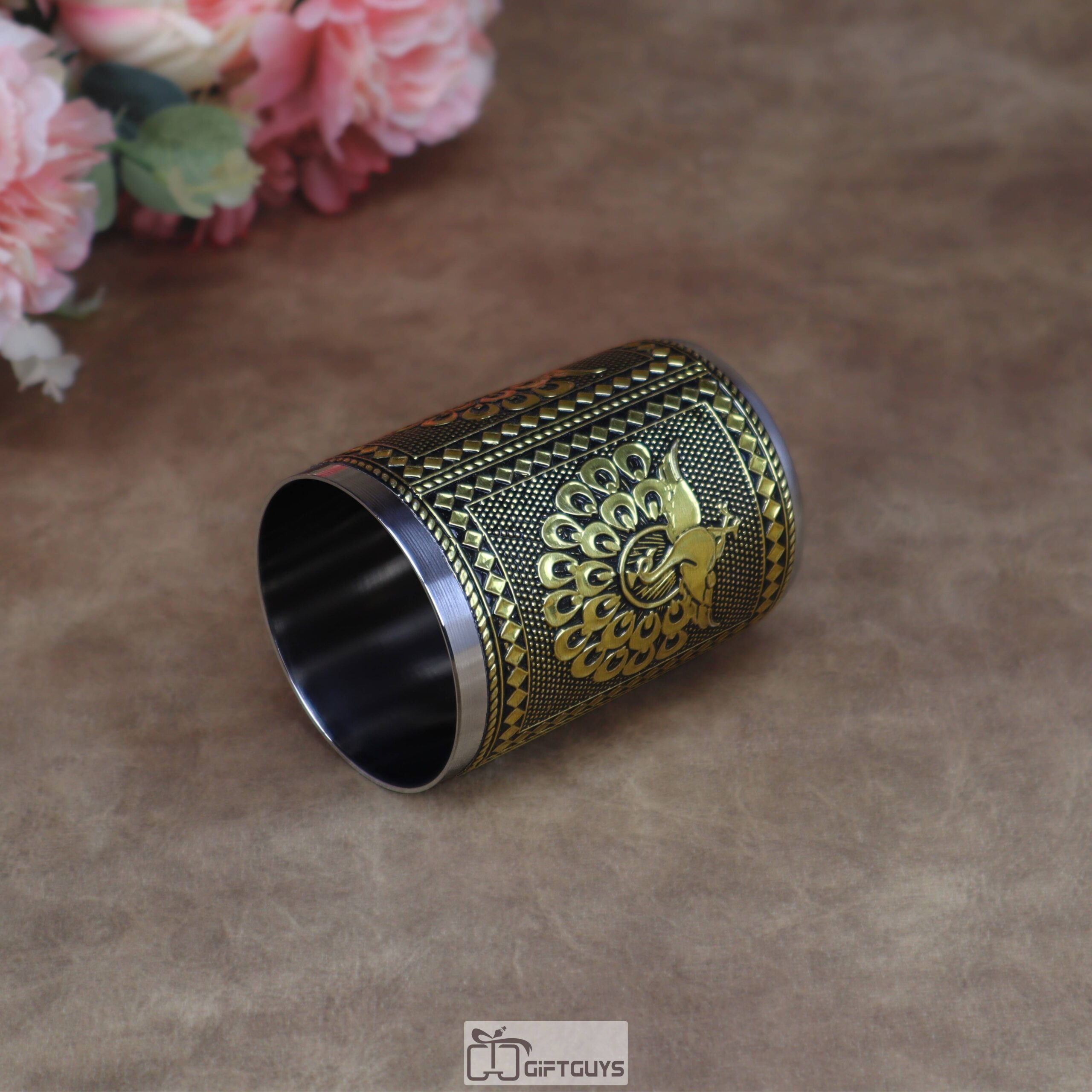 Stunning stainless steel glass with an intricately engraved peacock motif. With a 250 ml capacity and compact build (2.5″ diameter, 3.5″ height), it’s perfect for daily use or traditional gifting.