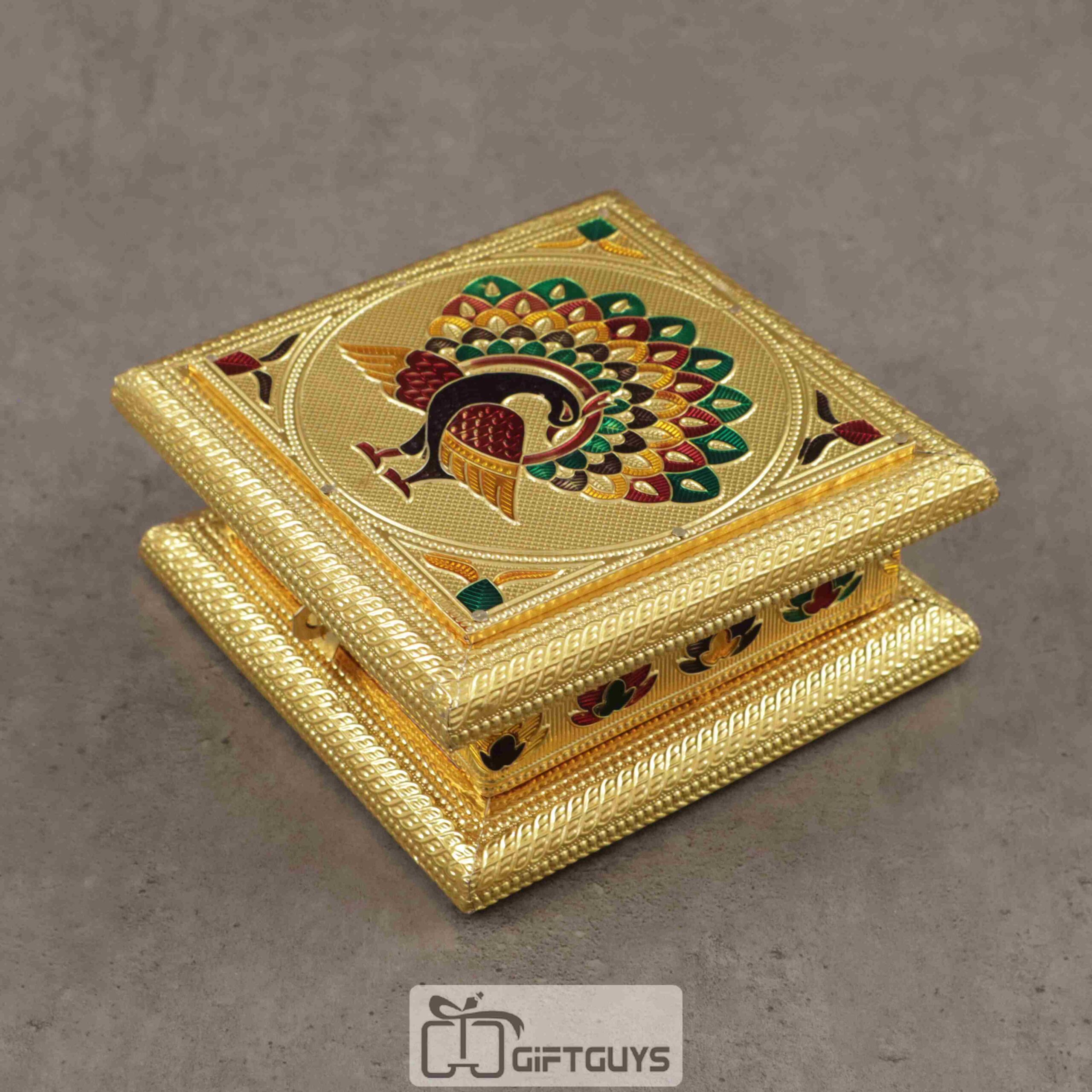 A 5×5 inch elegant peacock-themed dry fruit box ideal for gifting on festivals and weddings. Handmade design with rich traditional detailing.