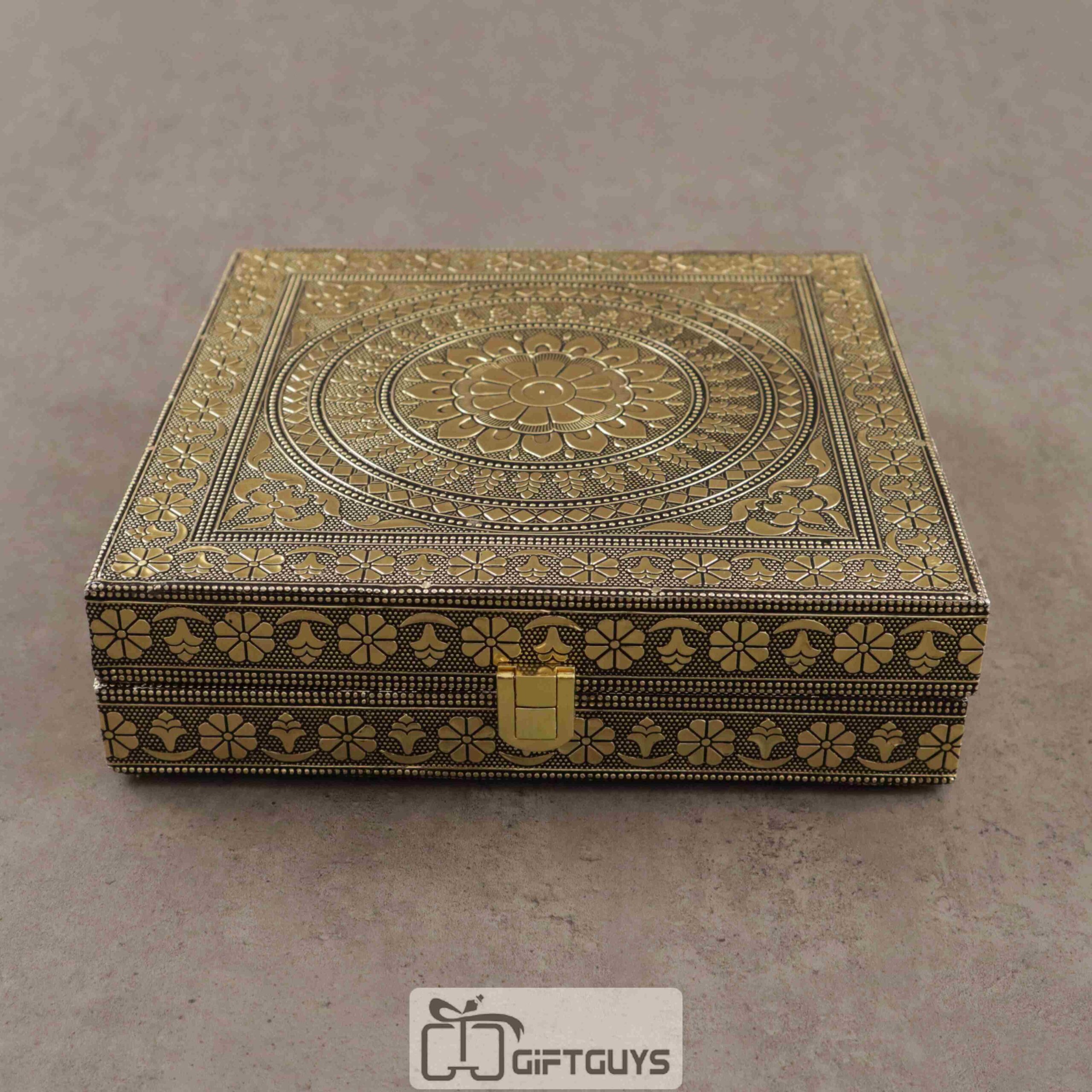 Add a touch of tradition and elegance to your vanity with this beautifully embossed oxidised jewelry box. Crafted with intricate floral and geometric patterns, this square box combines vintage charm with modern utility.