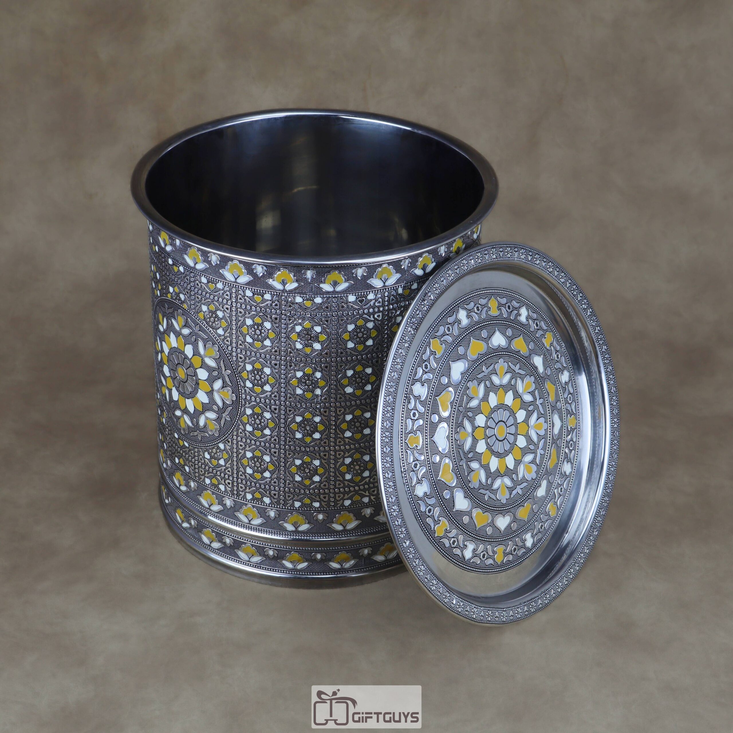 Large Meenakari Stainless Steel Storage Container with Lid | Traditional Yellow/White Enamel Dry Goods Dabba