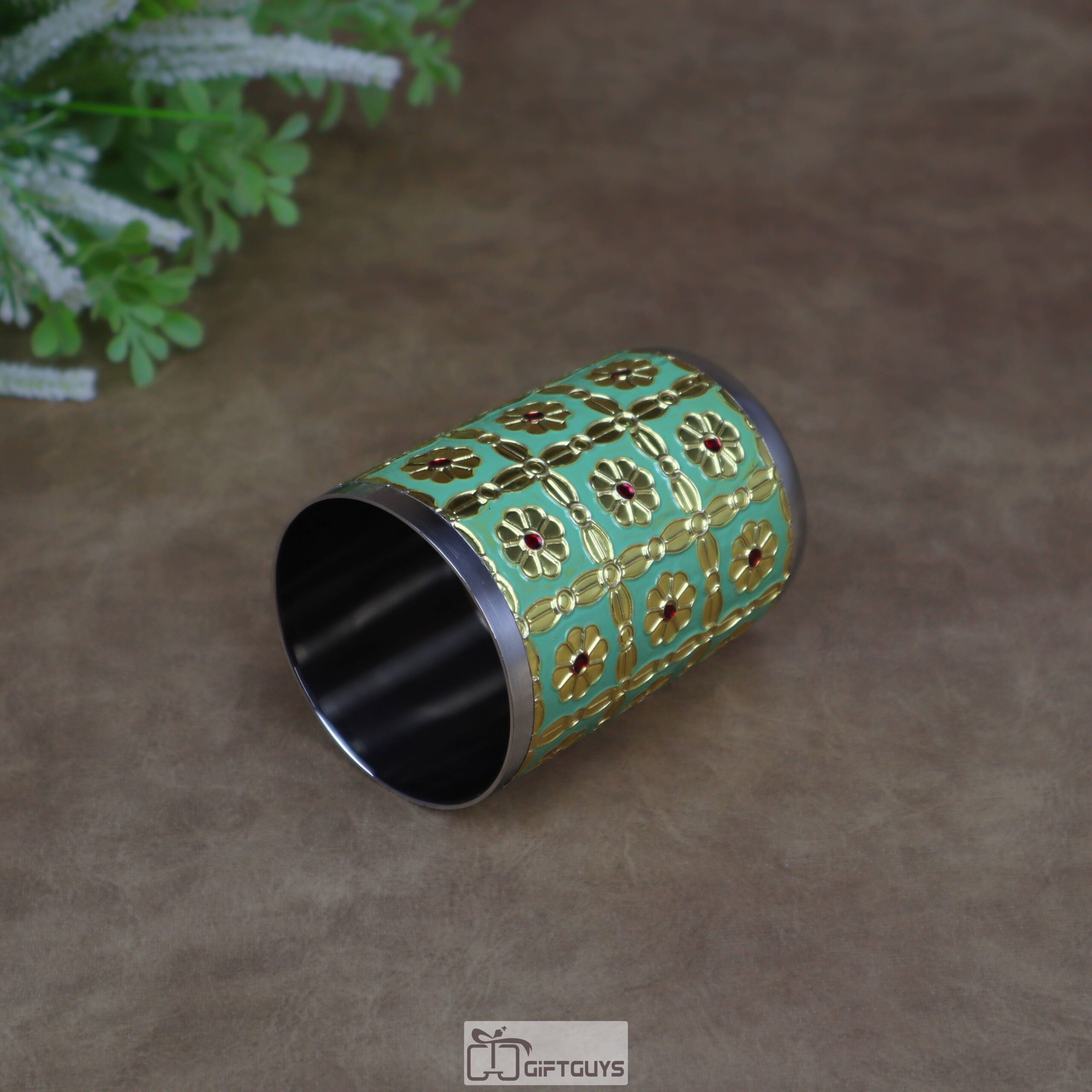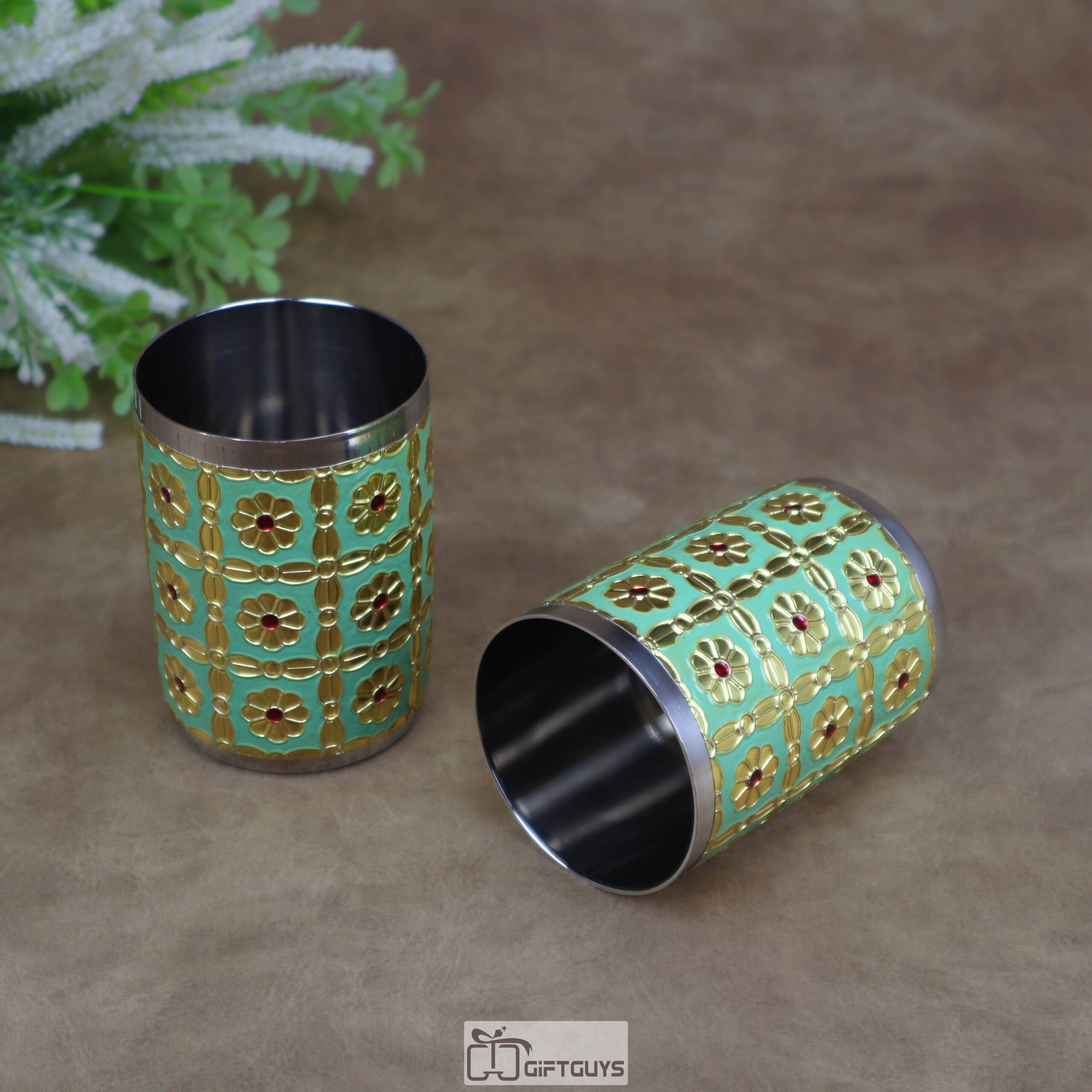 Beautiful stainless steel glass with green Meenakari enamel floral work. 250 ml capacity, 2.5″ diameter and 3.5″ height—perfect for everyday elegance or gifting
