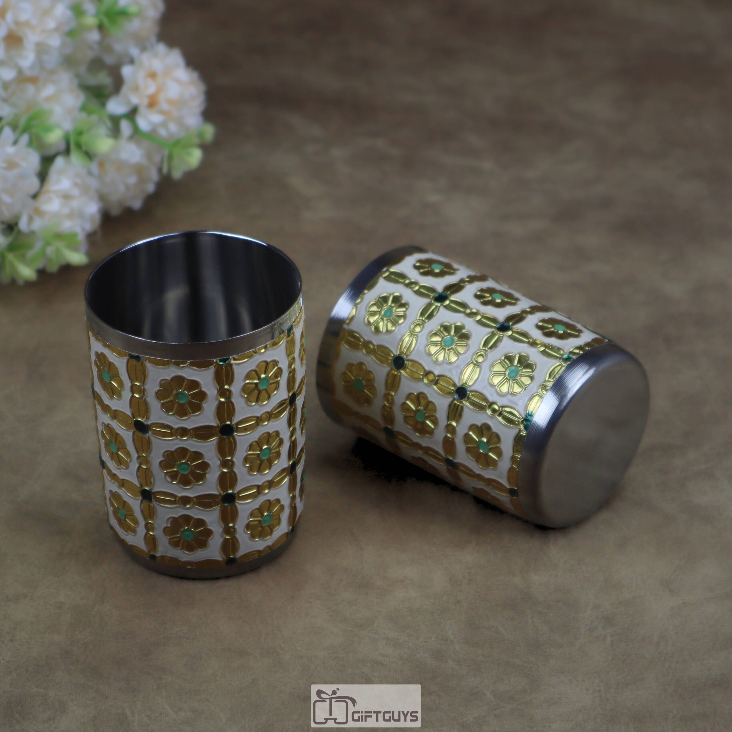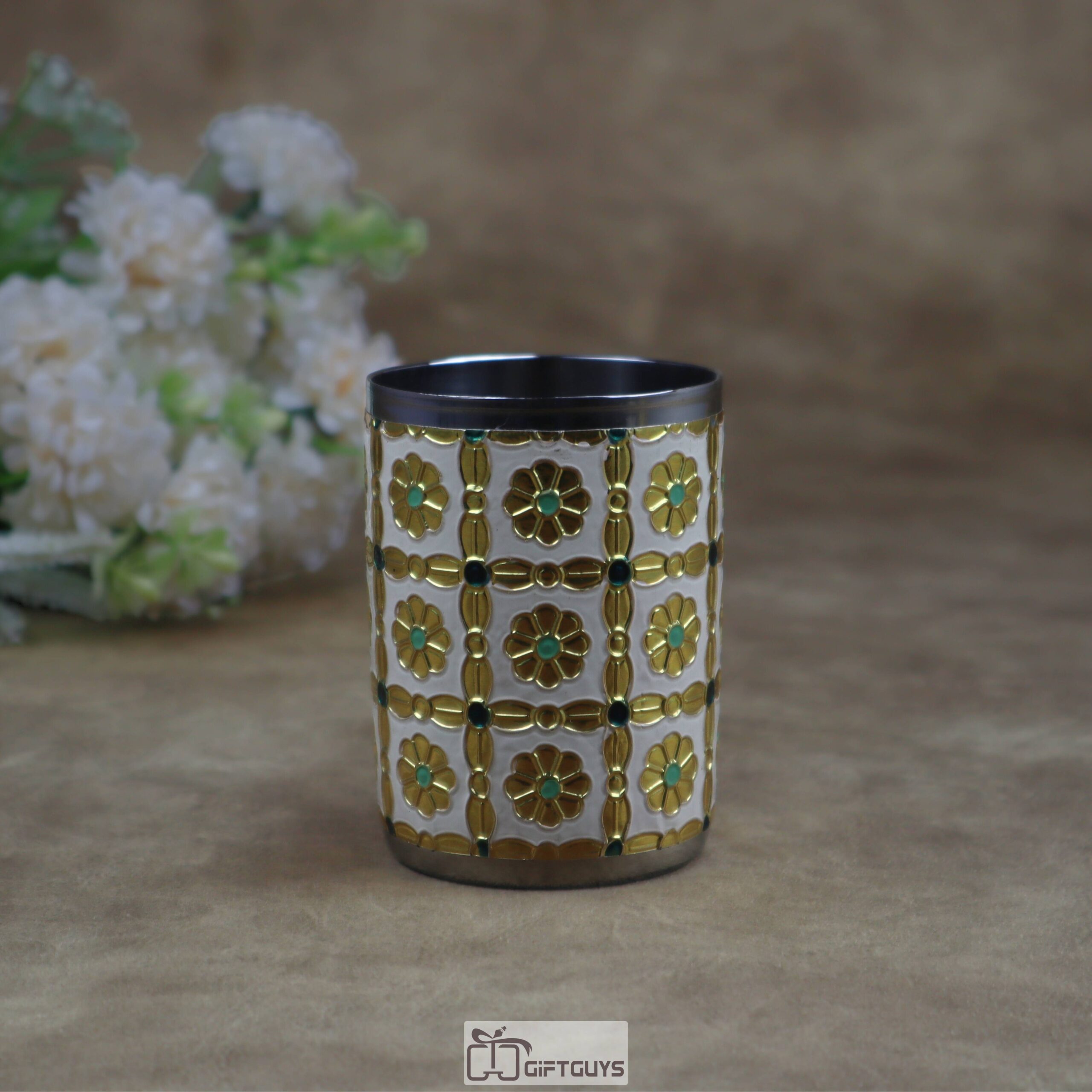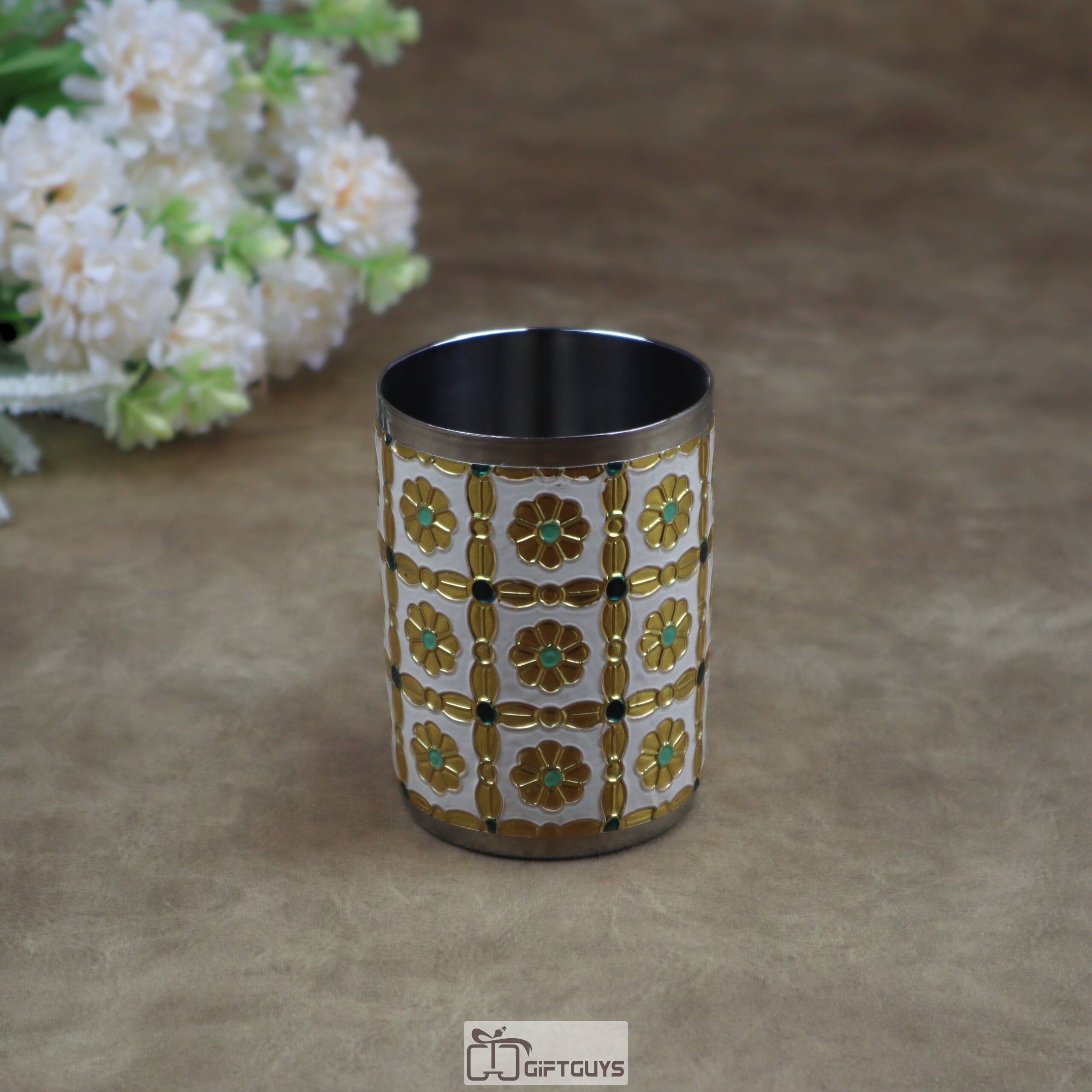 Elegant Meenakari-style stainless steel glass featuring intricate floral enamel work. With a 250 ml capacity and sleek size (2.5″ diameter, 3.5″ height), it’s perfect for traditional decor and gifting.