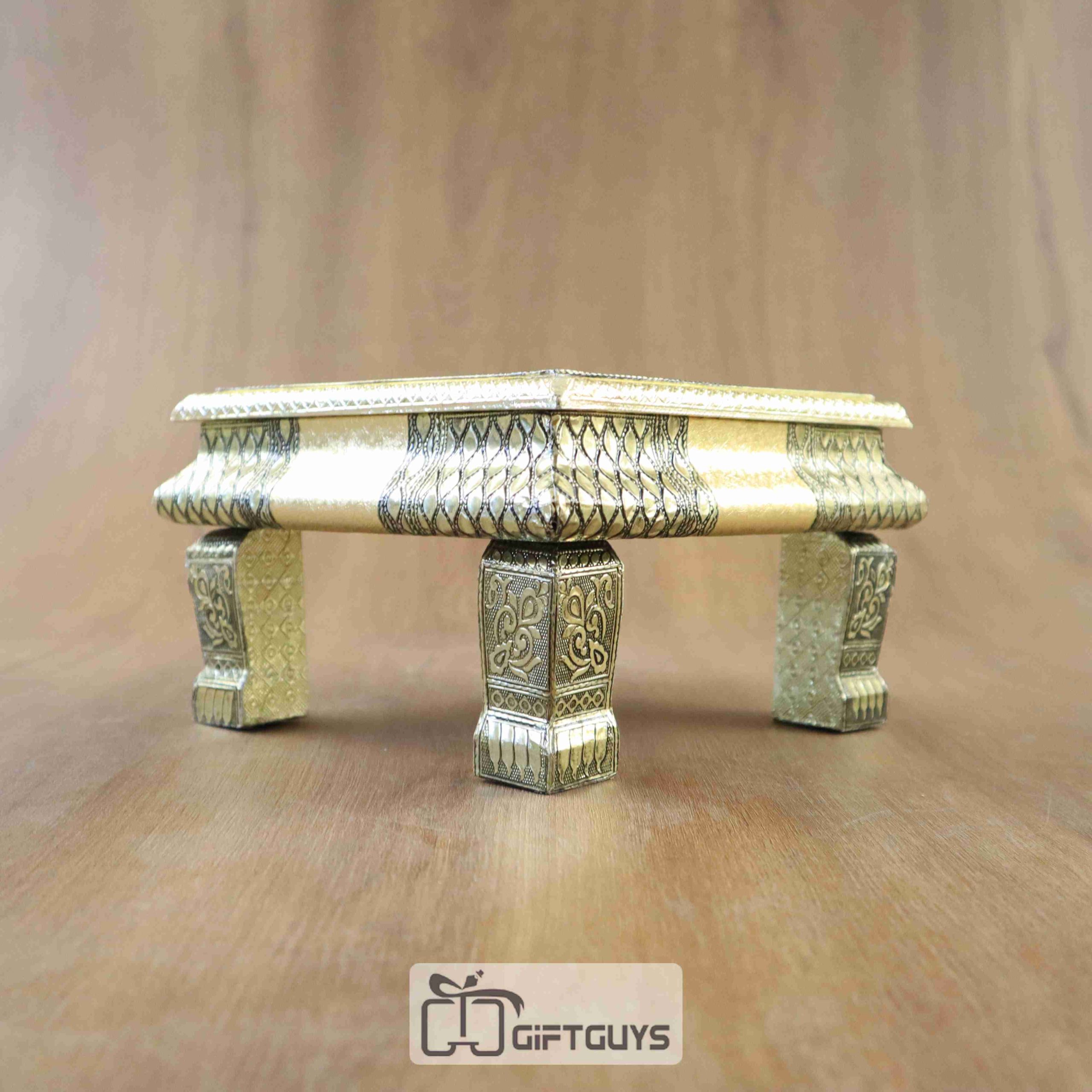 A Handcrafted Pooja Chowki (Bajoth) is a traditional, intricately designed platform used during religious ceremonies in Hindu households. Made from high-quality wood, metal, or a combination of both, the chowki is skillfully carved with detailed patterns, often featuring motifs like floral designs, peacocks, or spiritual symbols. It is typically used to place idols, offerings, or puja items during prayers. The Bajoth is often adorned with brass, copper, or decorative stone accents to enhance its visual appeal. This handcrafted piece serves both a functional and aesthetic purpose, adding an elegant touch to the spiritual ambiance of the home or temple.