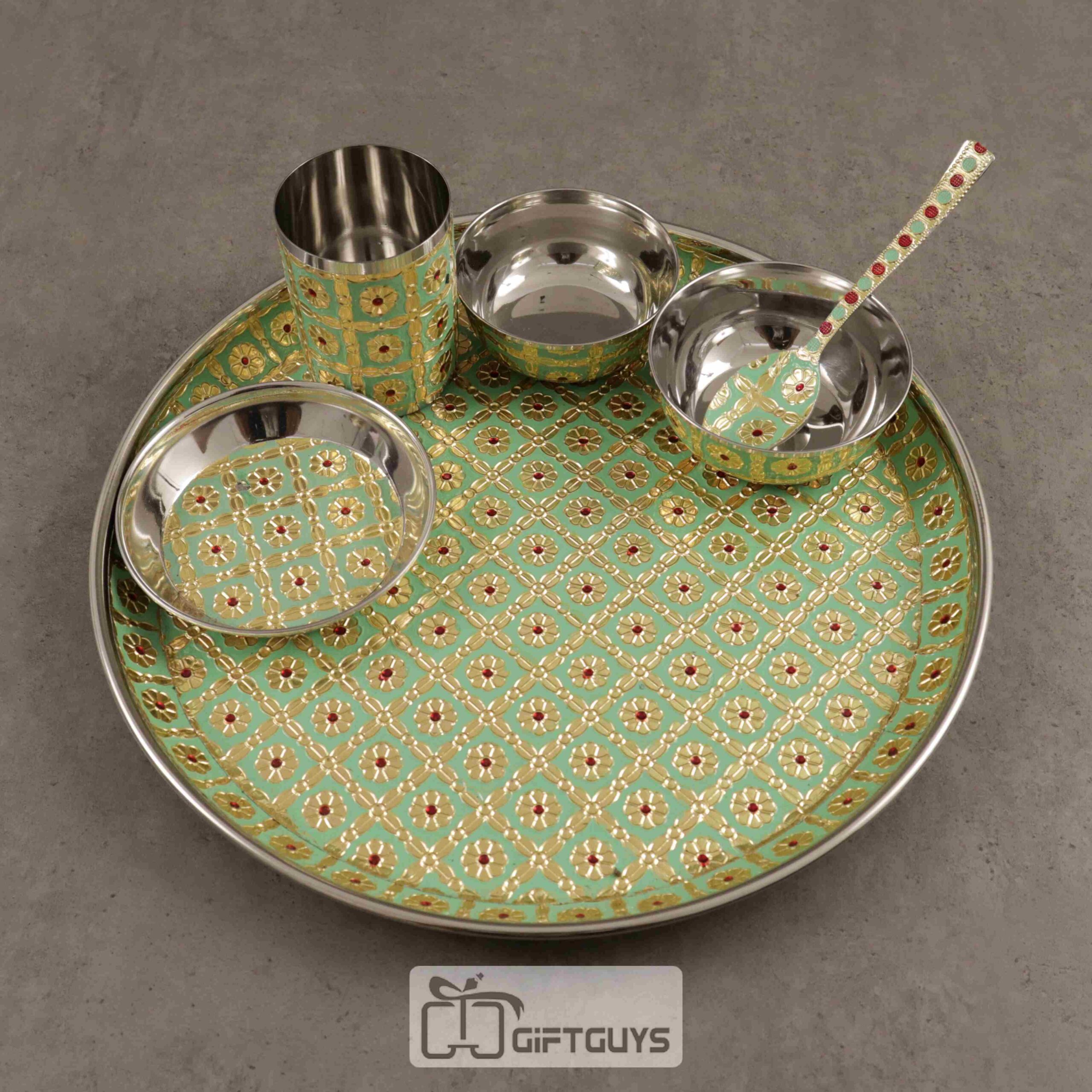 Meenakari art involves the intricate application of colorful enamel onto metal surfaces, resulting in vibrant and detailed designs. The light green color adds a sense of freshness and vitality to the Thali set, creating a visually appealing contrast against the metal surface.