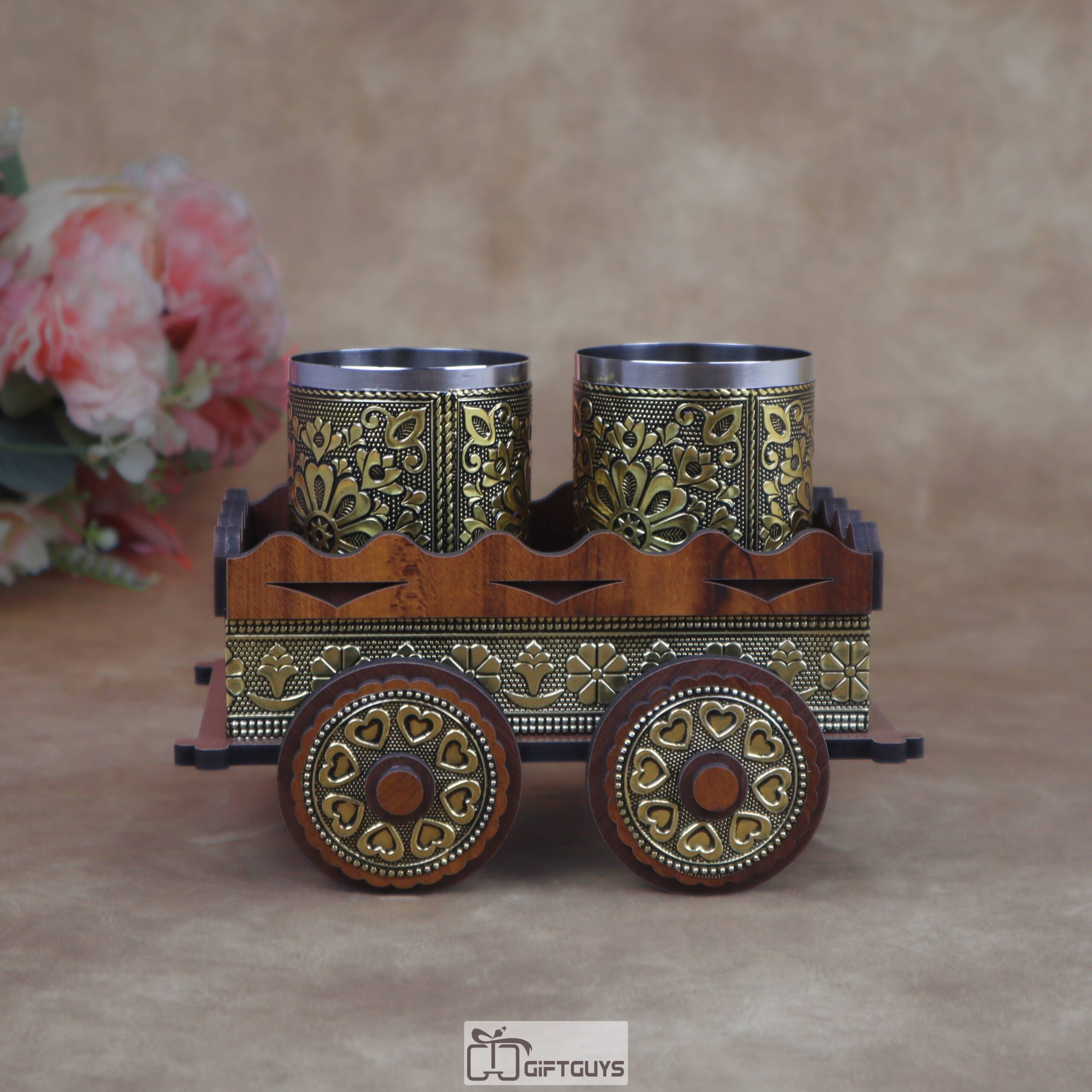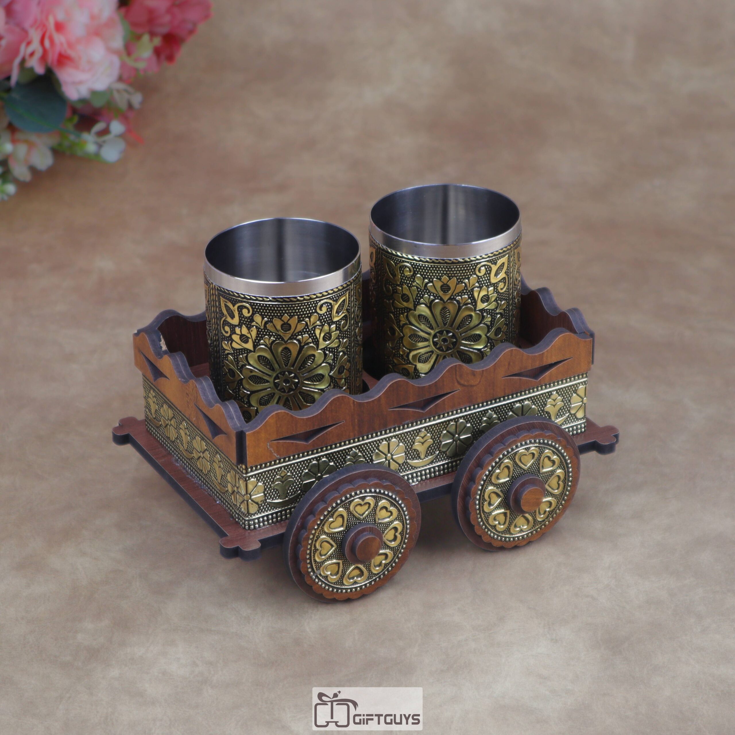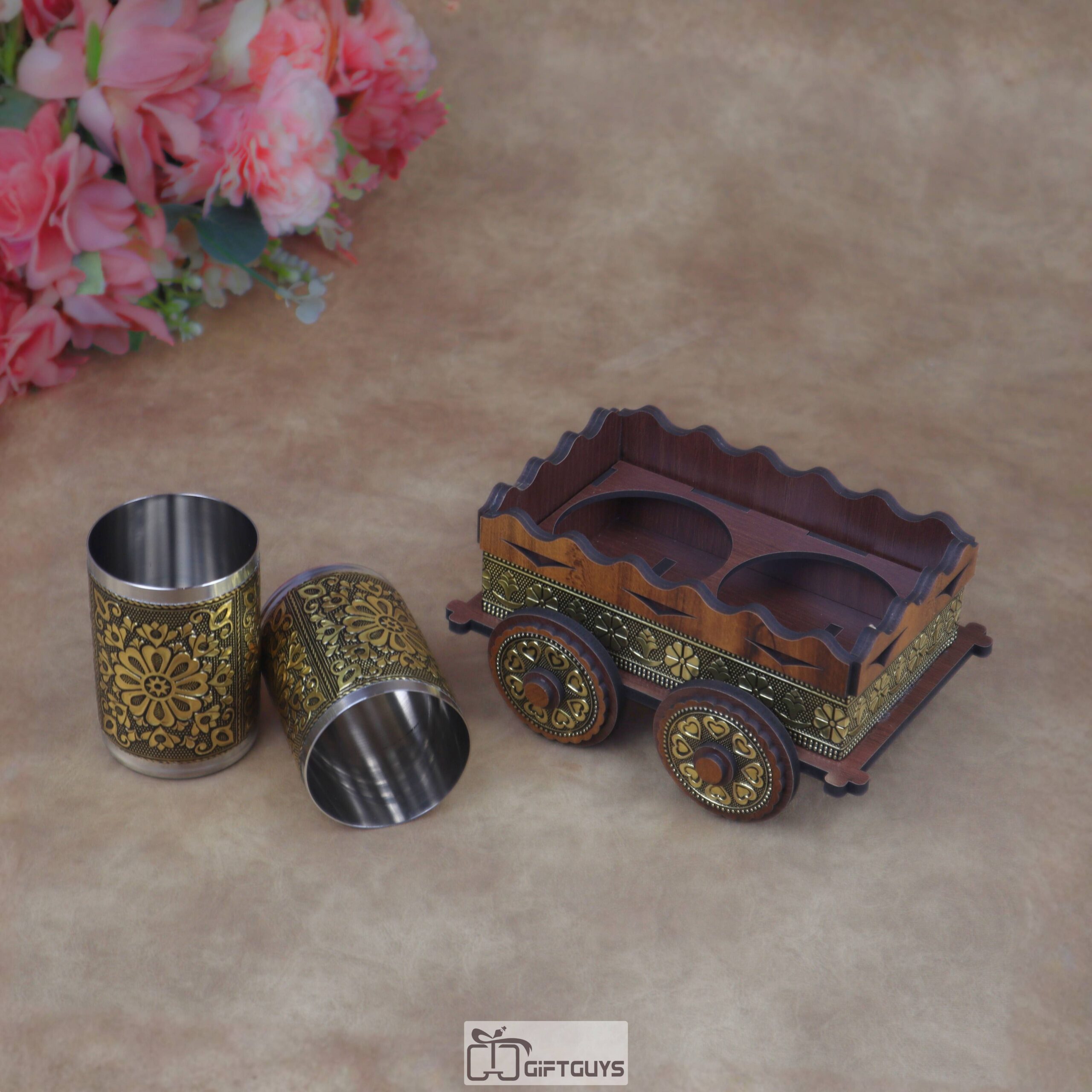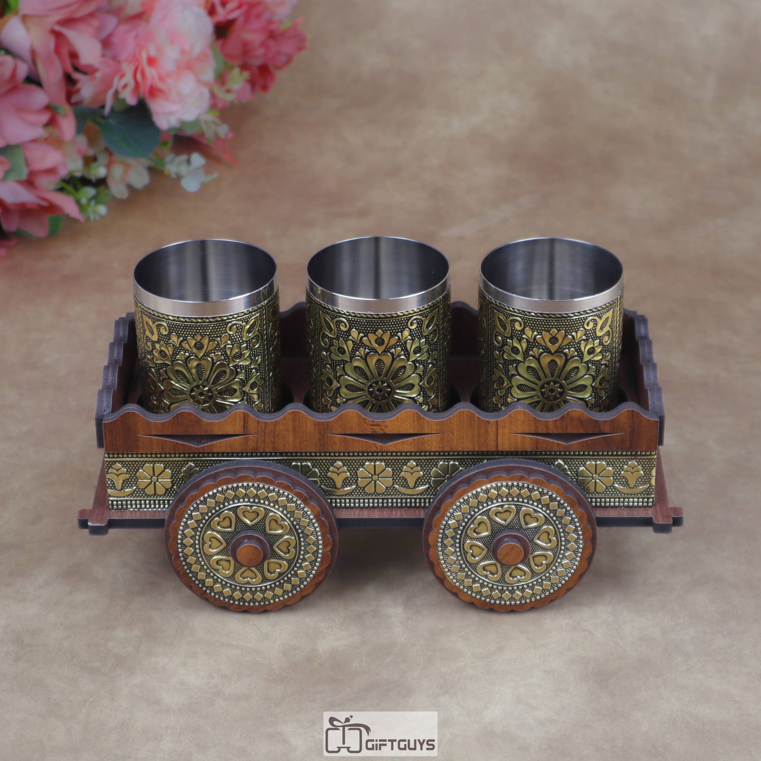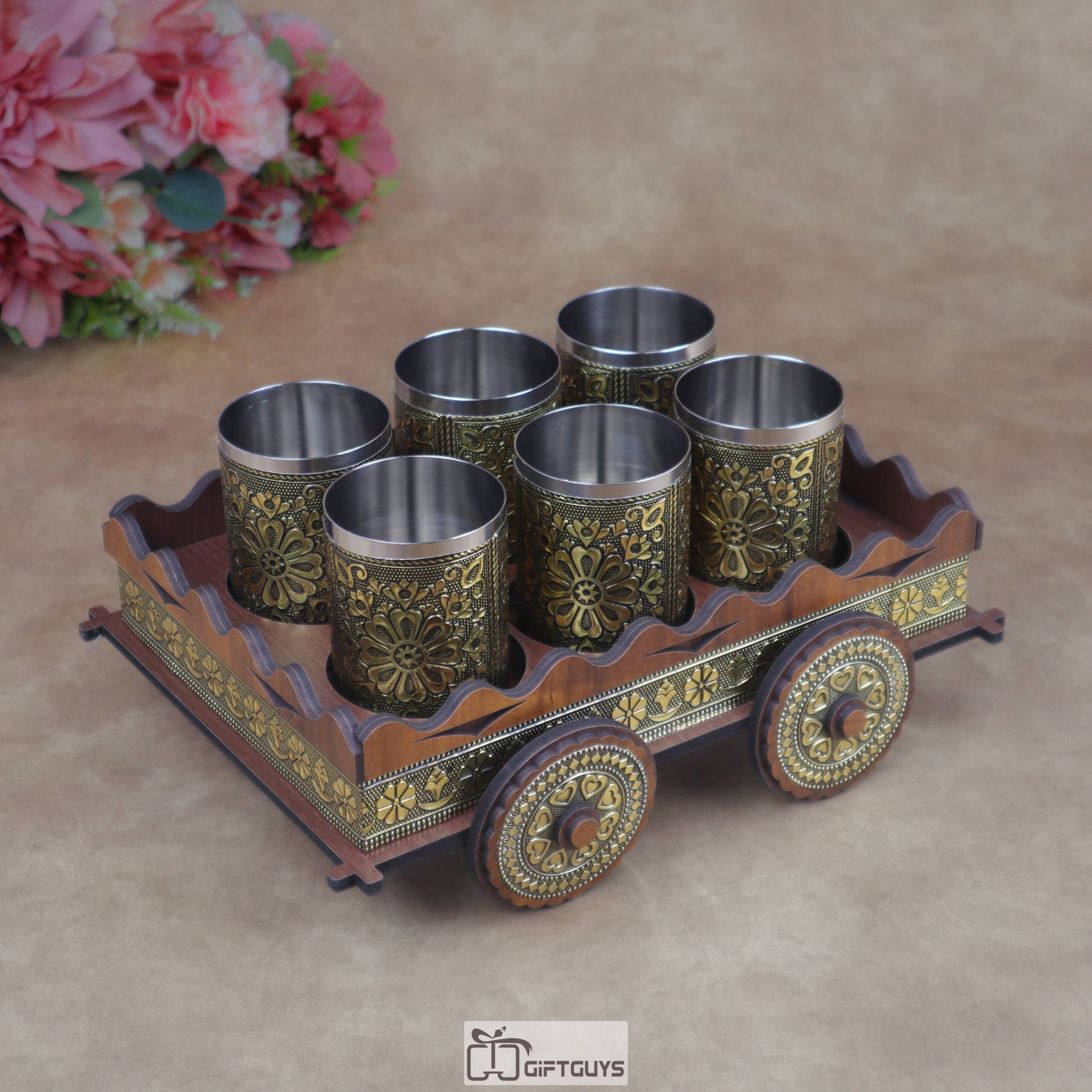 Regal Finish: ✨ This set features a unique oxidized bronze/gold look on both the wooden cart detailing and the six stainless steel tumblers, giving it a rich, antique appeal.