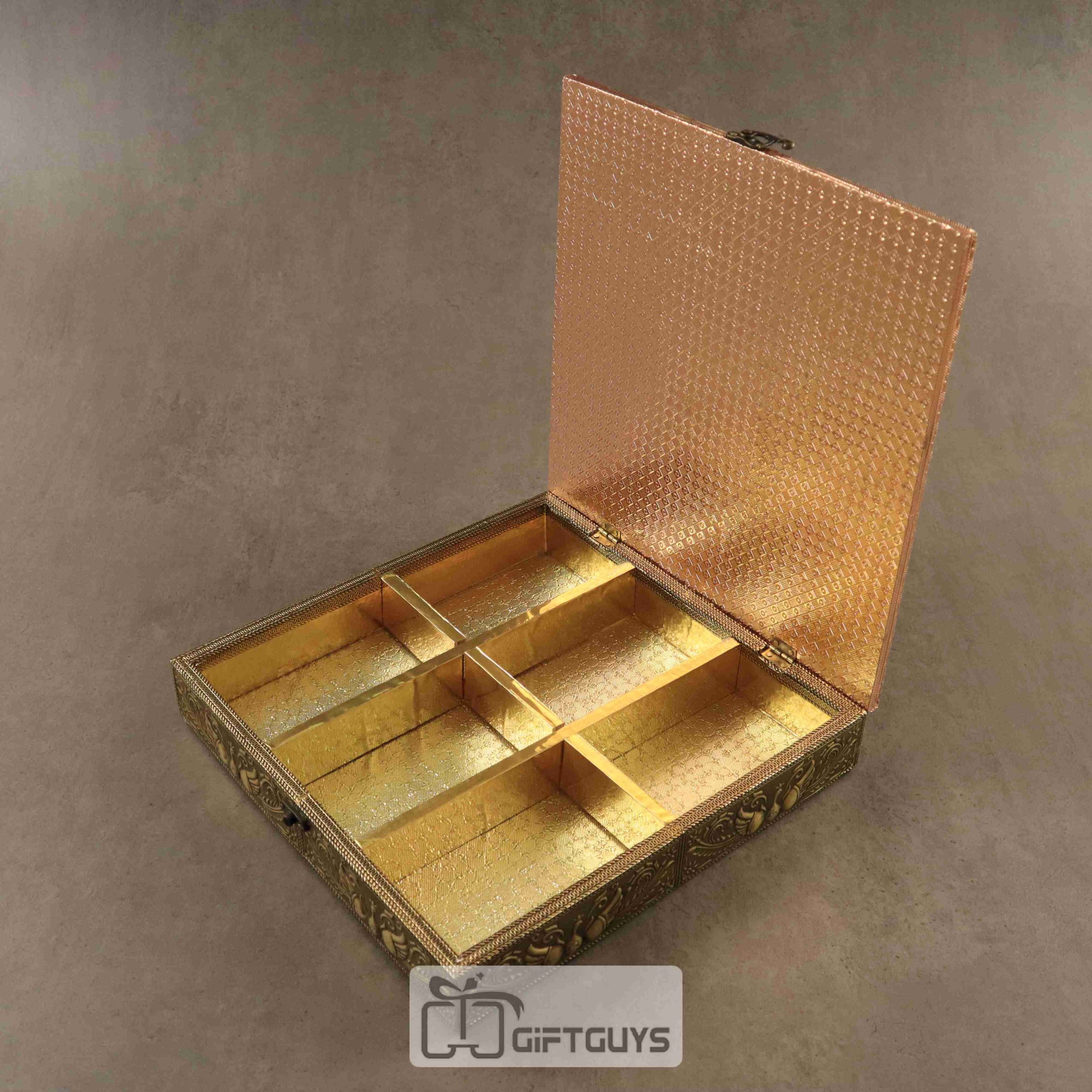 Royal embossed peacock design oxidised box with 6 sections, perfect for elegant gifting or festive use.