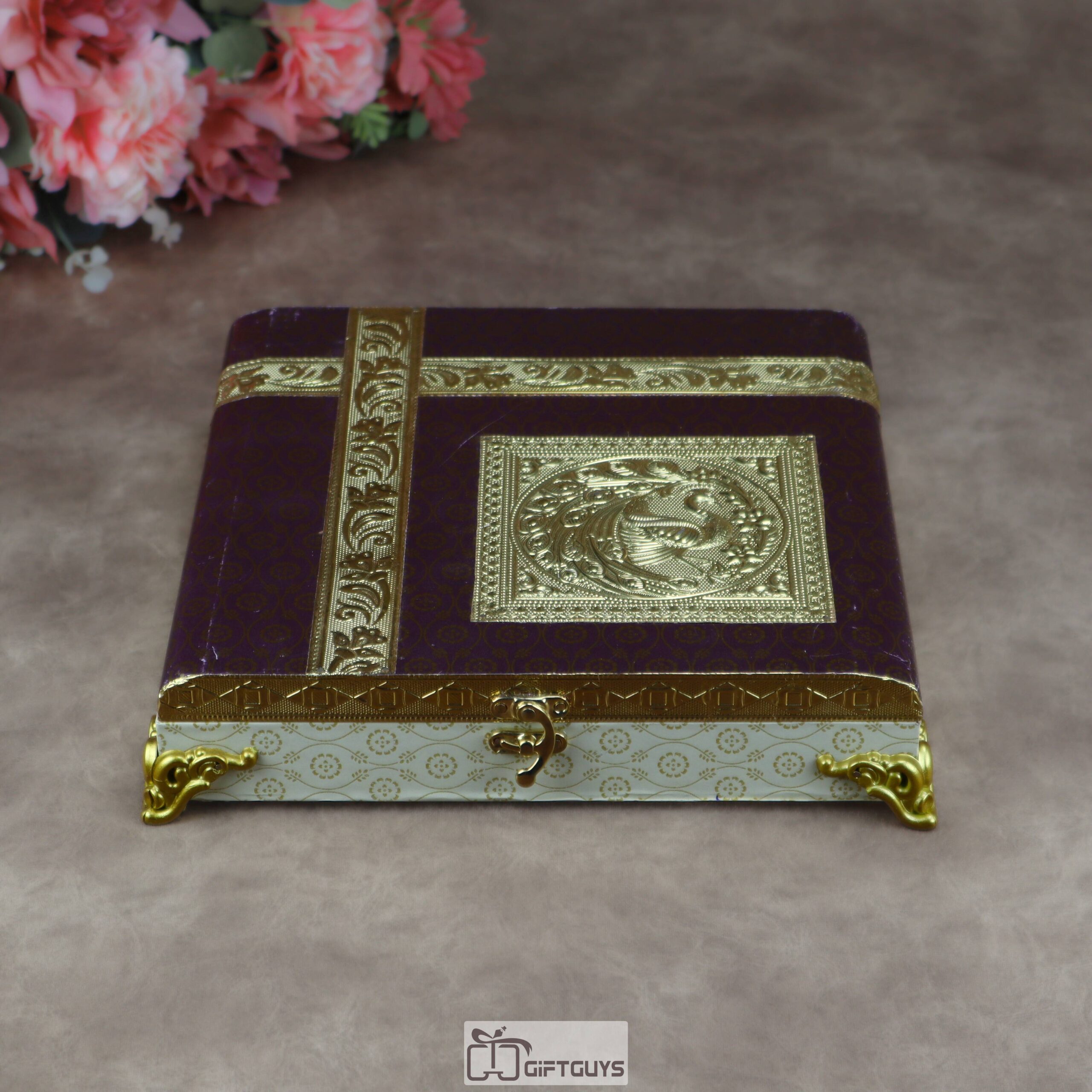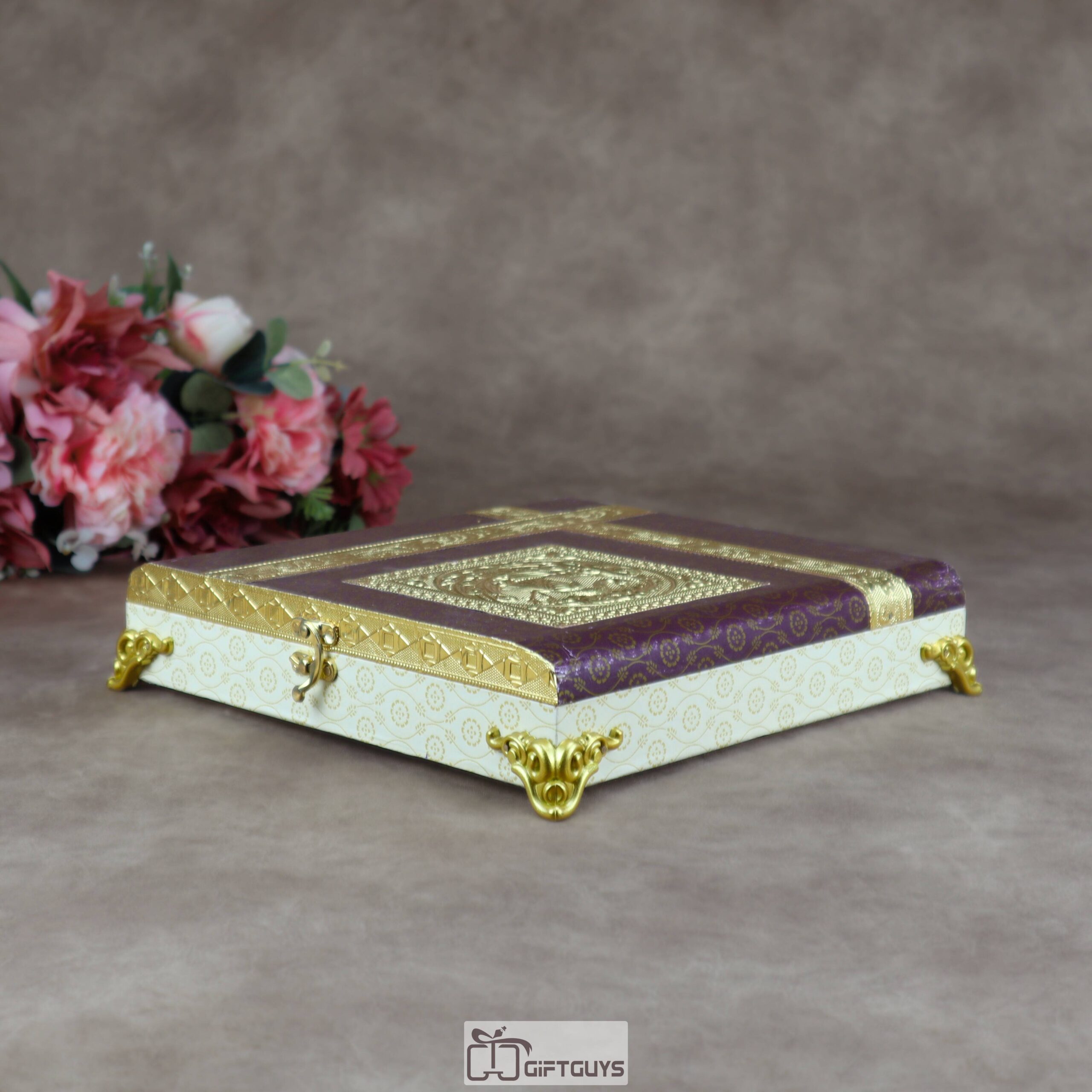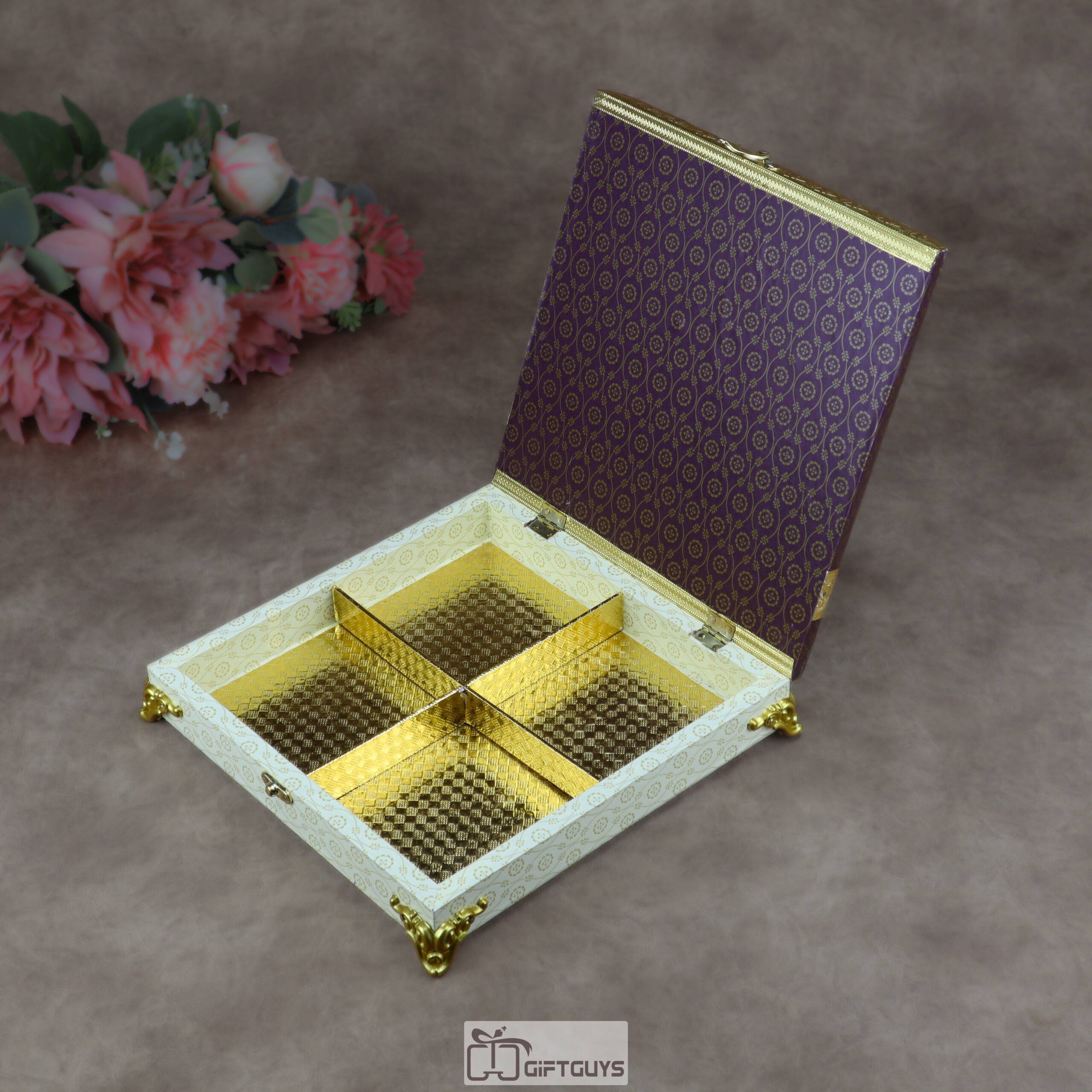 Premium 12×12″ Wooden Dry Fruit Box – 6-Compartment Luxury Purple & Ivory Festive Gift Box with Decorative Gold Feet