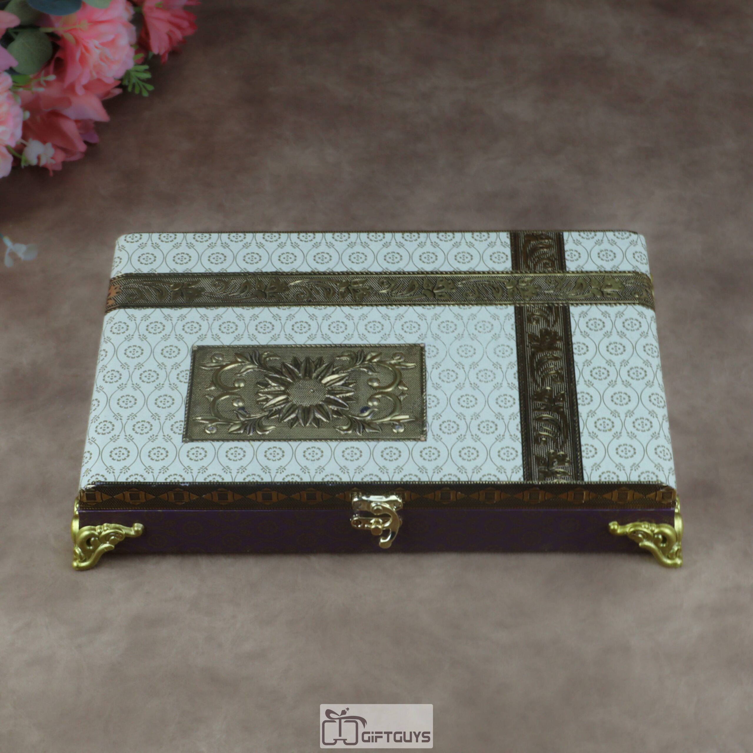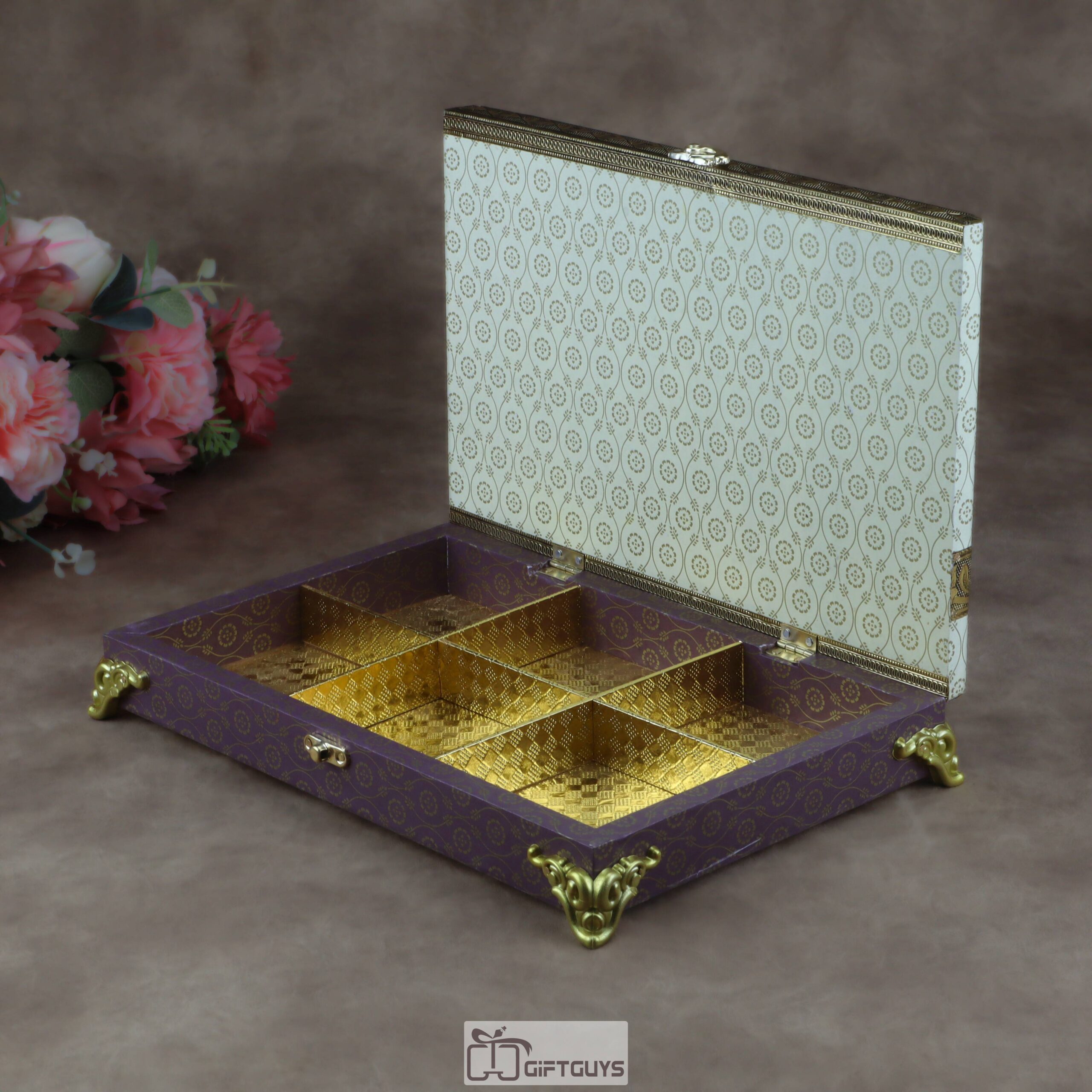 Premium 12×8″ Wooden Dry Fruit Box – 6-Compartment Luxury Purple & Ivory Festive Gift Box with Decorative Gold Feet