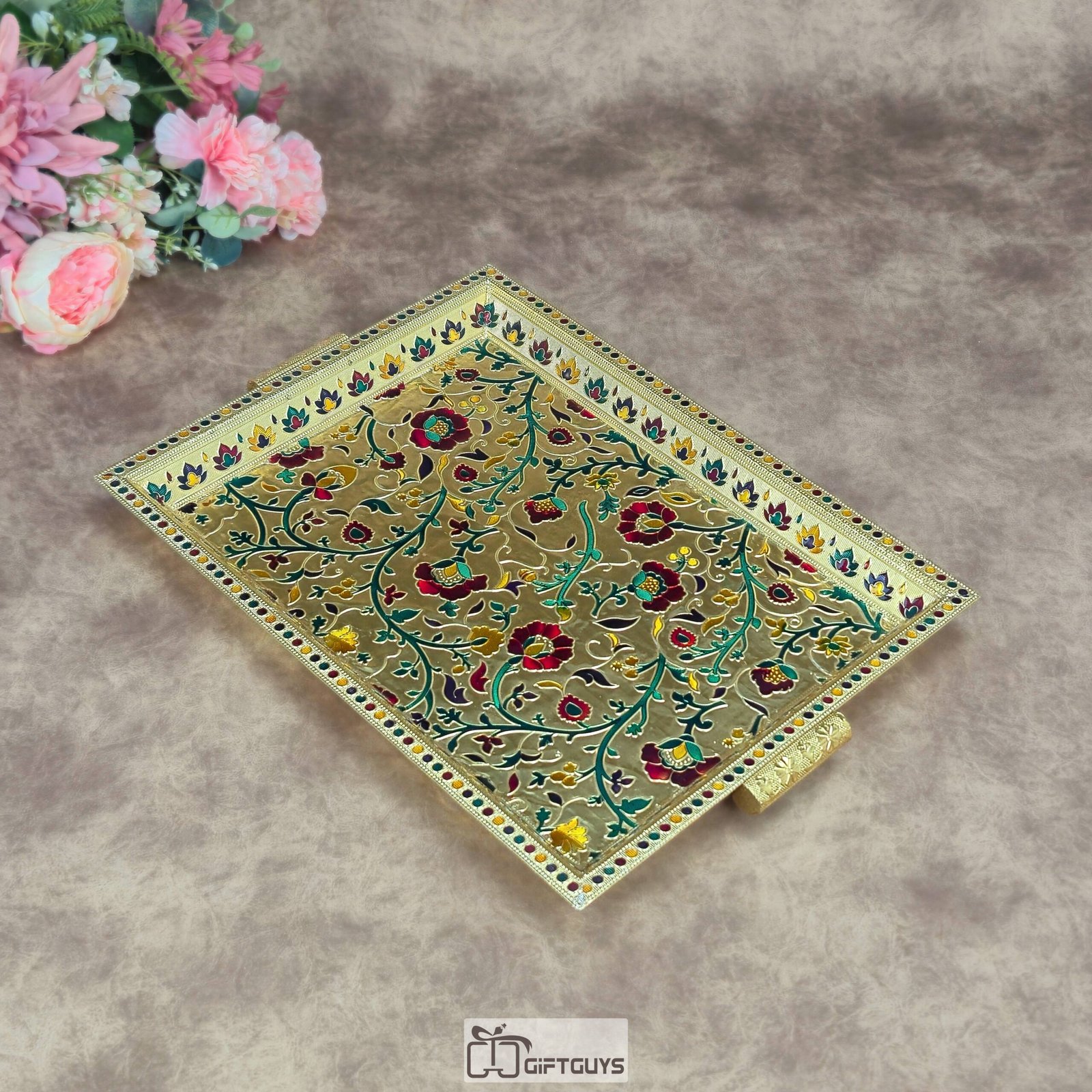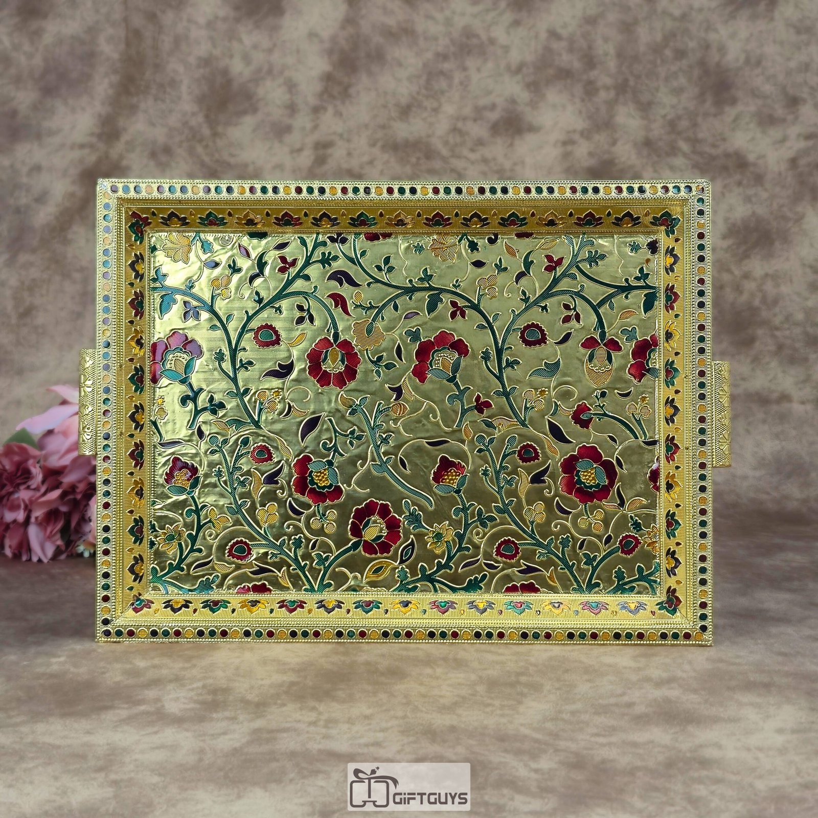 Premium 17×12 Inch Handcrafted Wooden Meenakari Serving Tray – Large Decorative Floral Platter with Handles for Corporate Gifting & Luxury Hospitality.