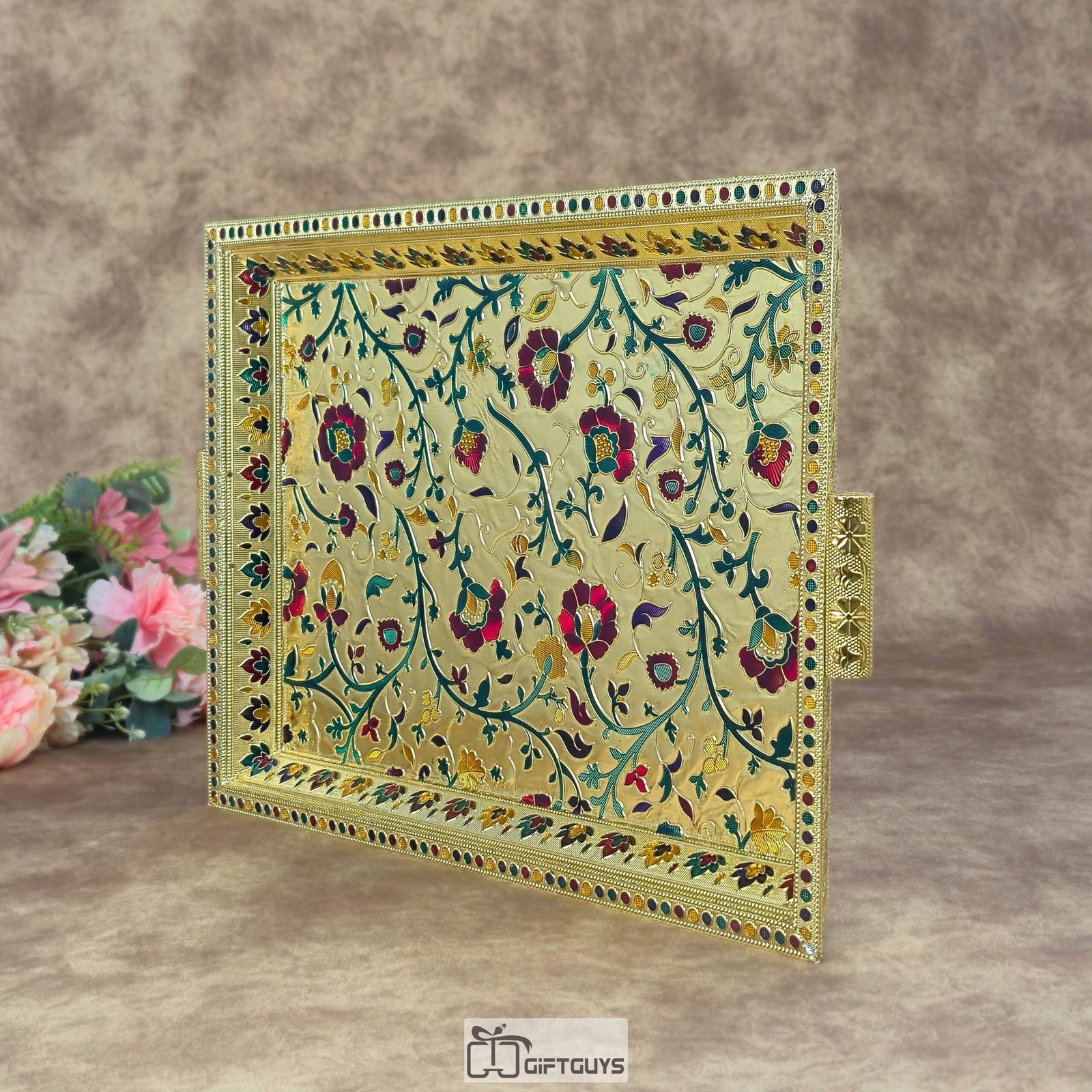 Elegant 16 x 12 inch green wooden tray with golden embossed Meenakari work – perfect for serving and festive decor.