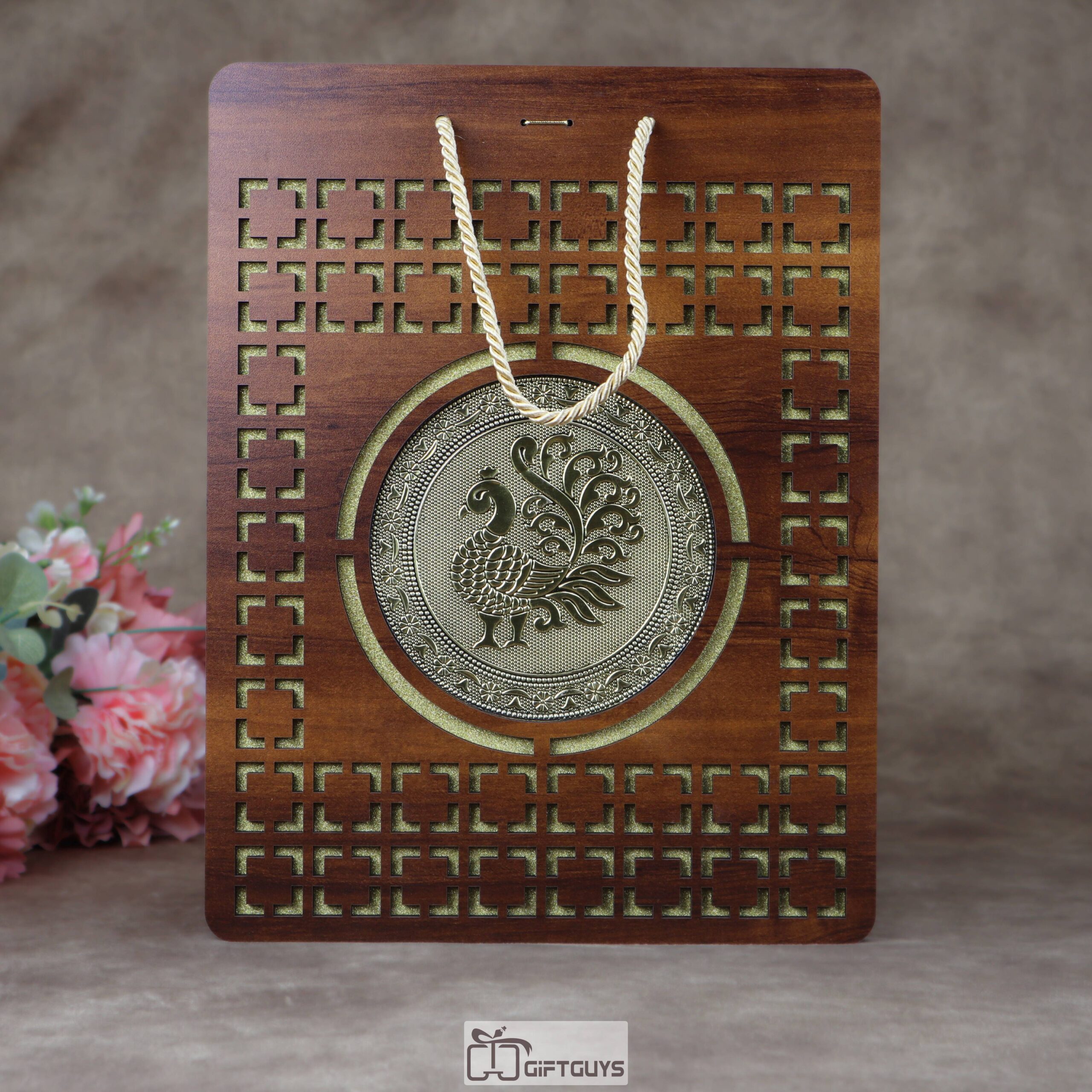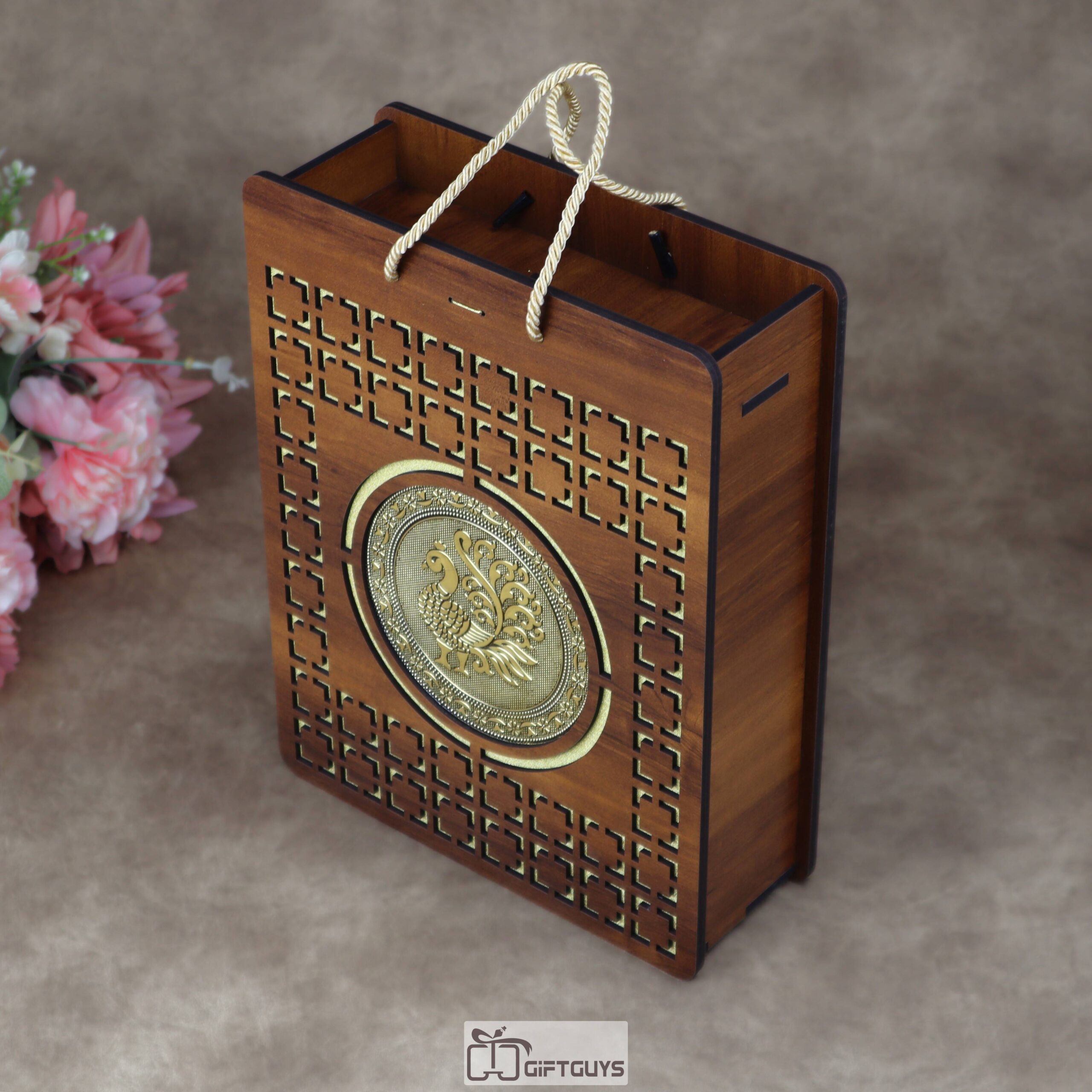 Luxurious Packaging: Features a high-grade wooden MDF box with an intricate laser-cut lattice design and a striking oxidized gold-tone peacock emblem. 🦚