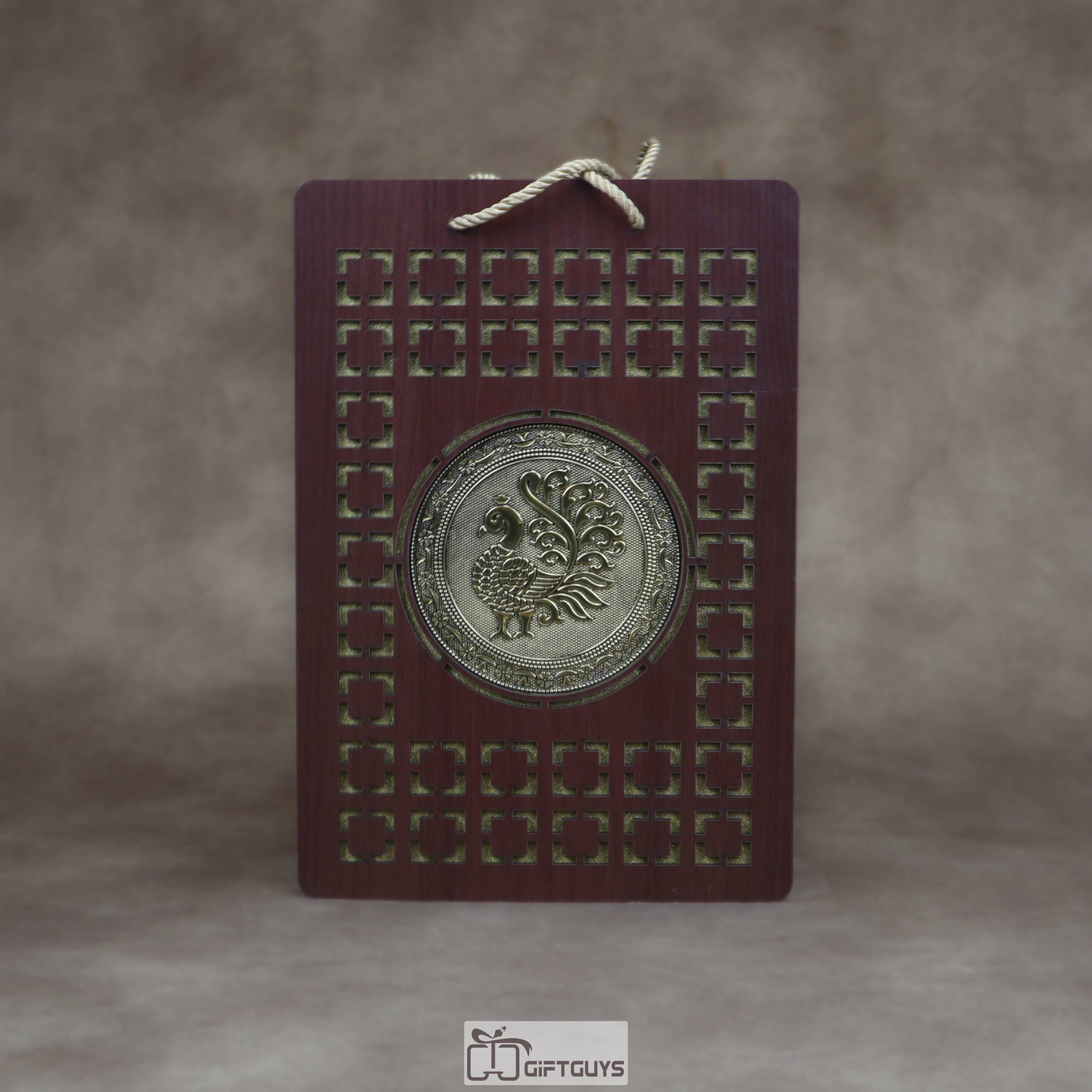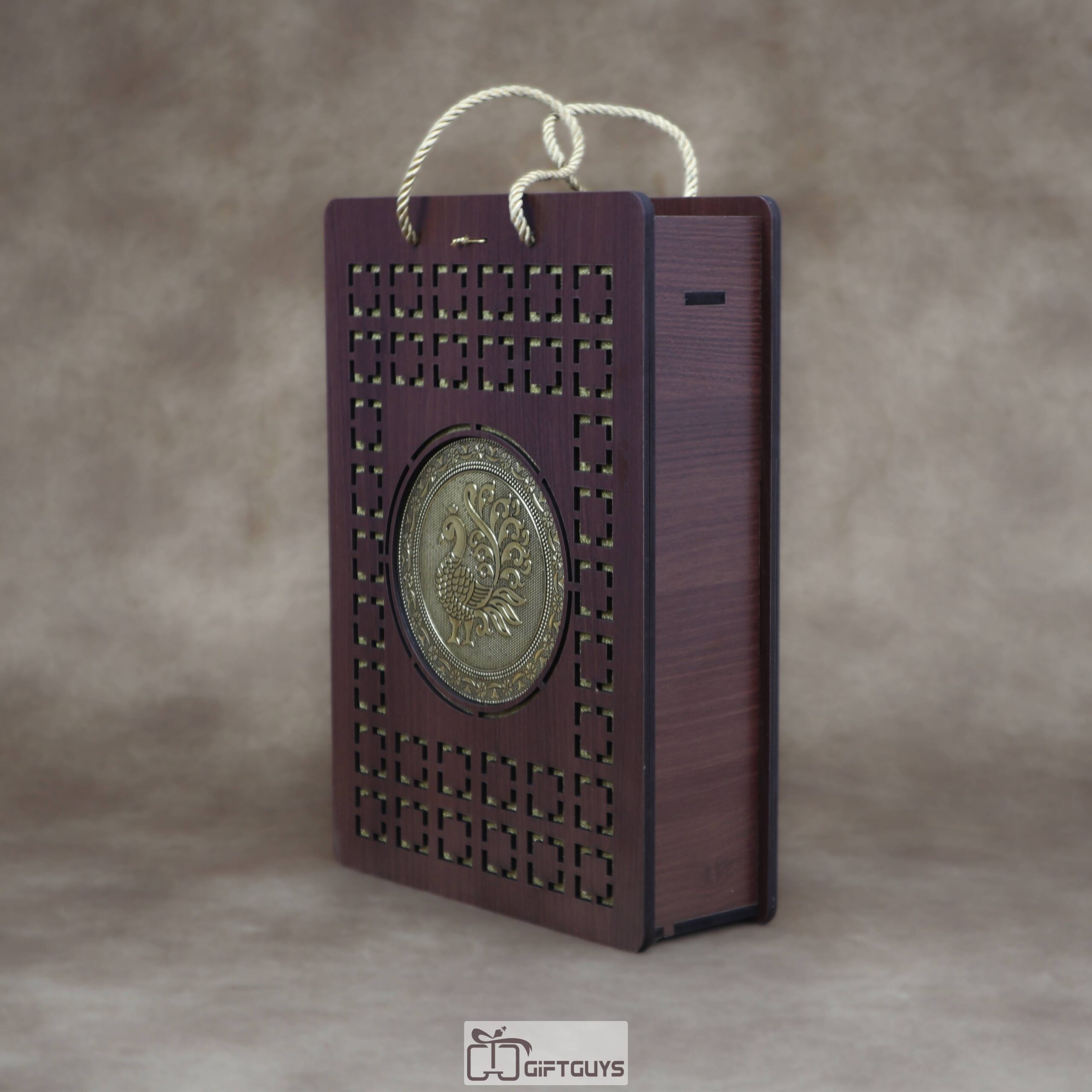 Artisan MDF Packaging: Presented in a luxury, laser-cut dark wood MDF box with a striking Golden-tone Peacock emblem and gold-rope handles for effortless carrying. 🦚