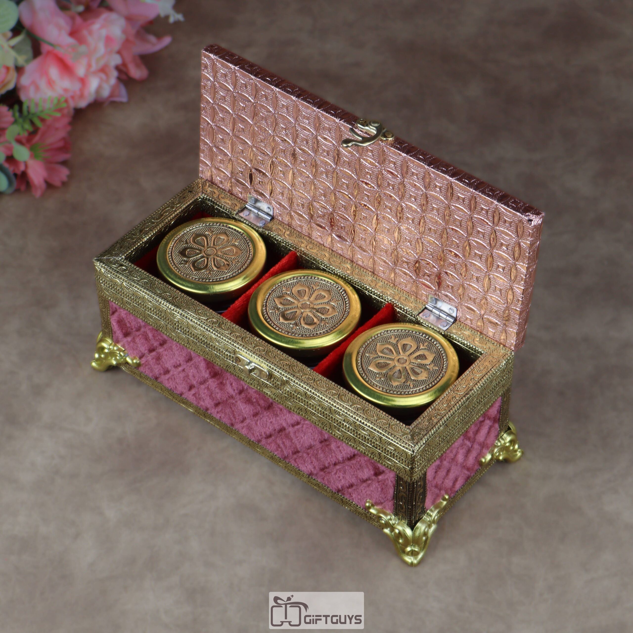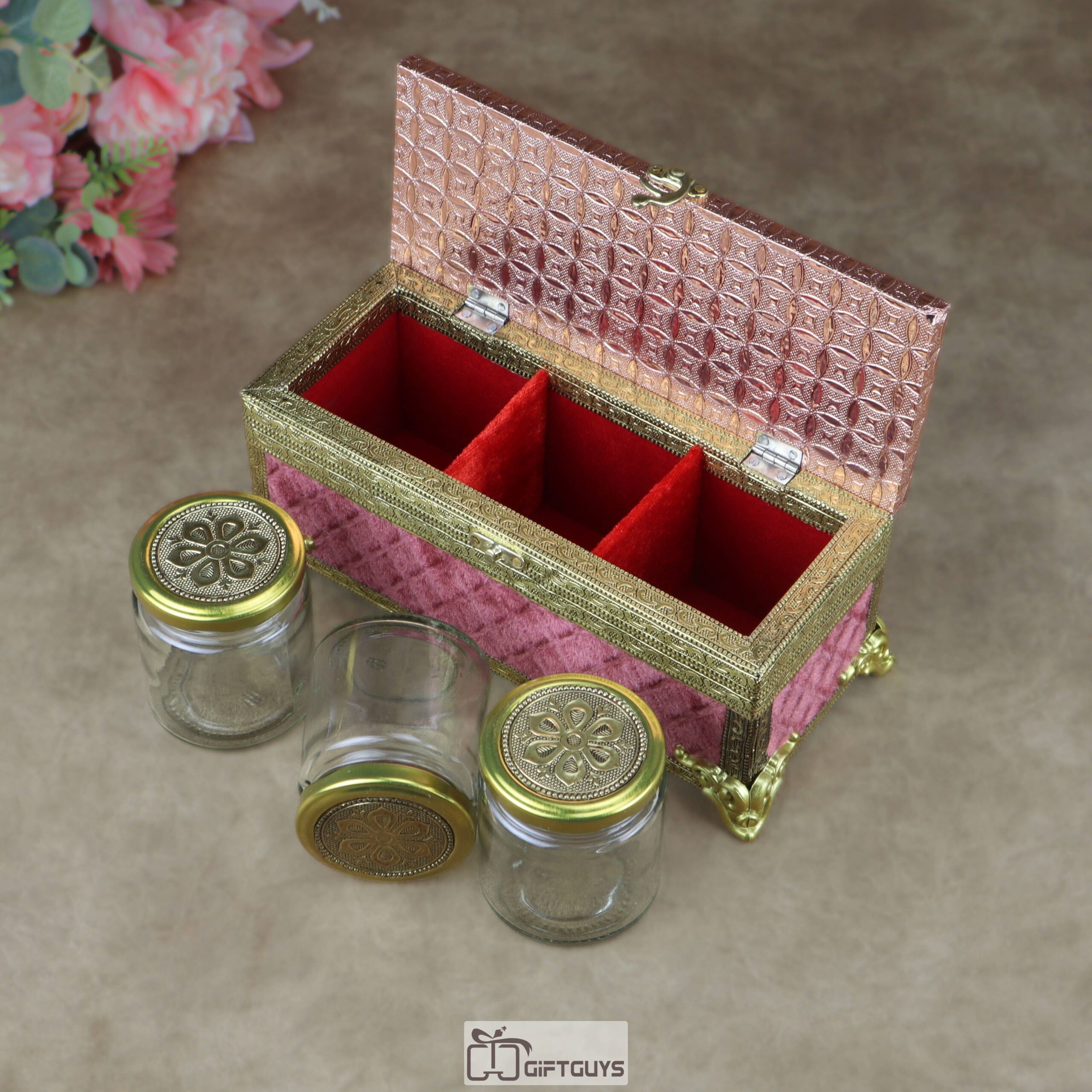 Premium Velvet-Finished Wooden Gift Box with 3 Oxidized Glass Jars – Traditional Designer Dry Fruit & Mouth Freshener Storage Trunk