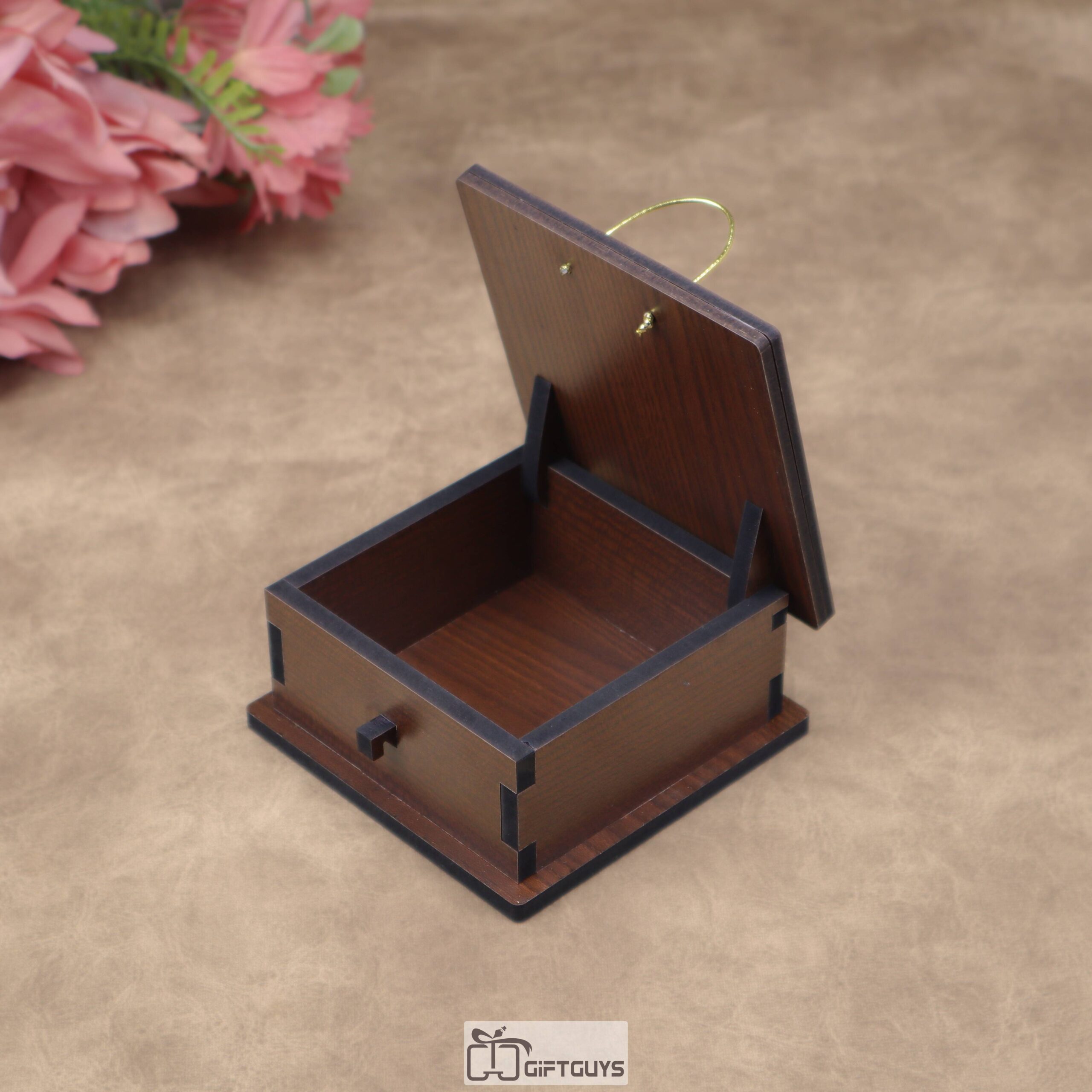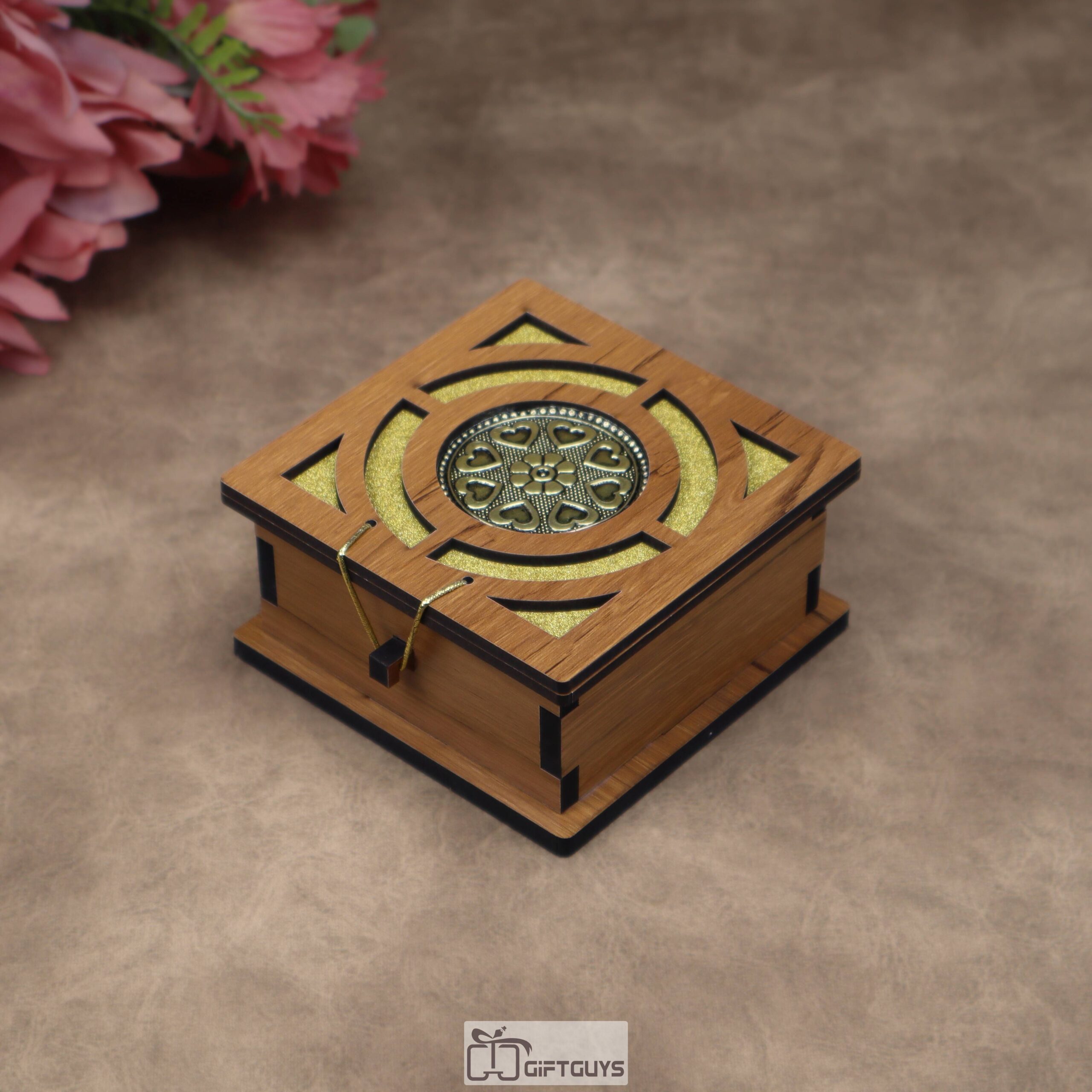 A stylish 4 x 4 inch handcrafted wooden gift box with cut-out lid and golden lining. Ideal for dry fruits, chocolates, or return gifts.