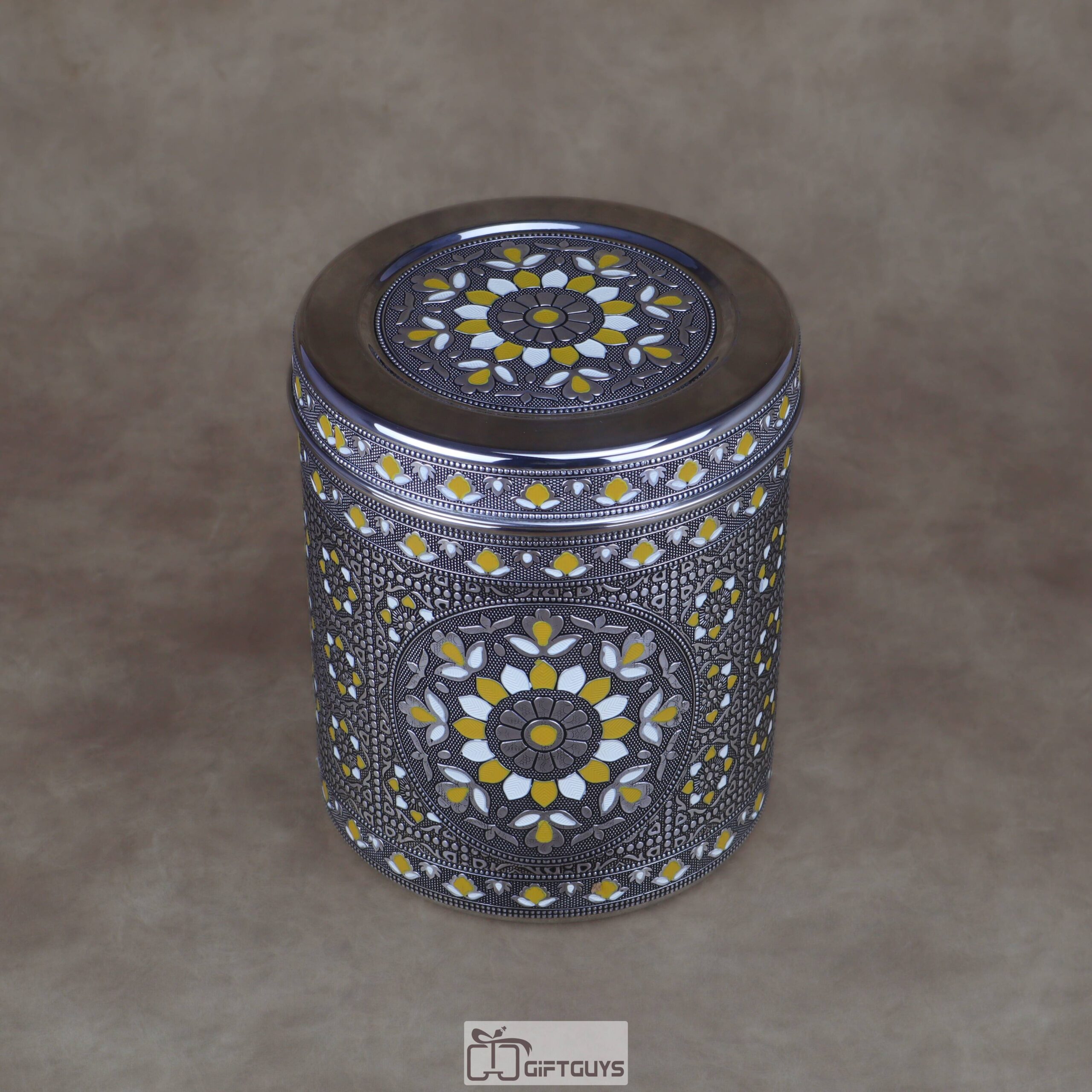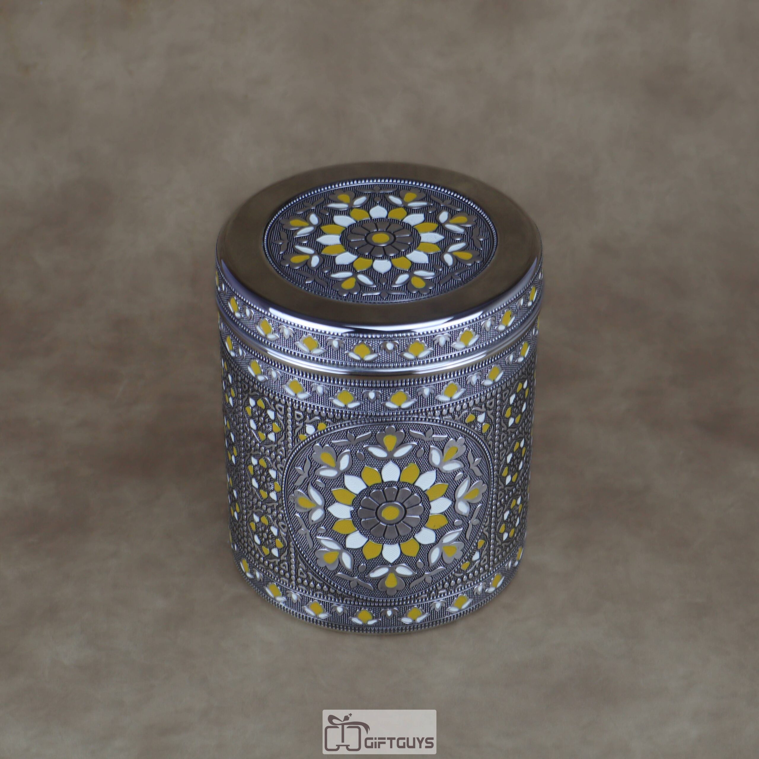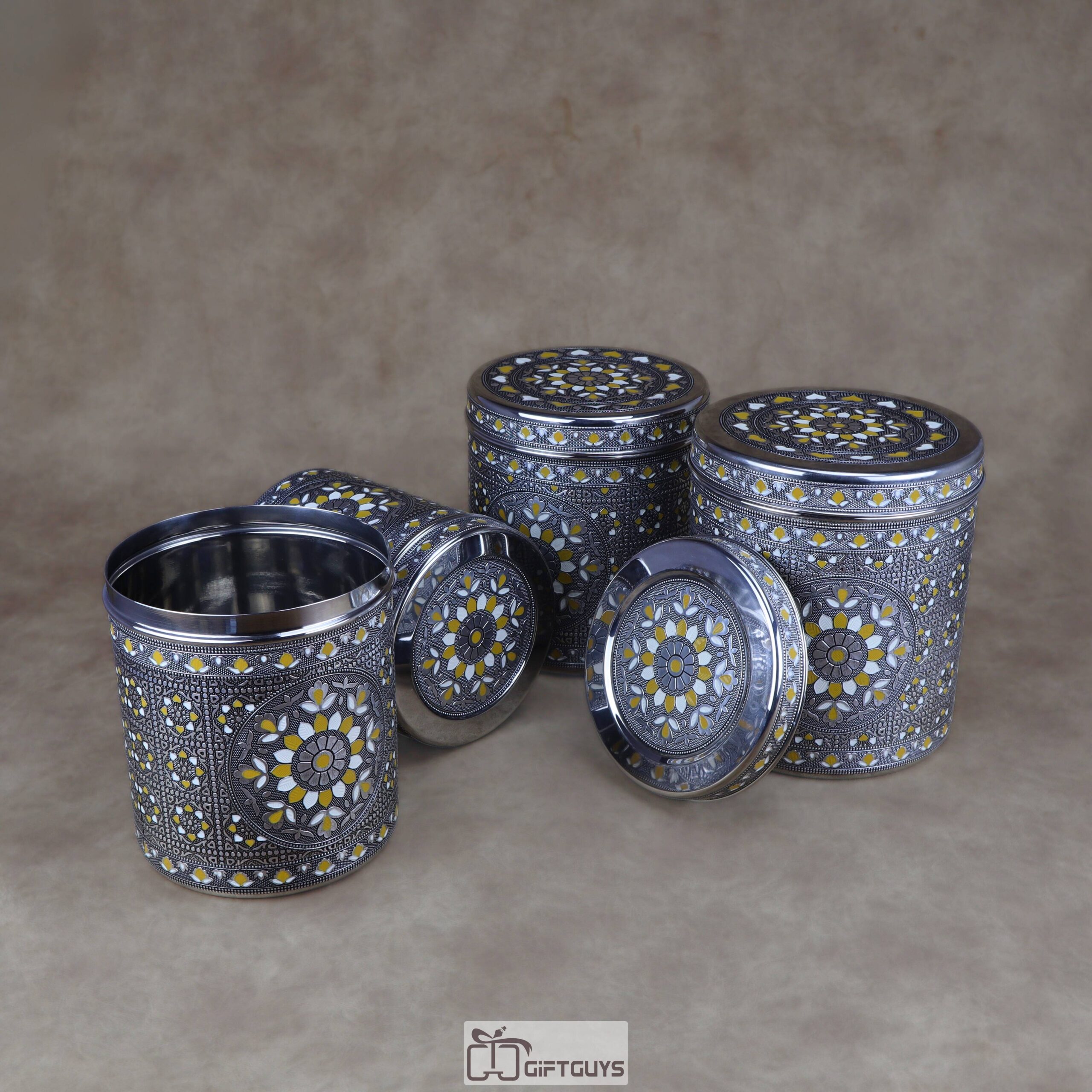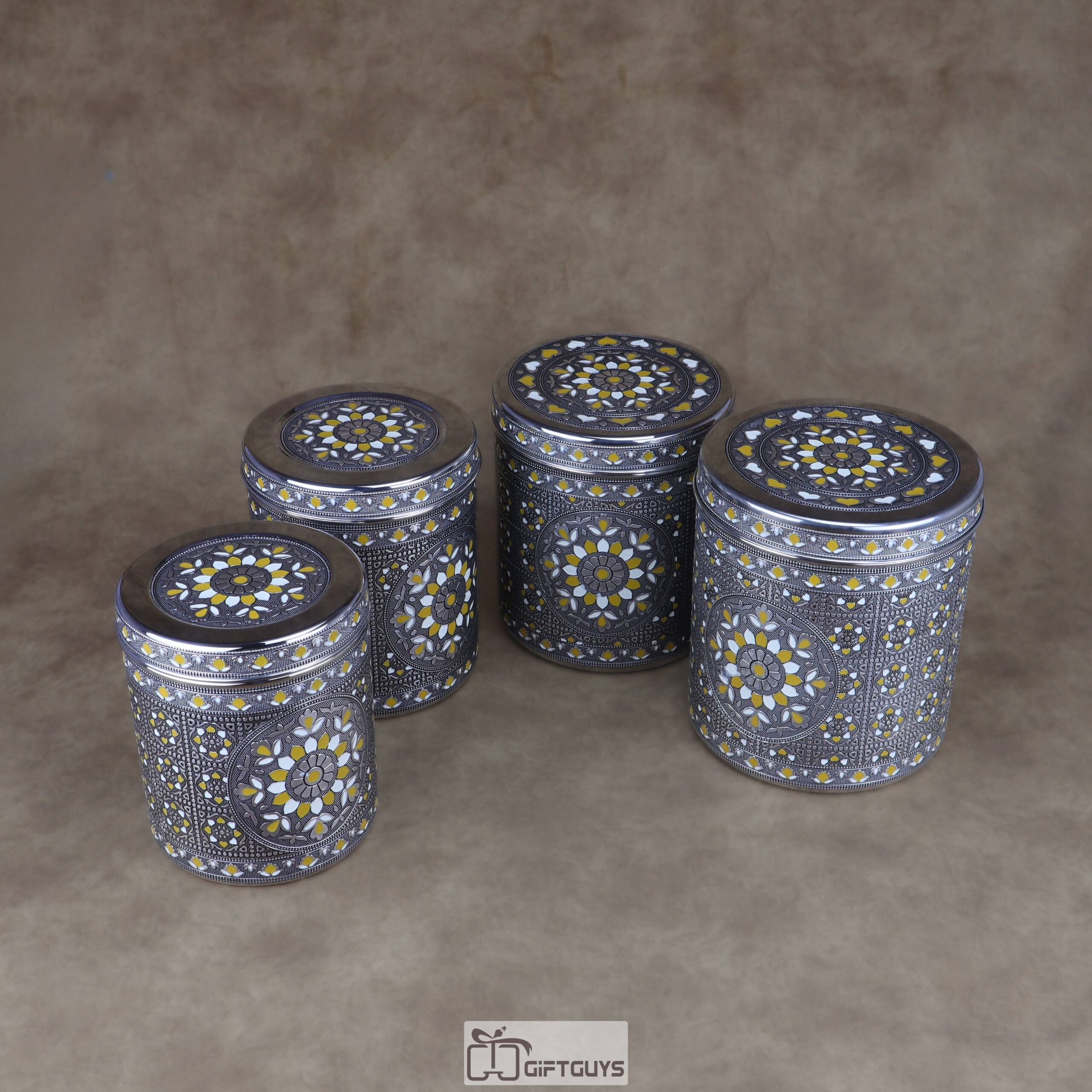 Heirloom Artistry: π¨ This set of four nesting containers features intricate hand-enameled Meenakari work in yellow and white floral patterns on a rich silver-tone steel base.