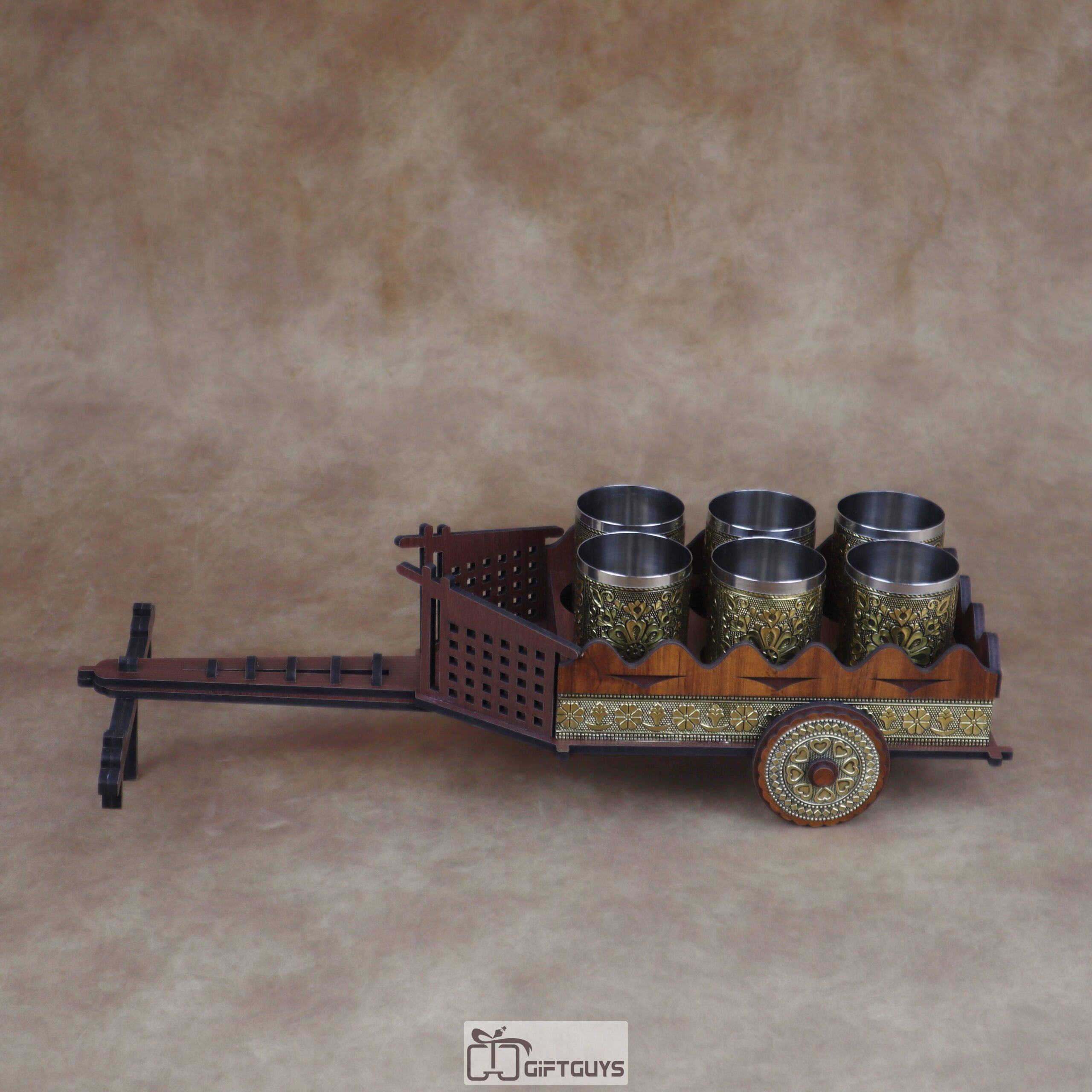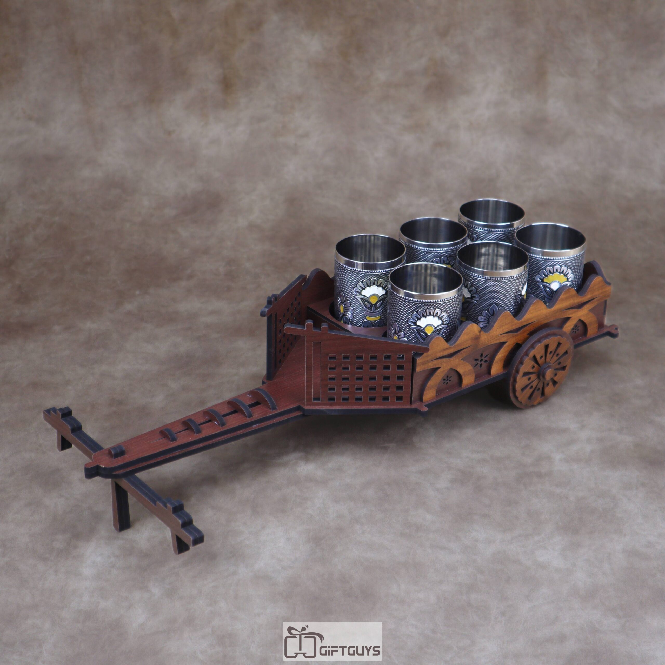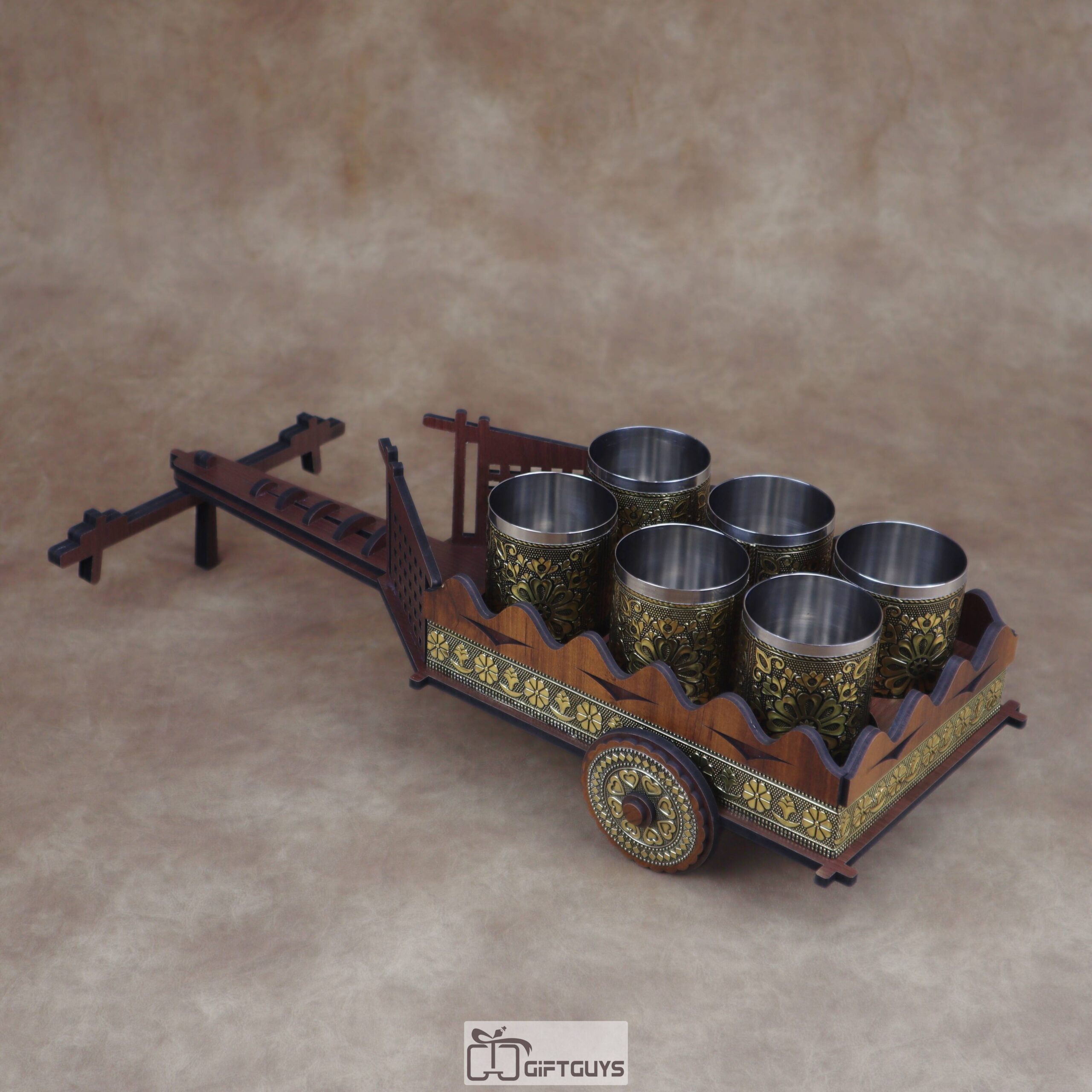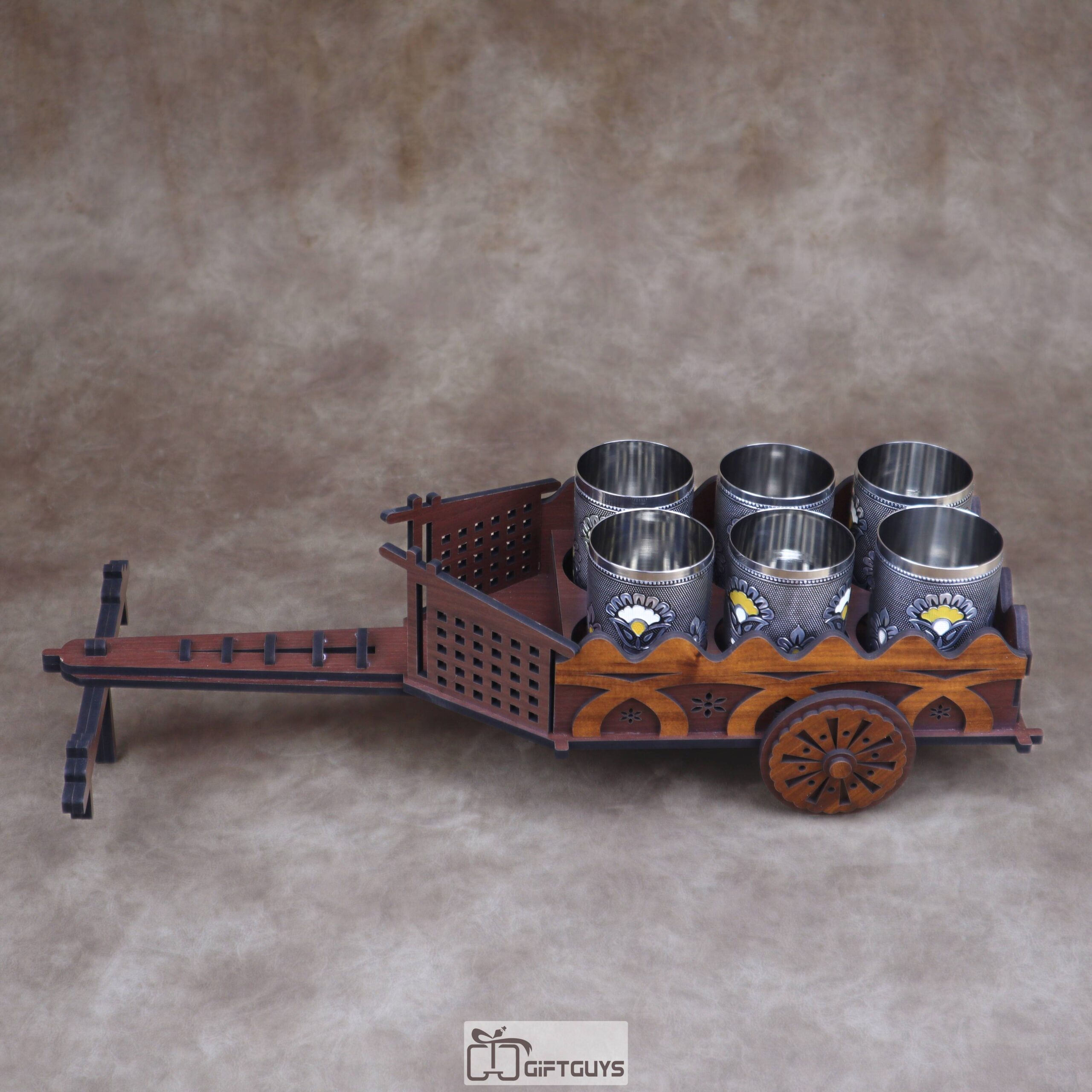 Unique Presentation: π This elegant wooden bullock cart holds six decorative stainless steel tumblers / glasses, making it perfect for serving refreshments.