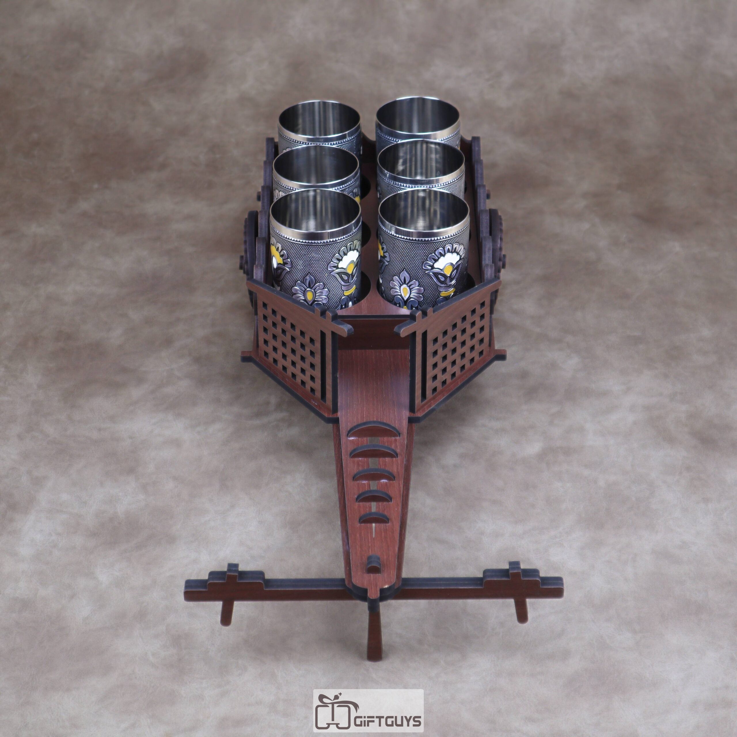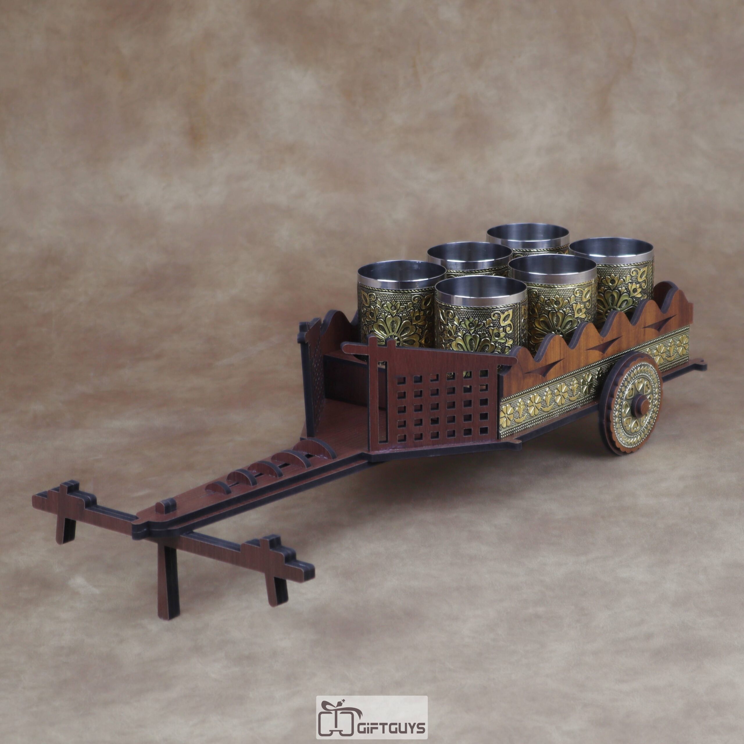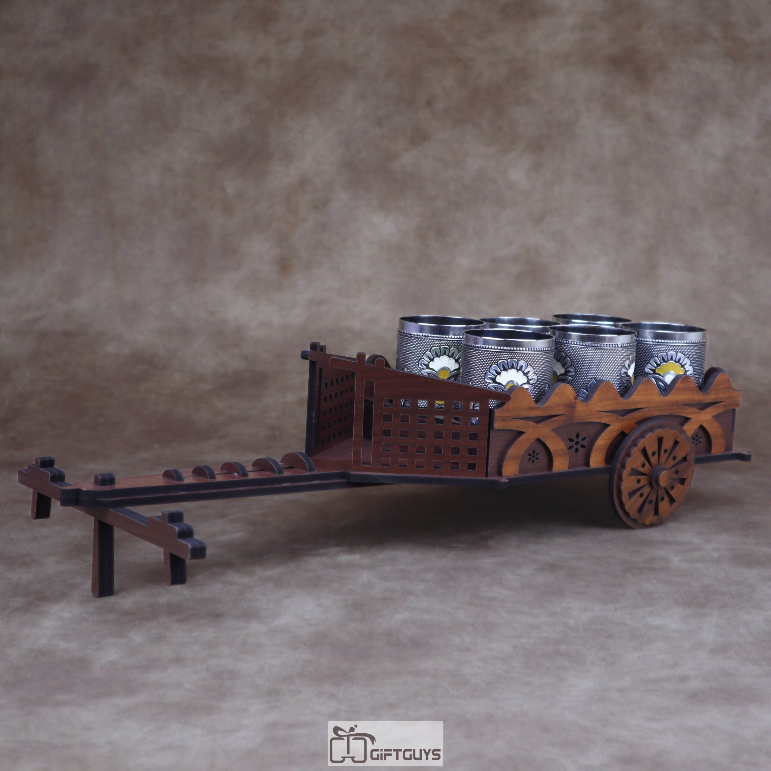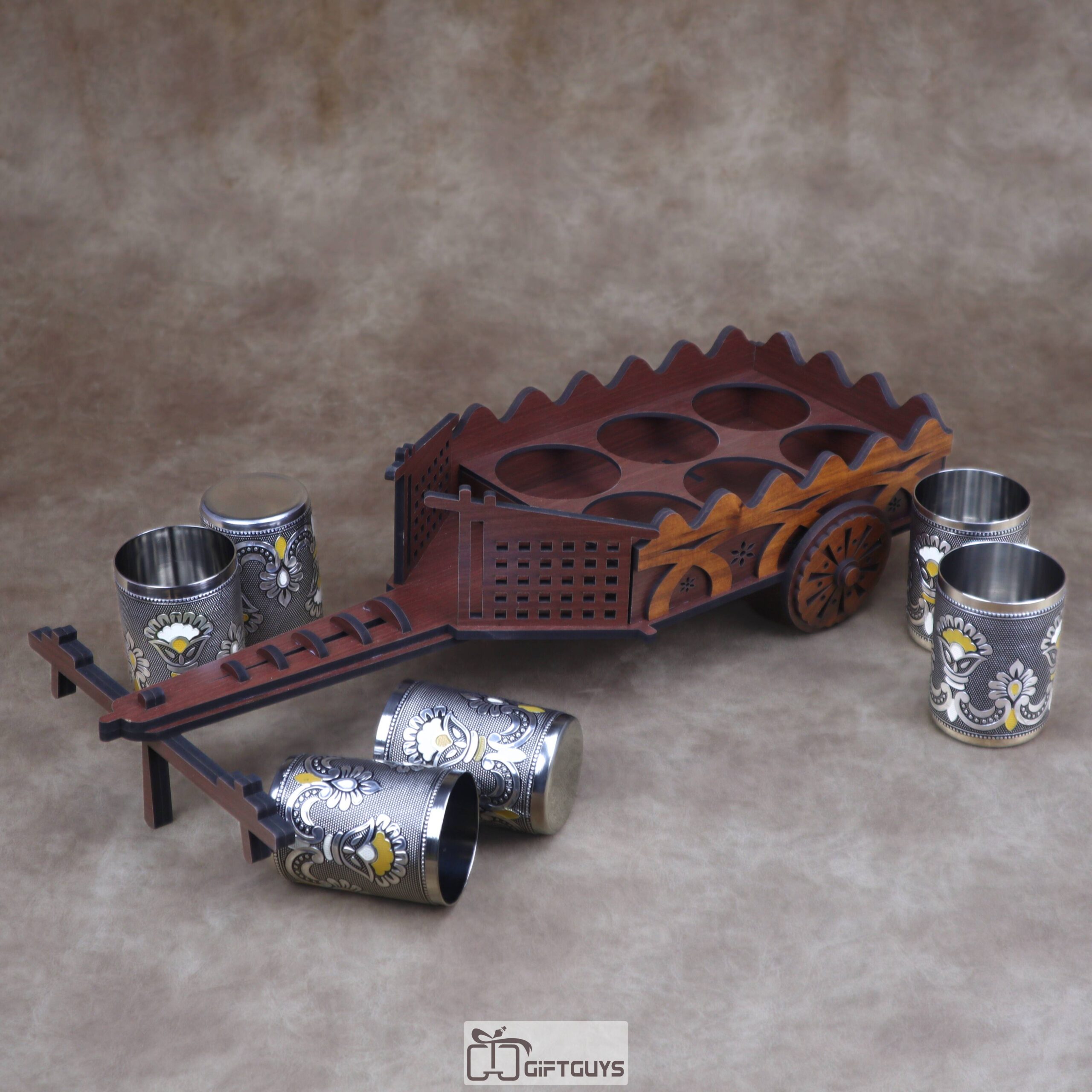 Unique Presentation: π This elegant wooden bullock cart holds six decorative stainless steel tumblers / glasses, making it perfect for serving refreshments.