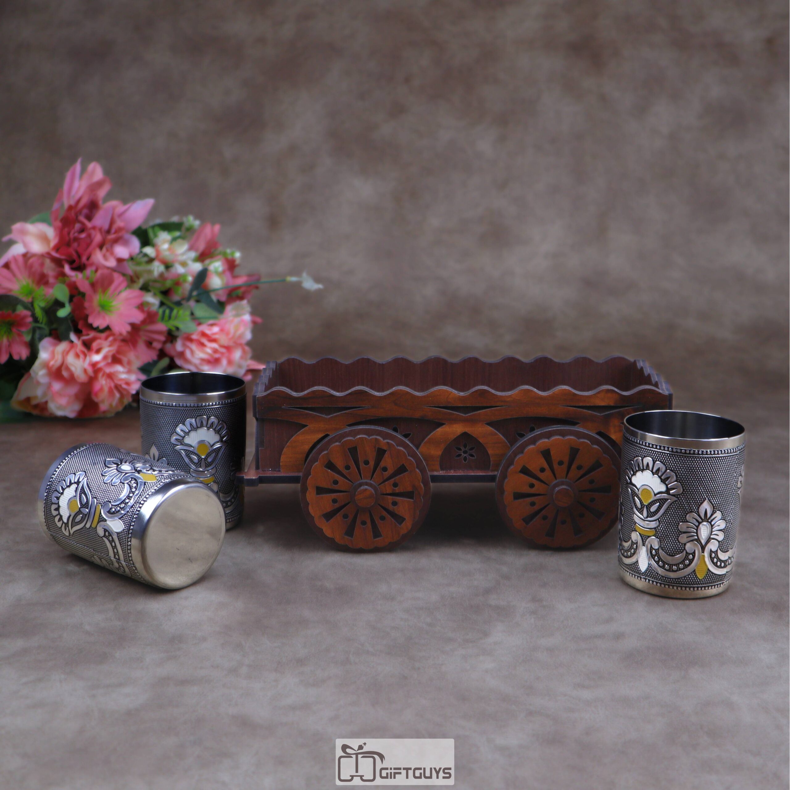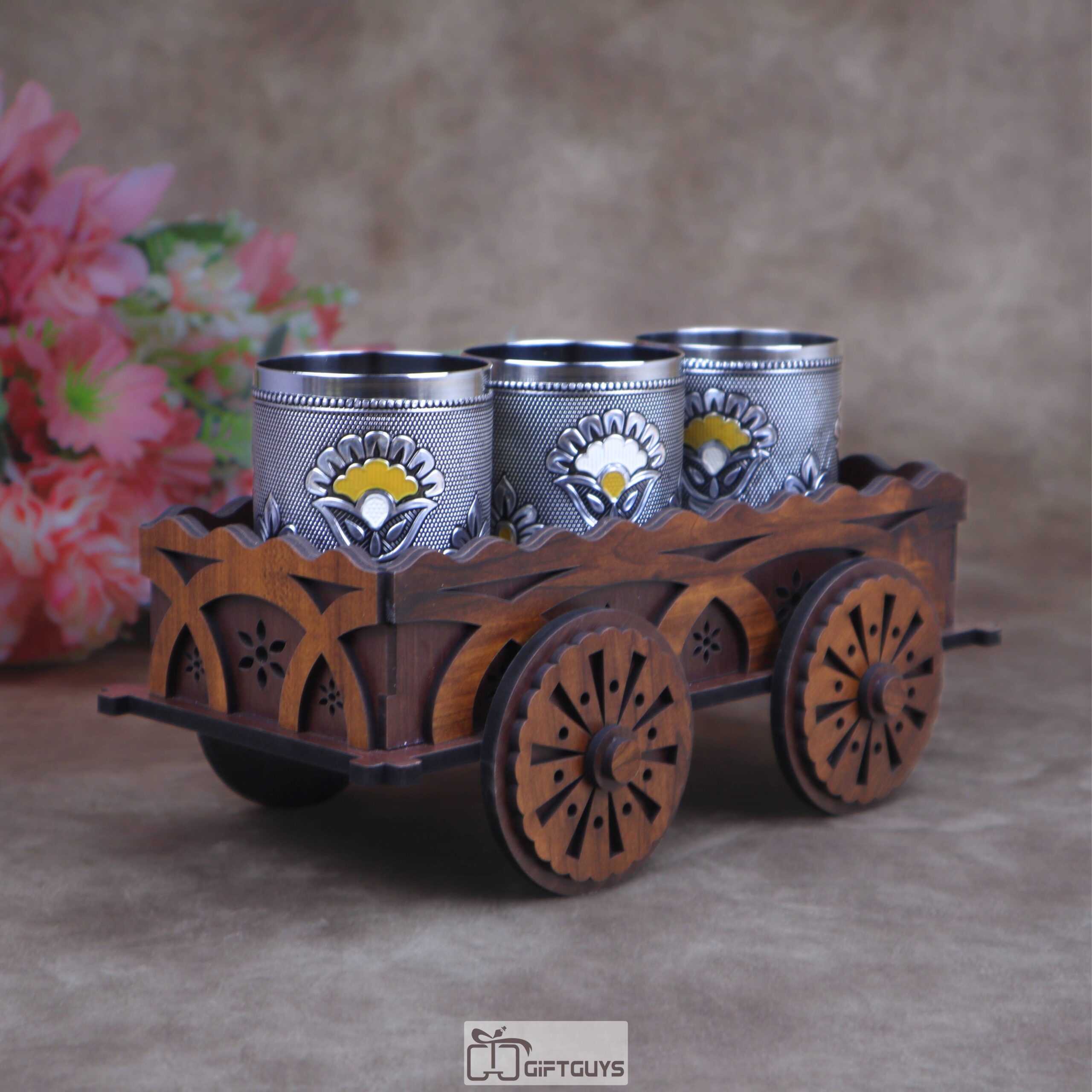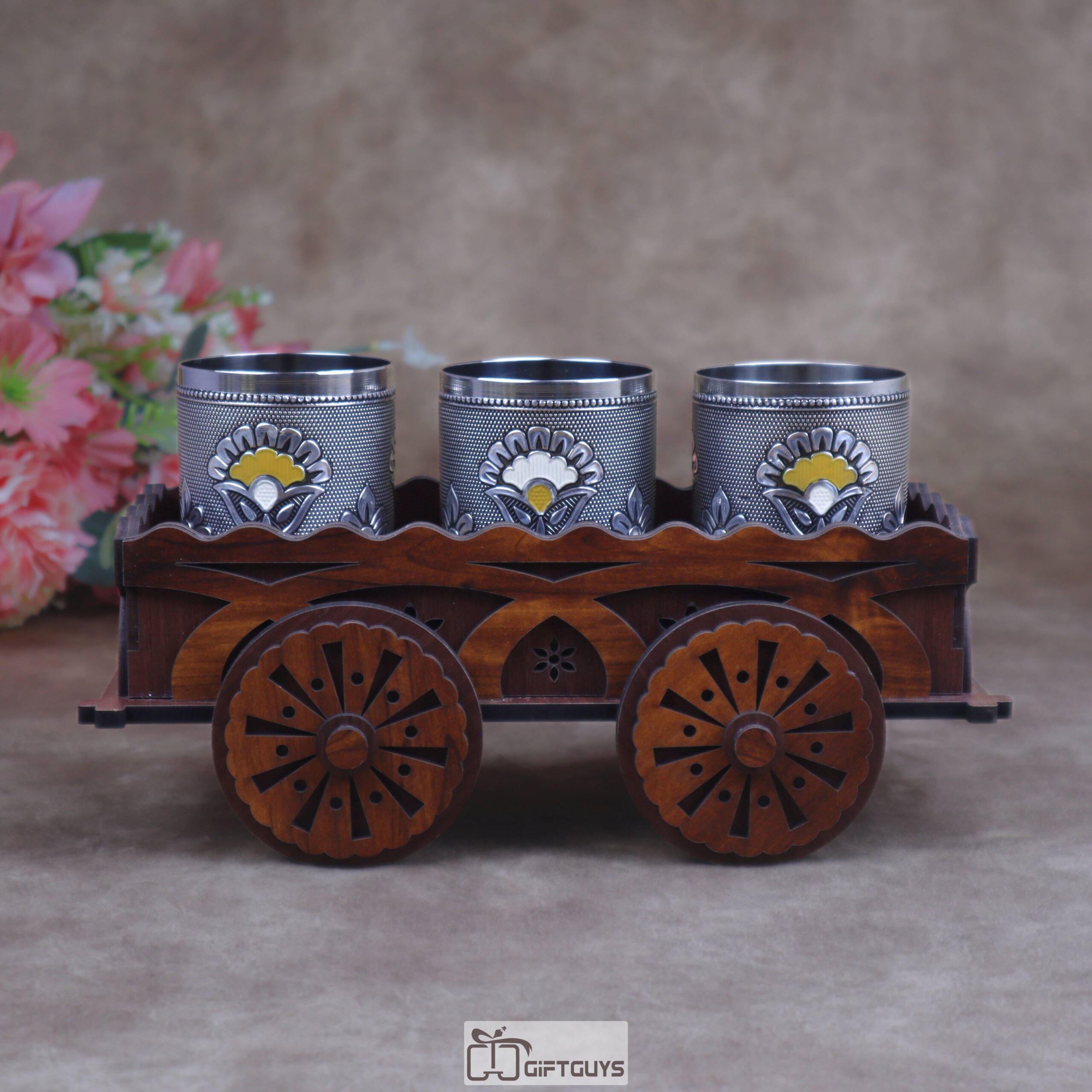 Elegant Trio Server: 🍸 This wooden cart holds decorative steel tumblers, ideal for serving Cold drinks, Water, Beverages.