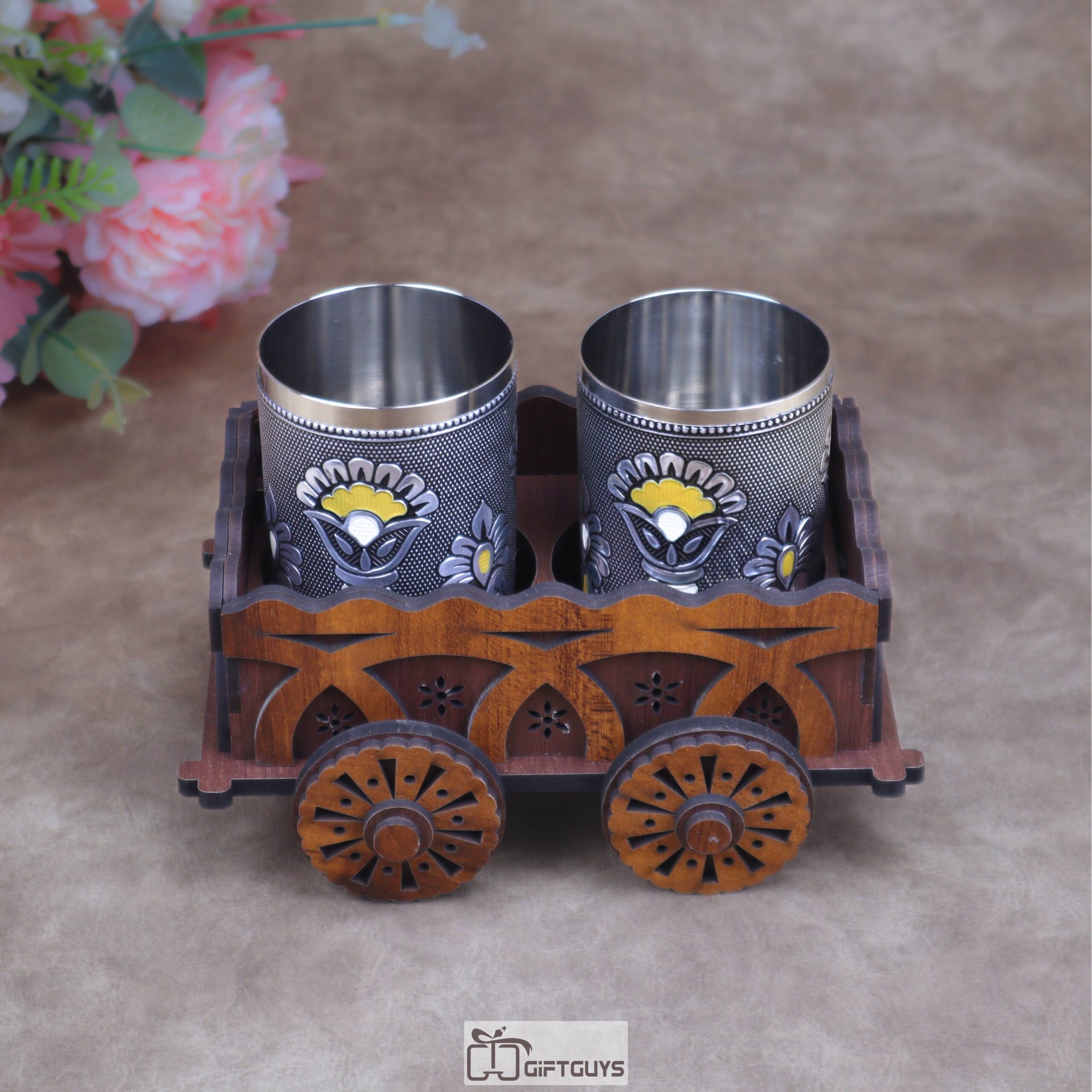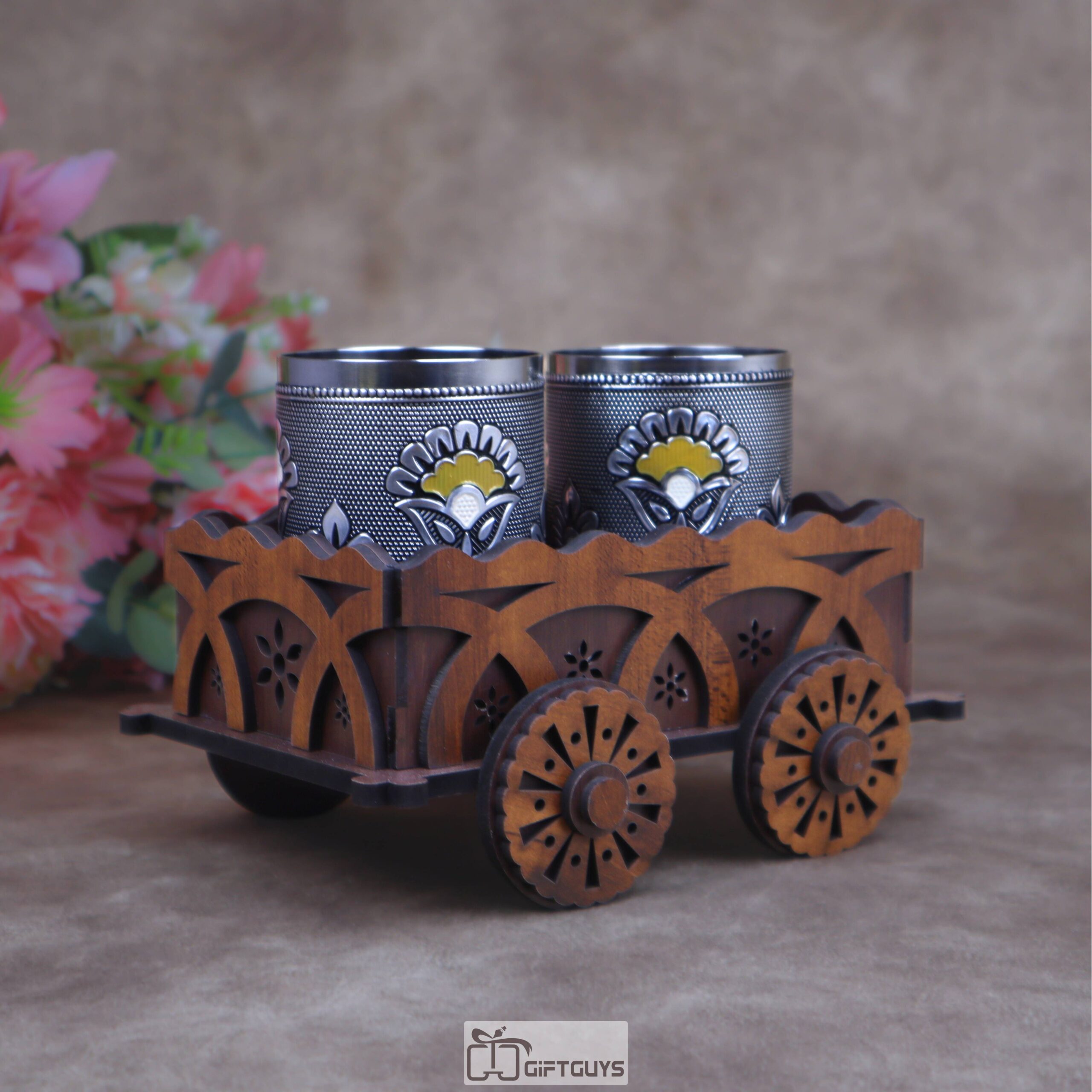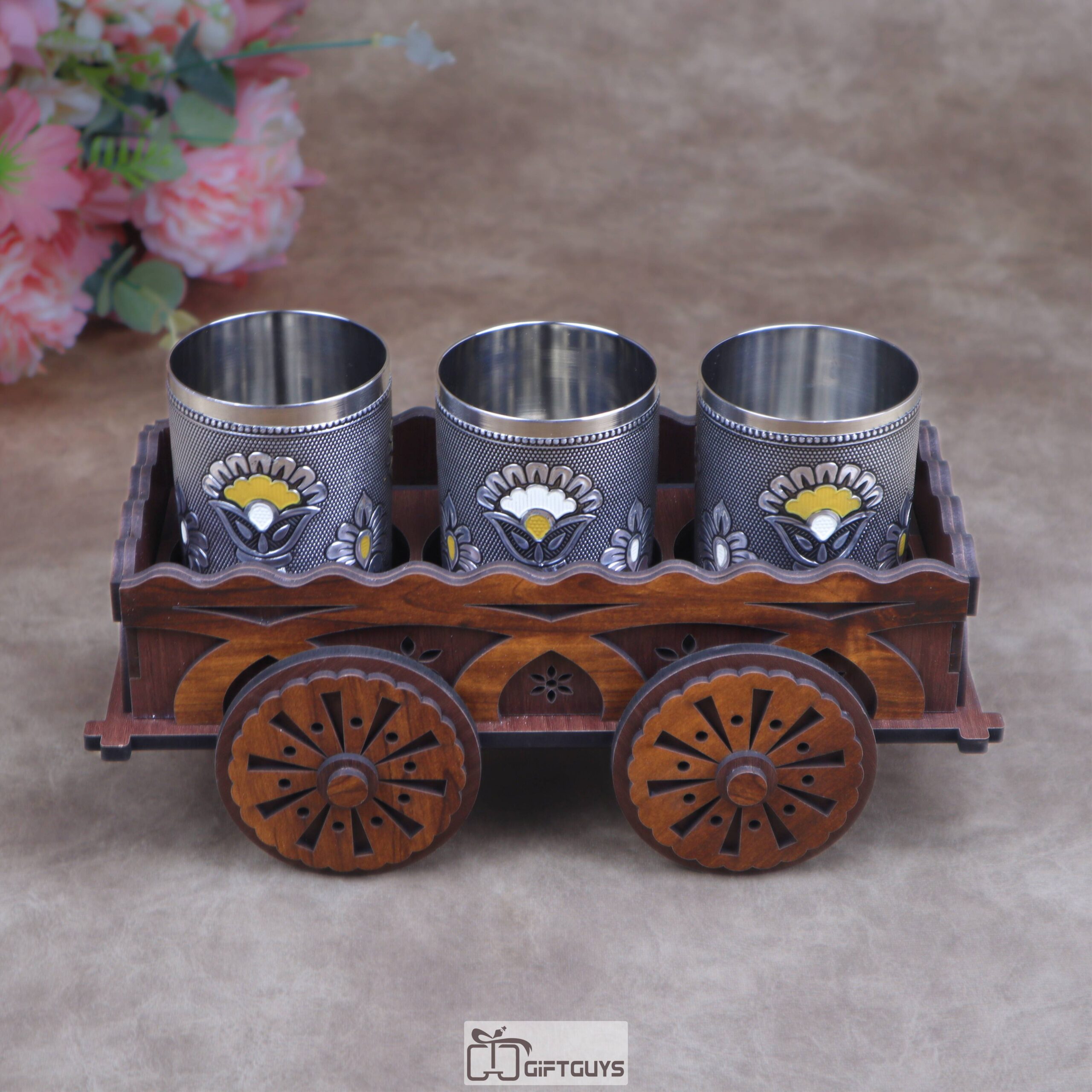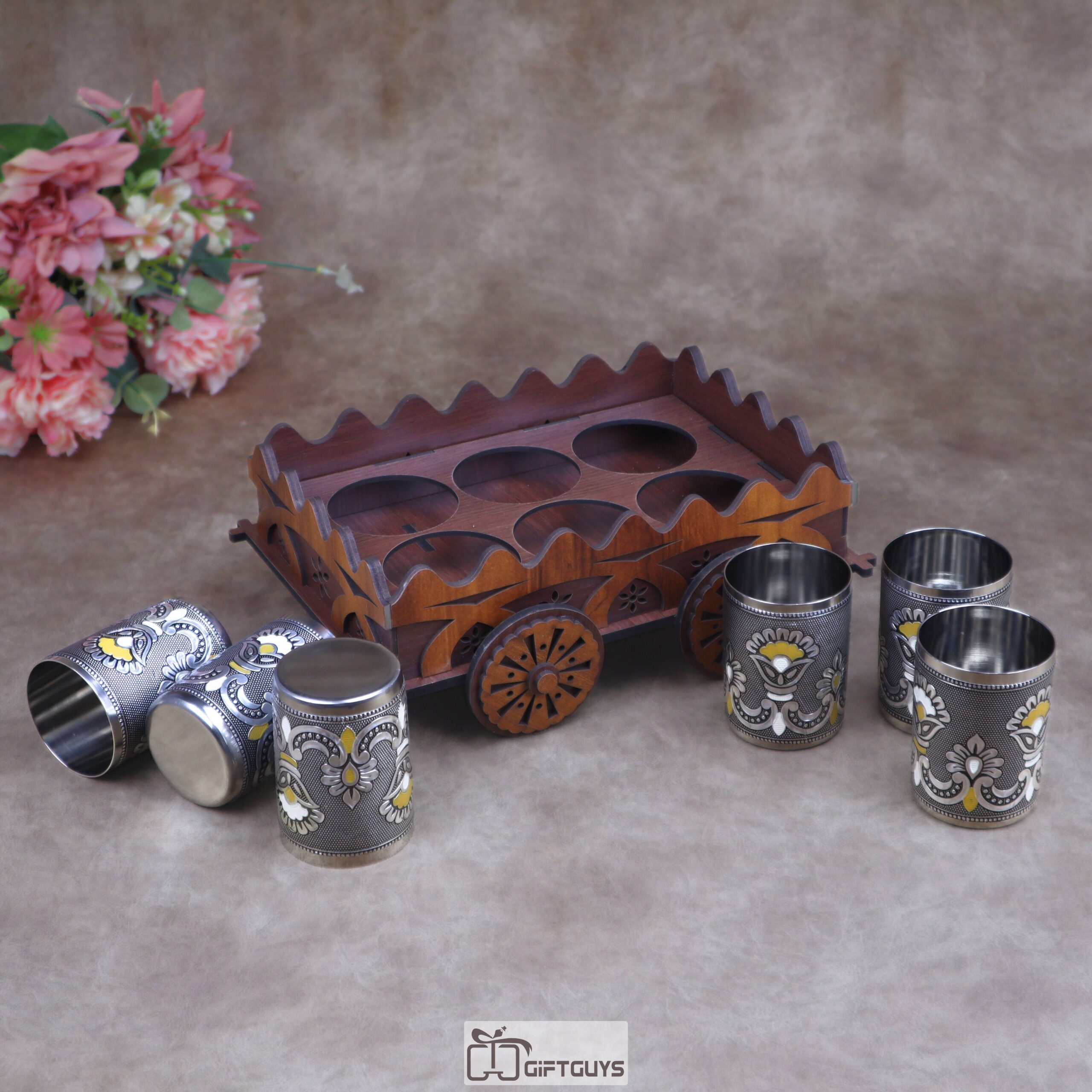 Elegant Trio Server: 🍸 This wooden cart holds decorative steel tumblers, ideal for serving Cold drinks, Water, Beverages.