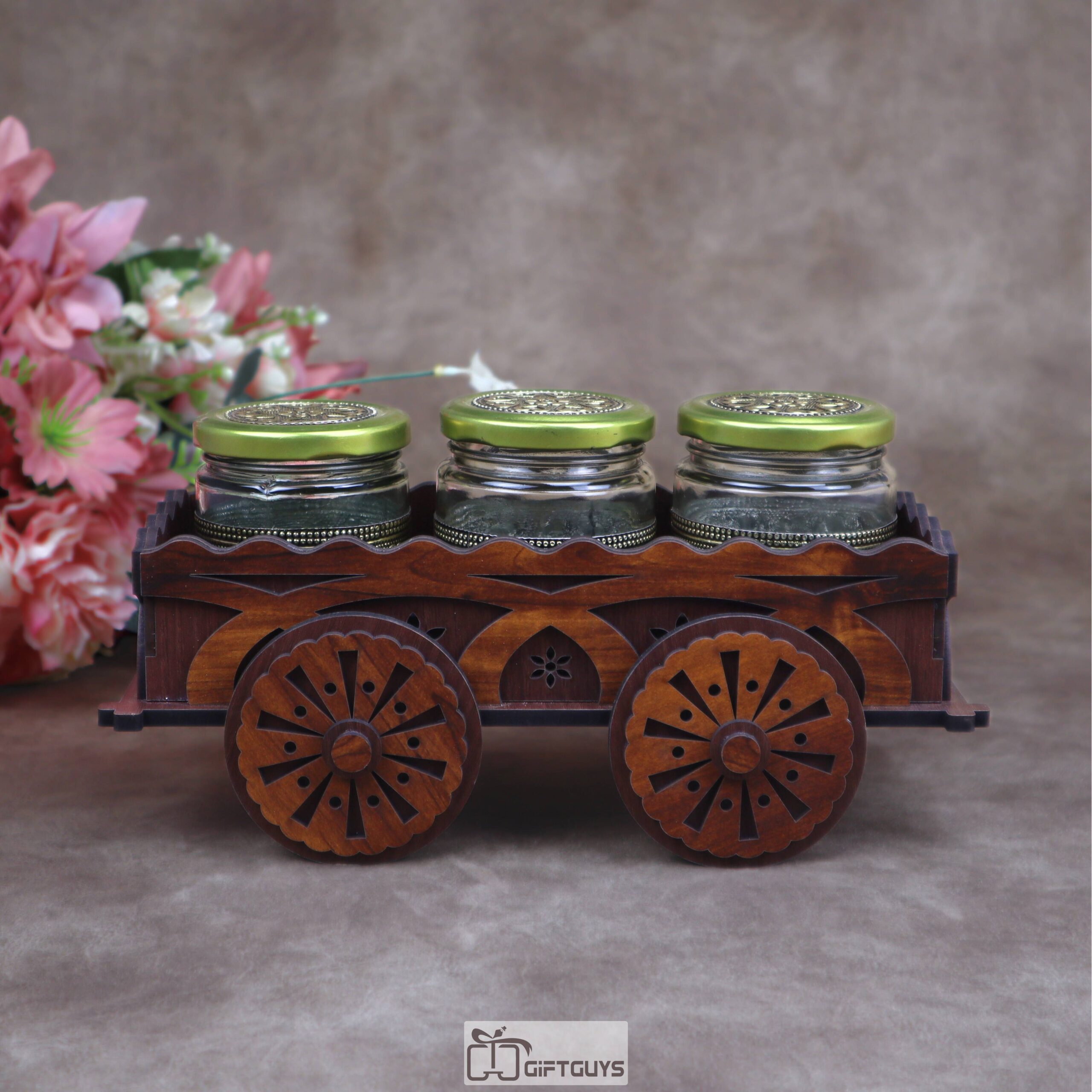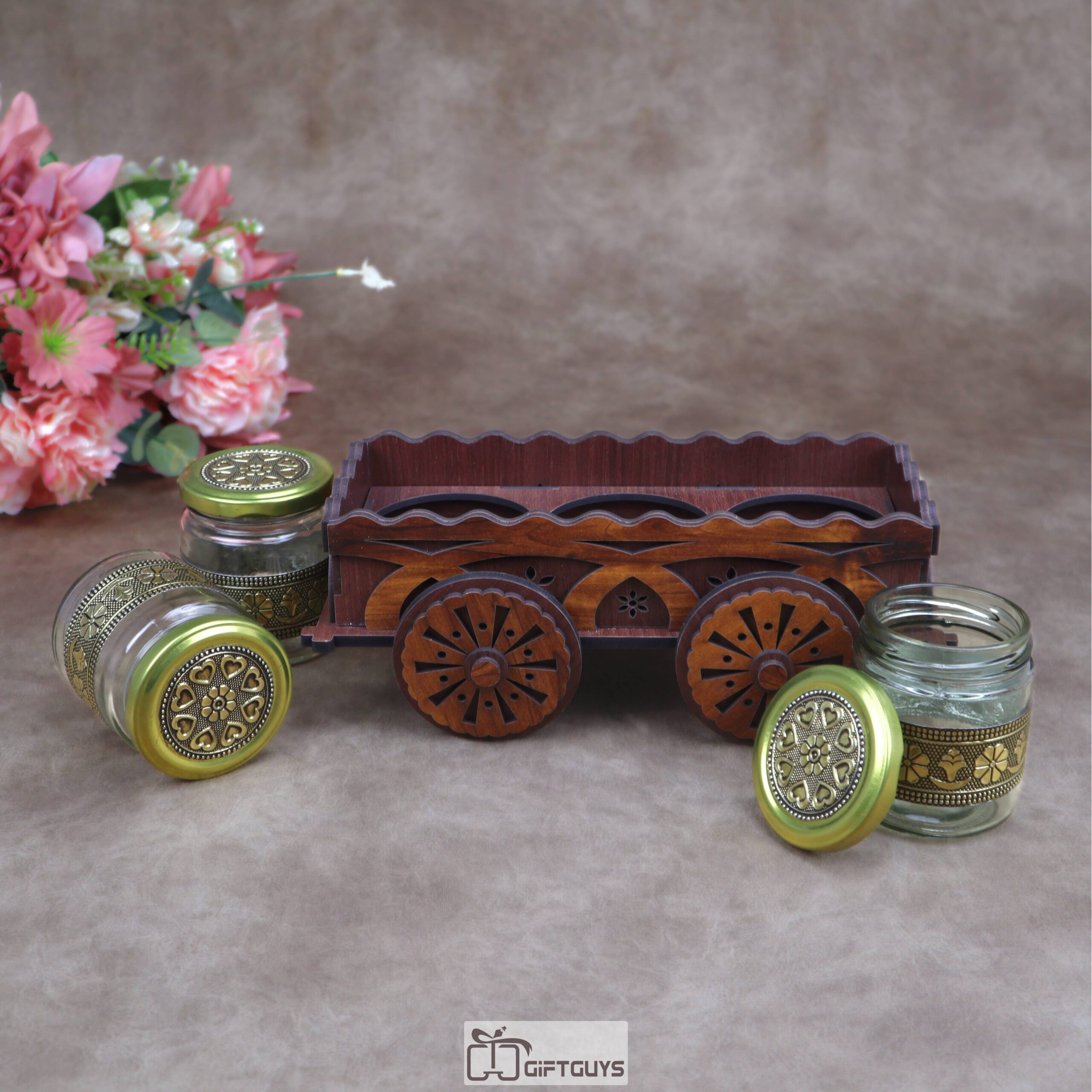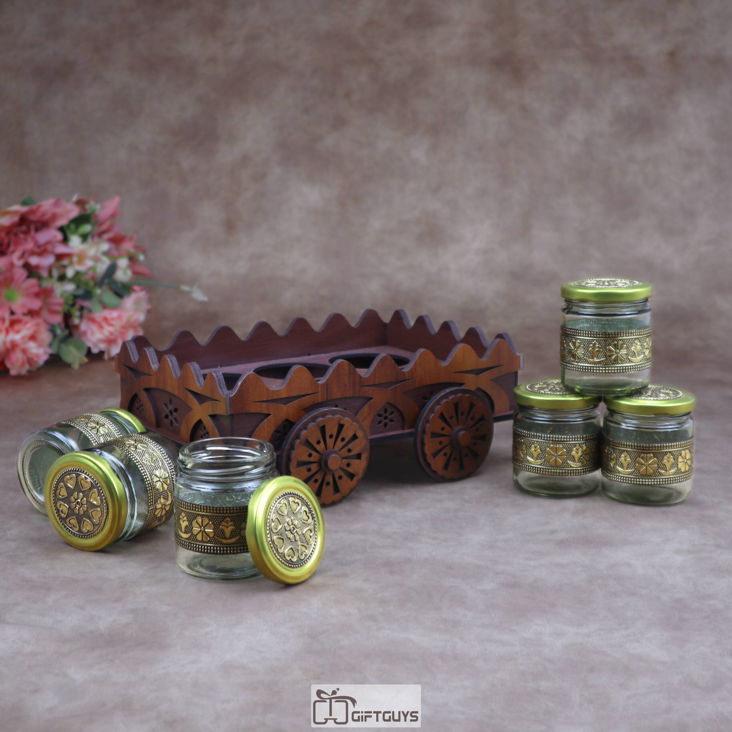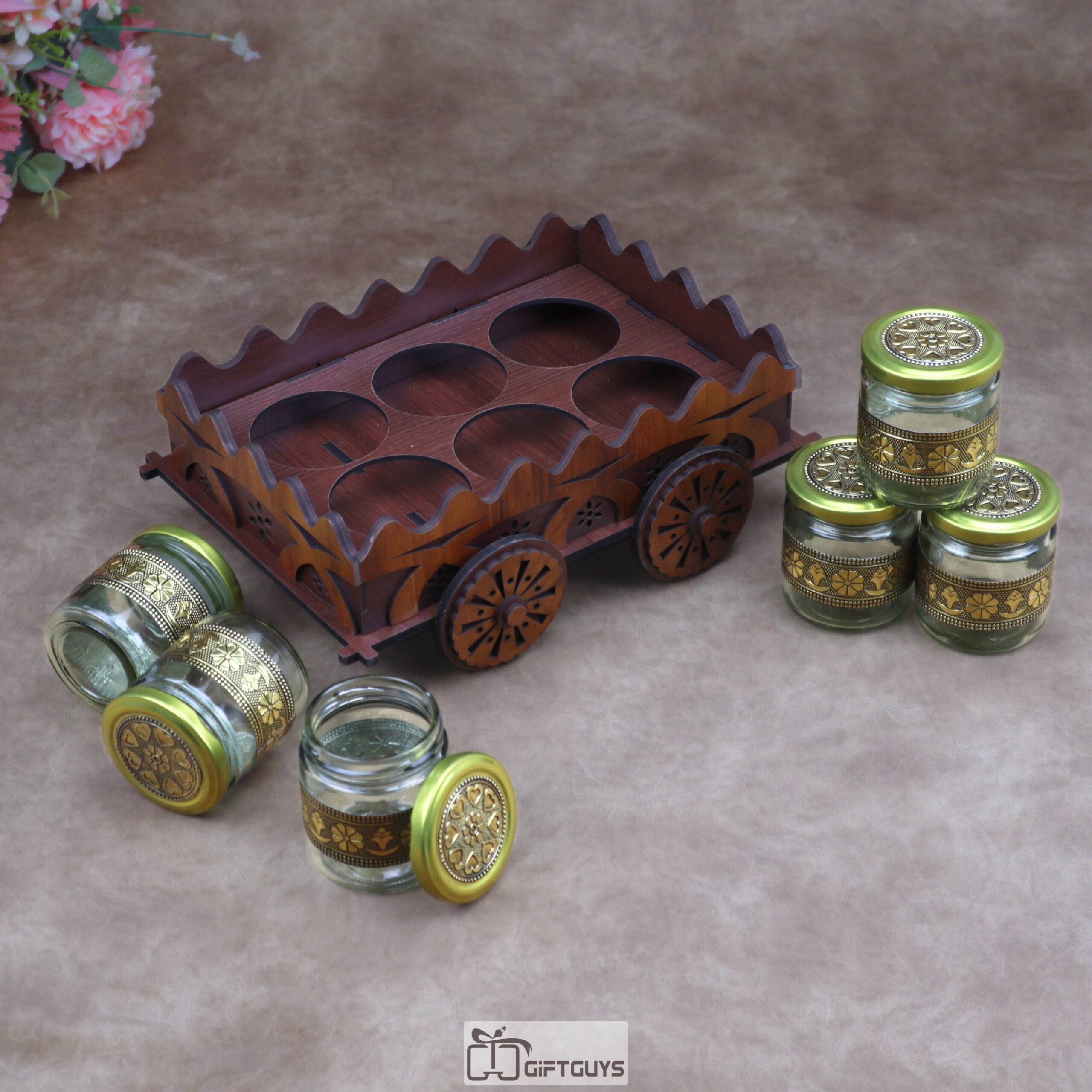 Ultimate Serving Set: 🌟 The cart features elegant glass jars, perfect for serving a wide array of dry fruits, condiments, fennel seeds (mukhwas), or storing spices.