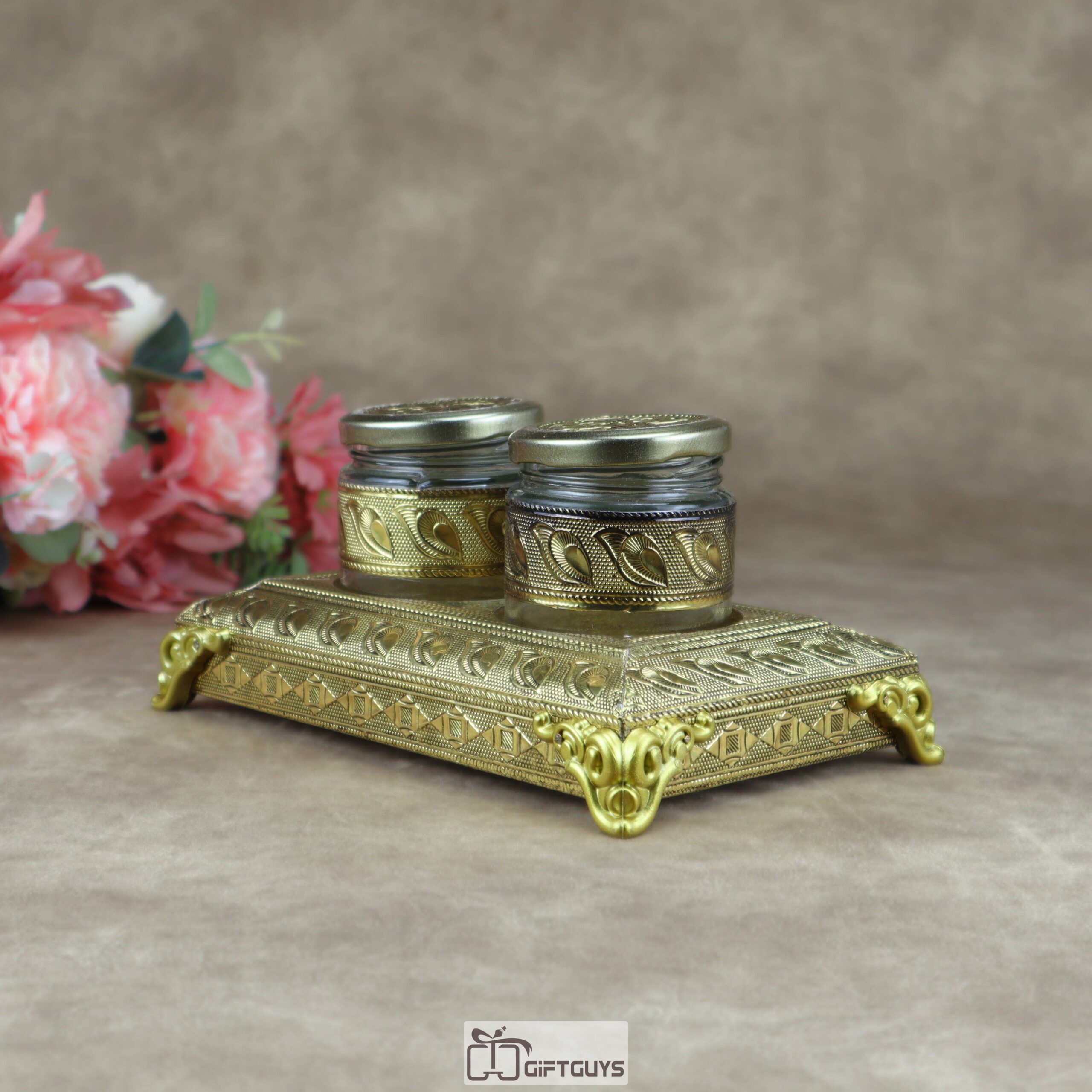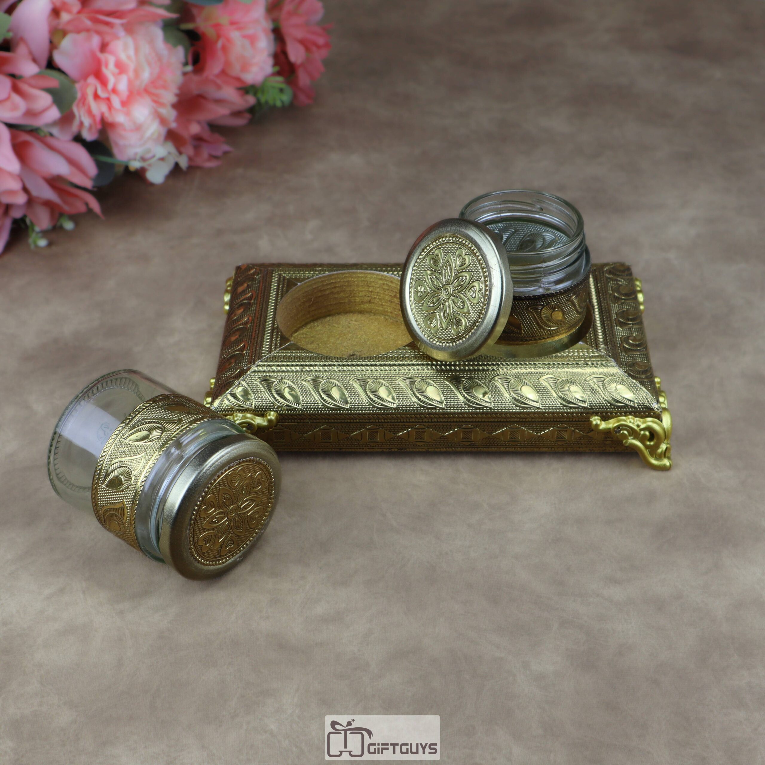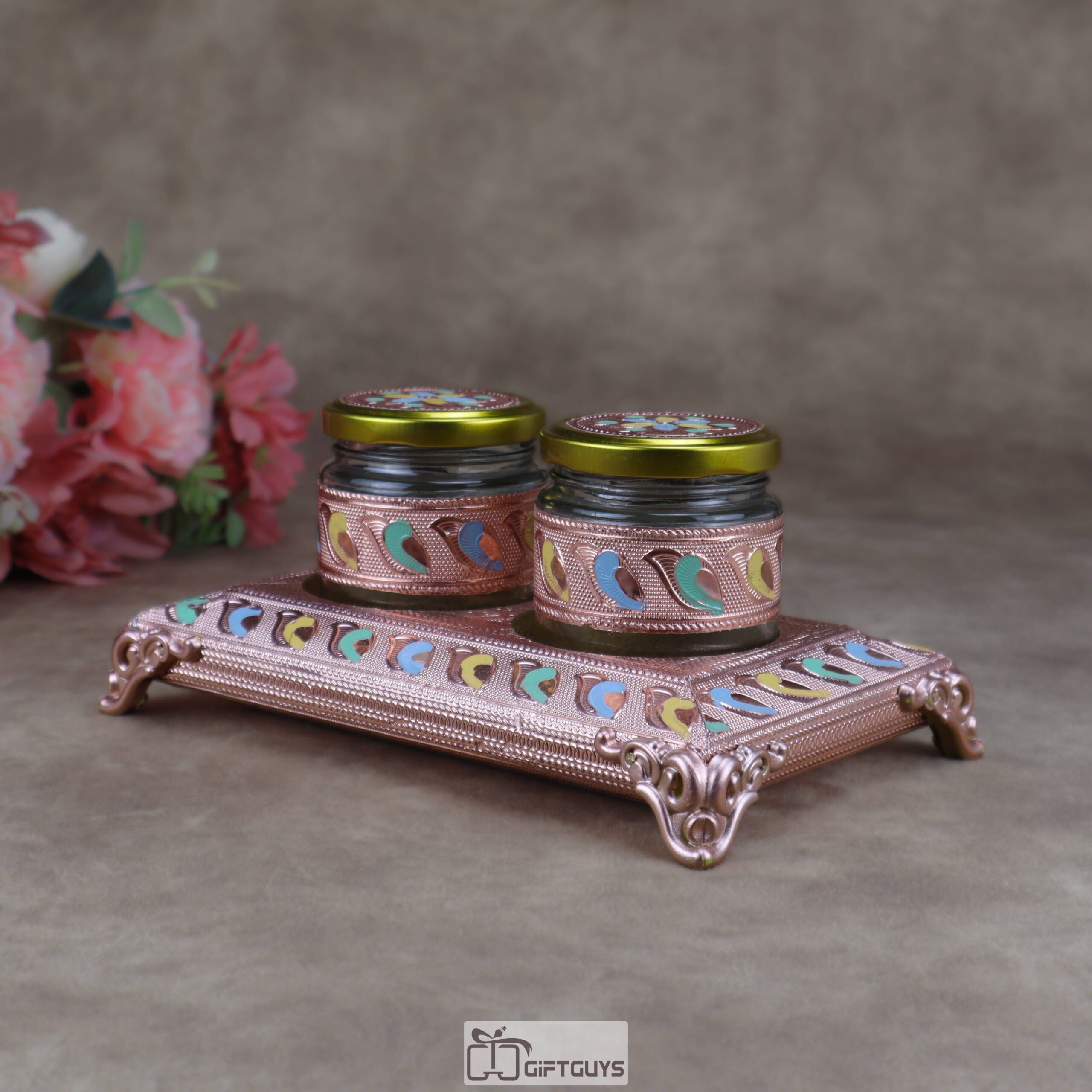 Designer Glass Jars: Each set includes two matching glass jars featuring metallic cladding and ornate floral-etched lids, ideal for serving dry fruits, mouth fresheners (mukhwas), or spices.