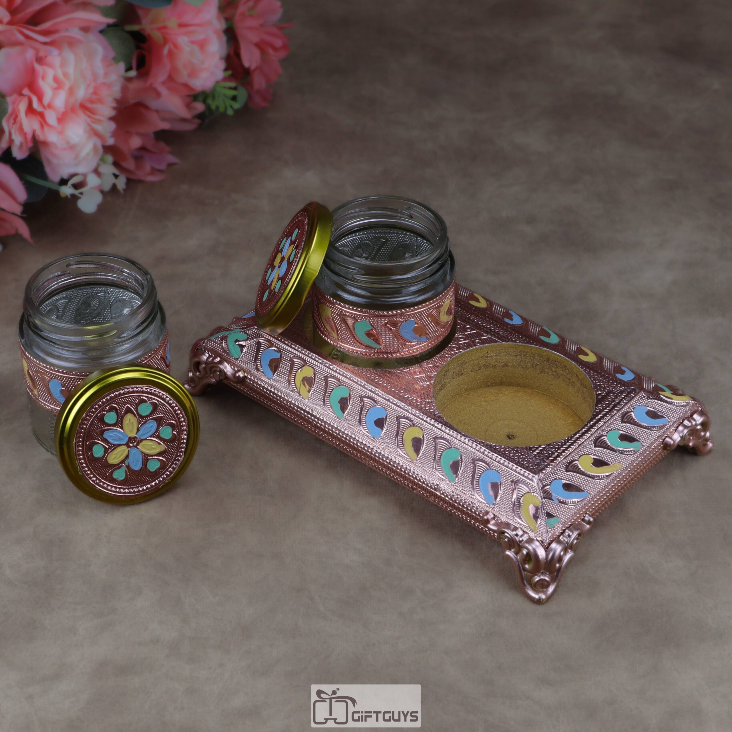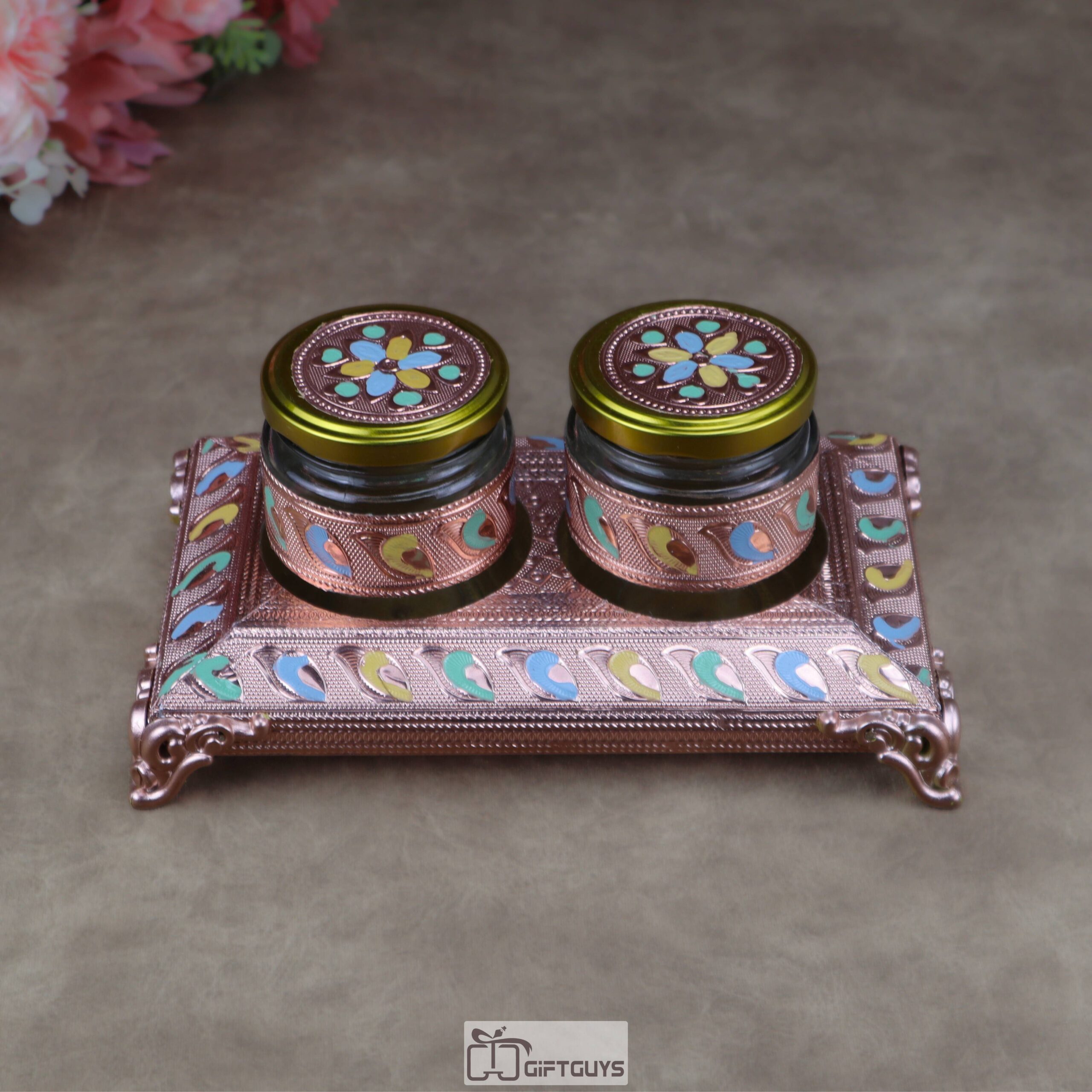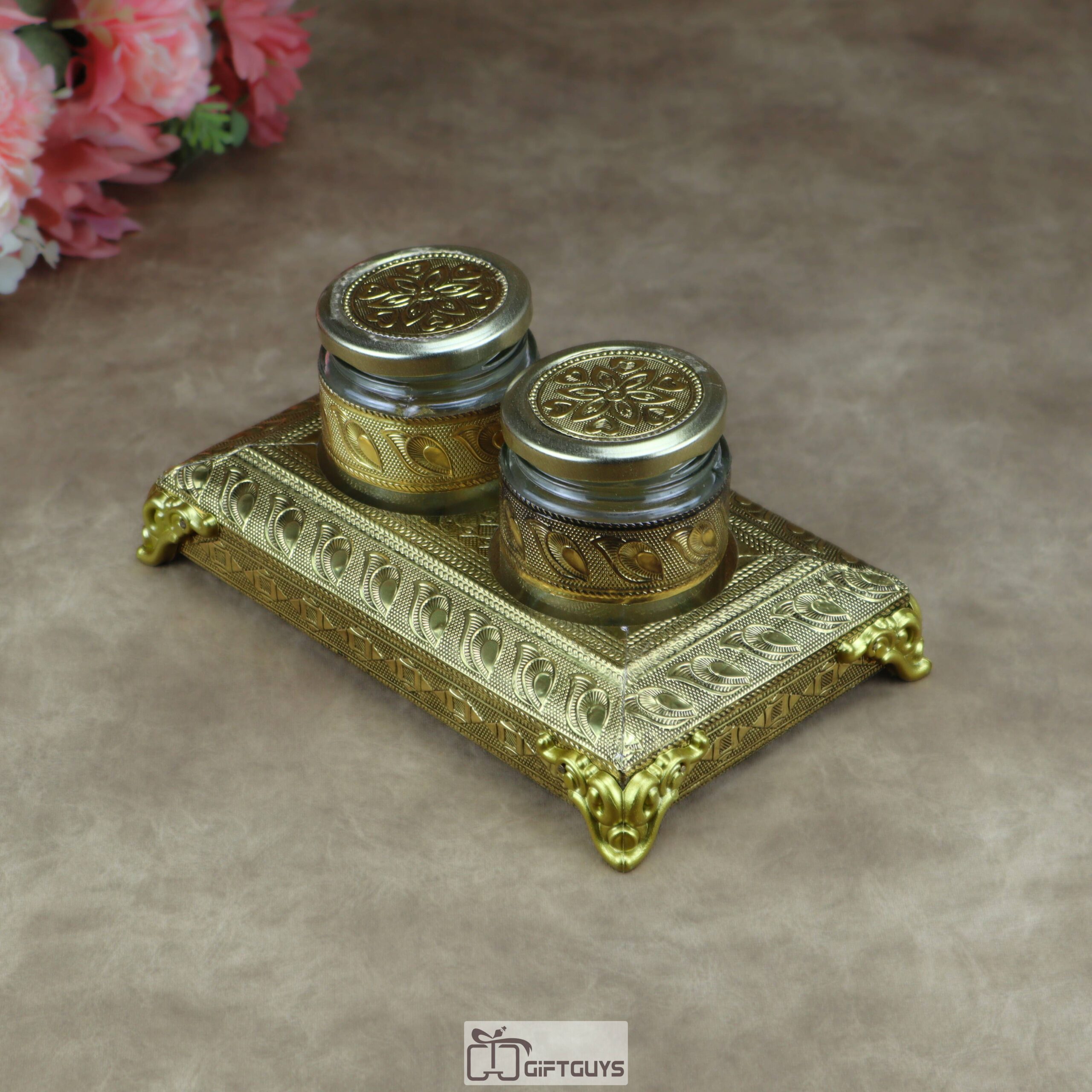 Designer Glass Jars: Each set includes two matching glass jars featuring metallic cladding and ornate floral-etched lids, ideal for serving dry fruits, mouth fresheners (mukhwas), or spices.