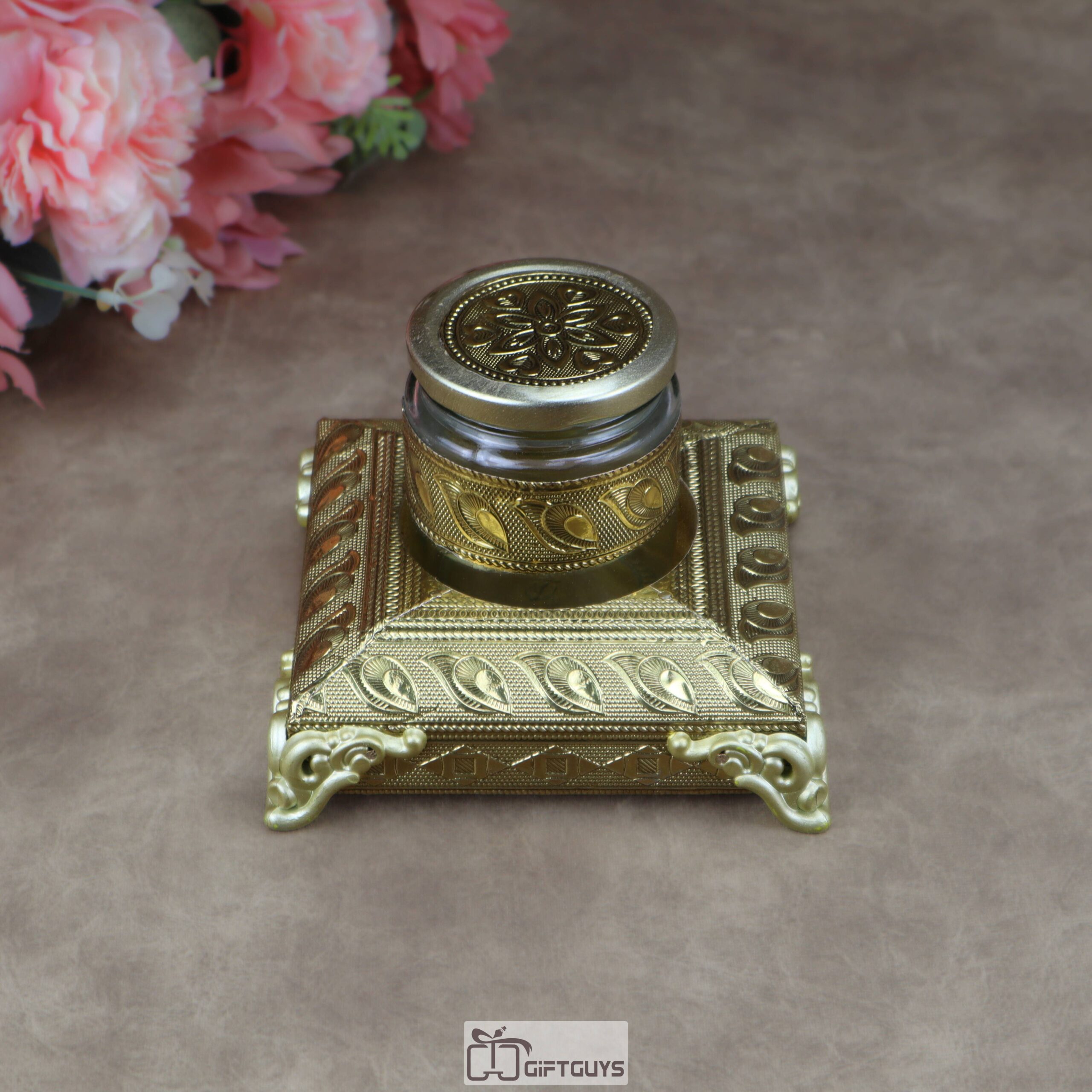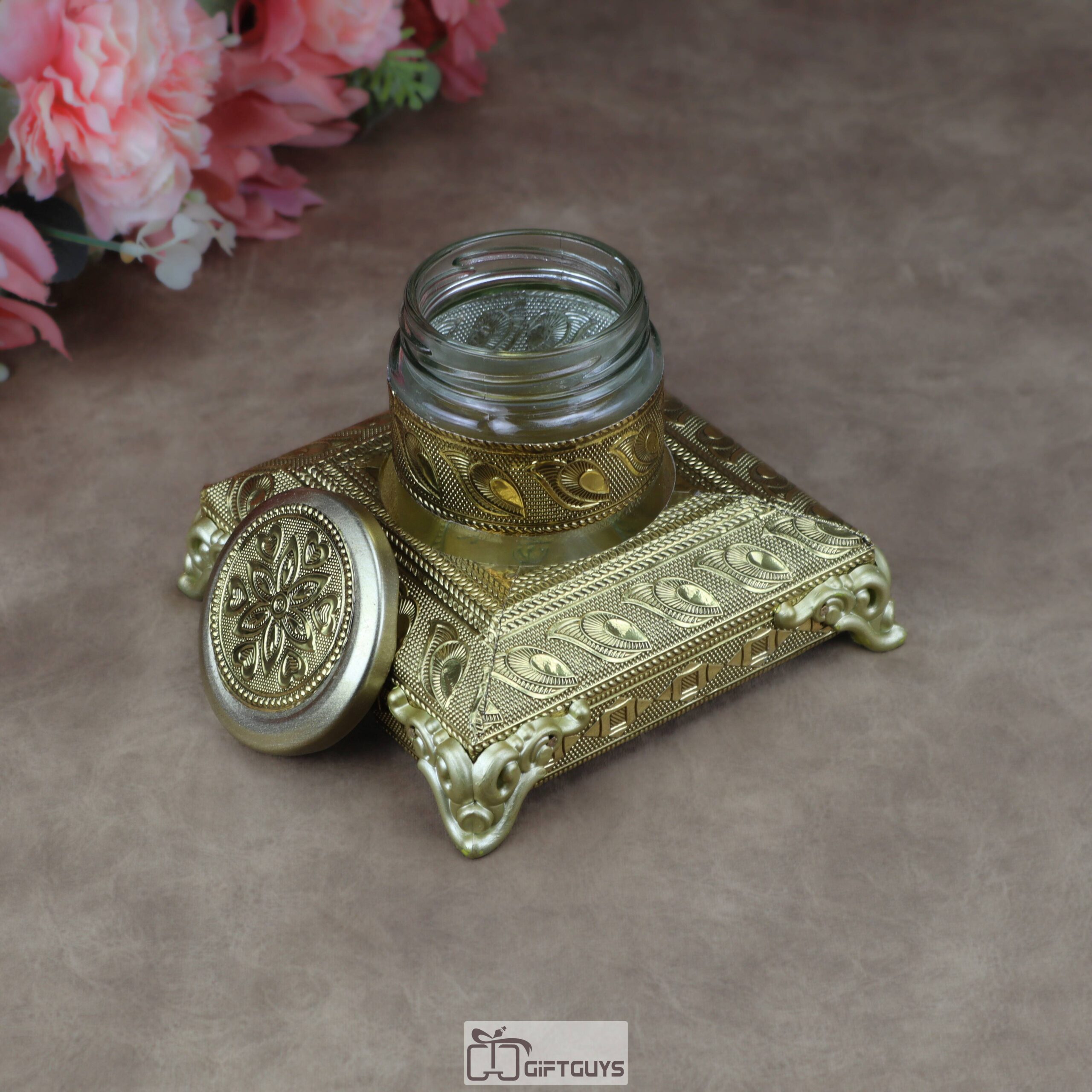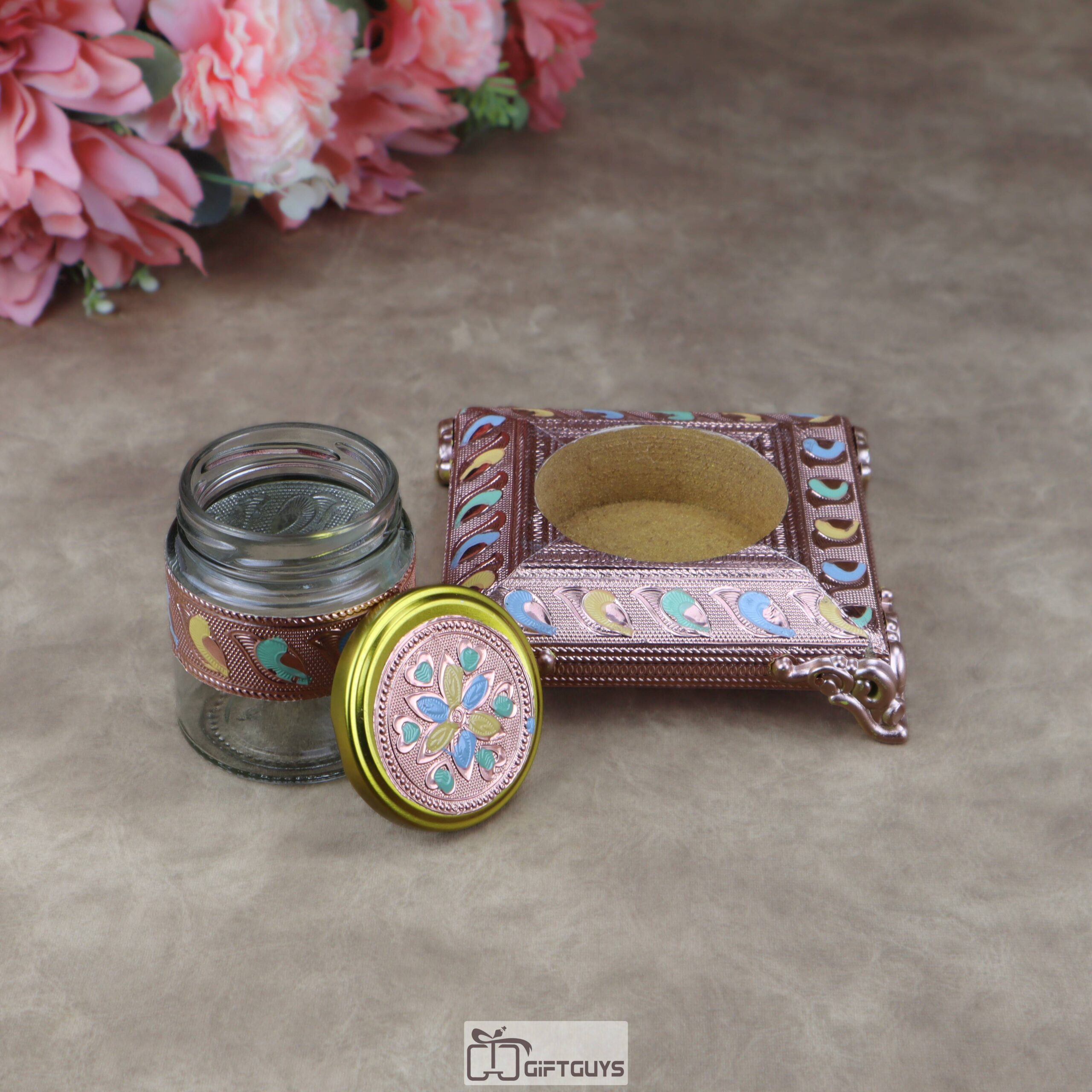 • Designer Glass Jar: Each set includes a matching glass jar adorned with metallic cladding and a decorative floral-embossed lid, perfect for serving dry fruits, mouth fresheners (mukhwas), or spices.