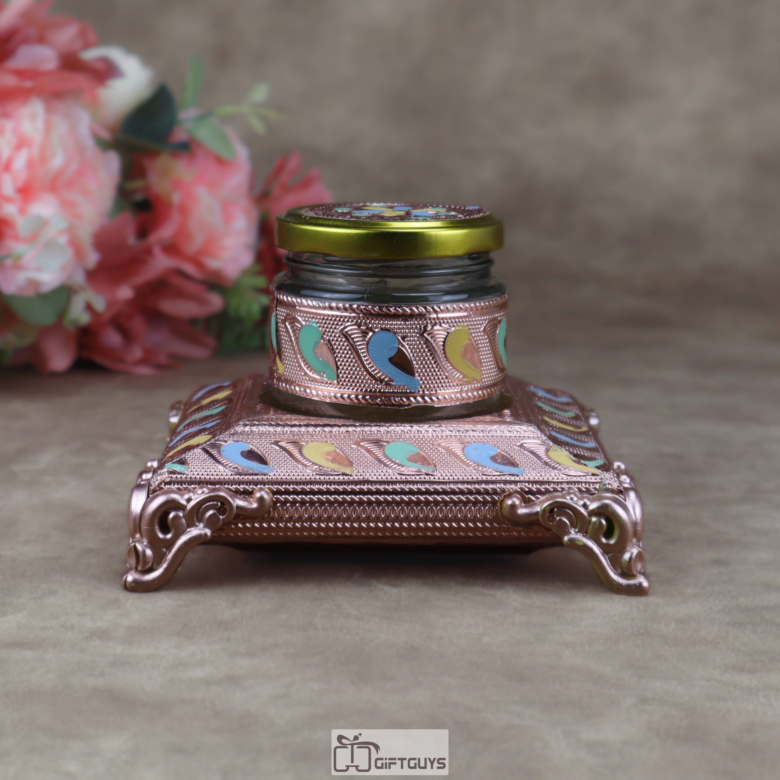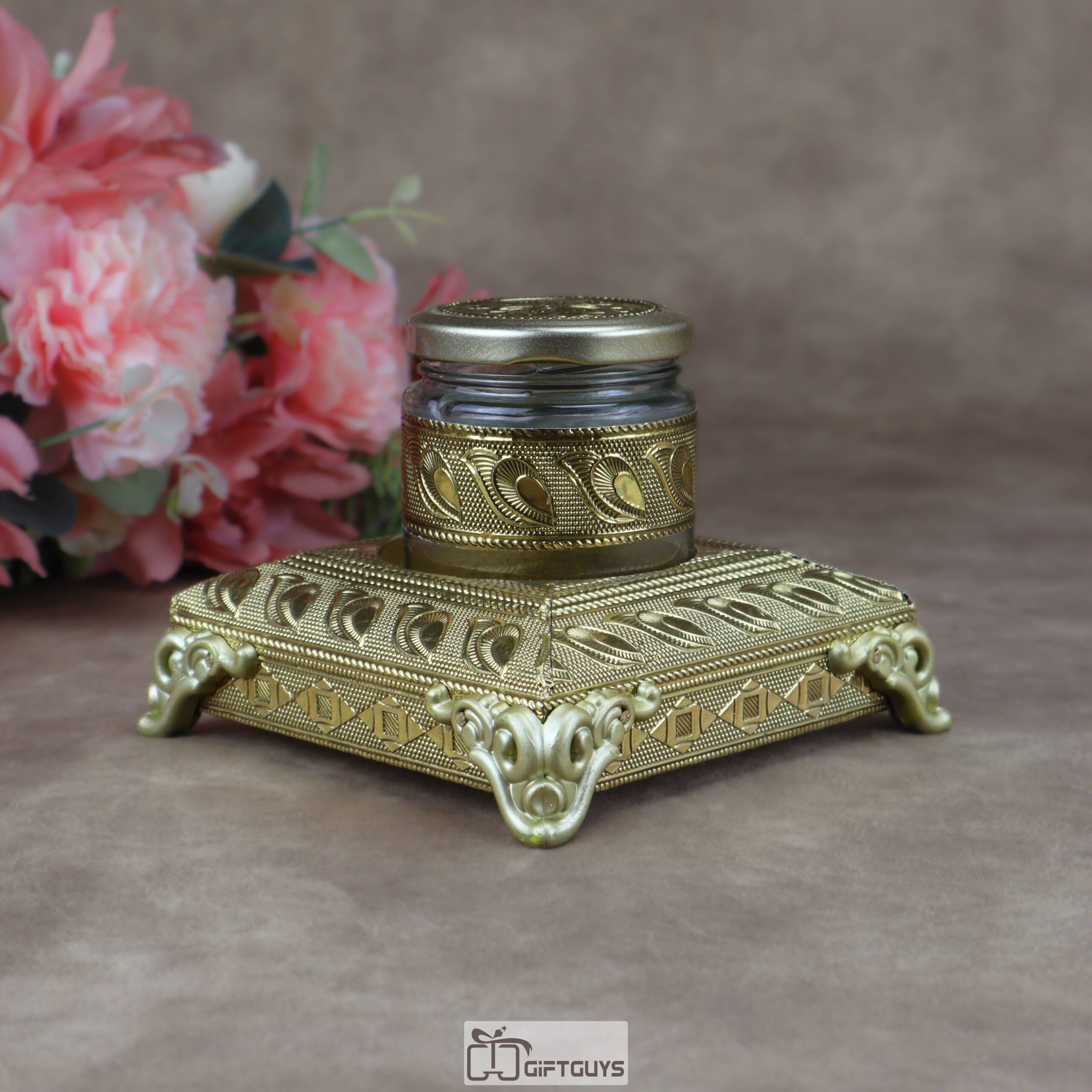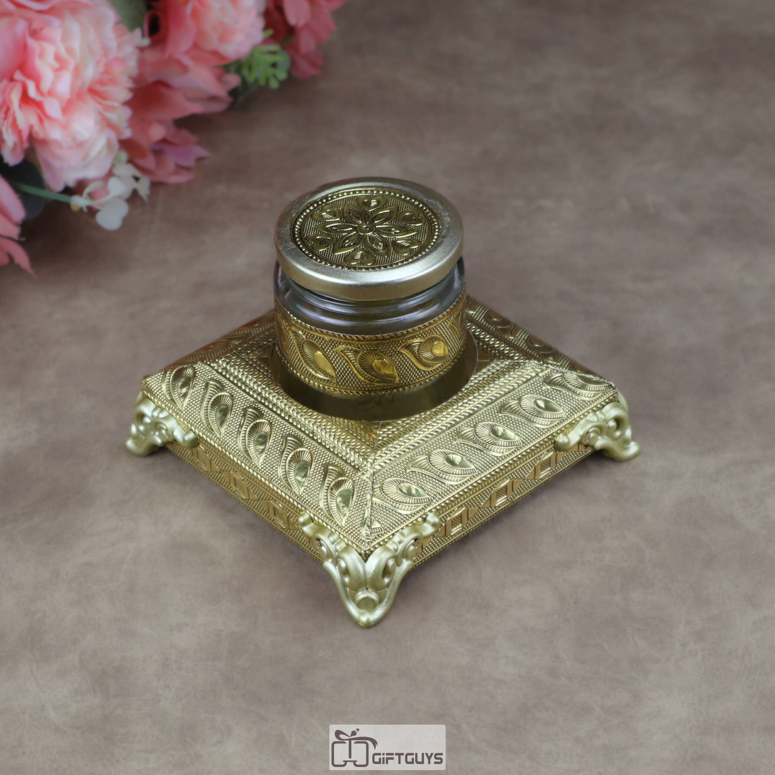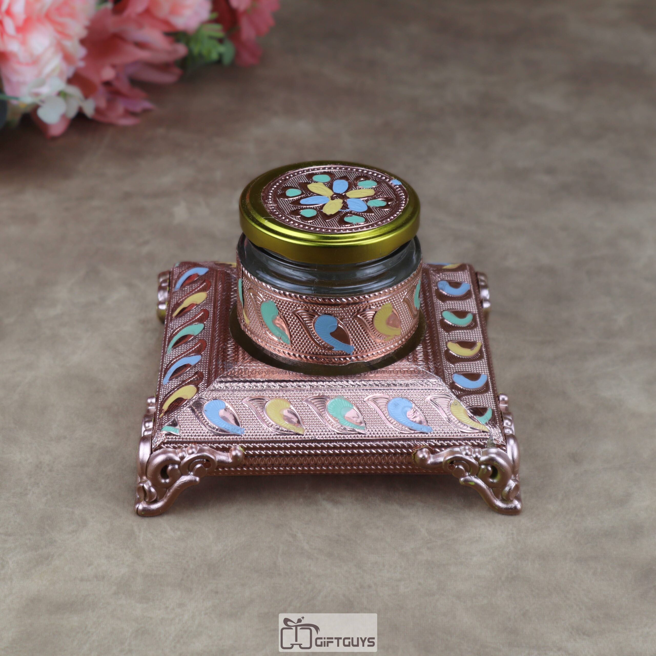• Designer Glass Jar: Each set includes a matching glass jar adorned with metallic cladding and a decorative floral-embossed lid, perfect for serving dry fruits, mouth fresheners (mukhwas), or spices.