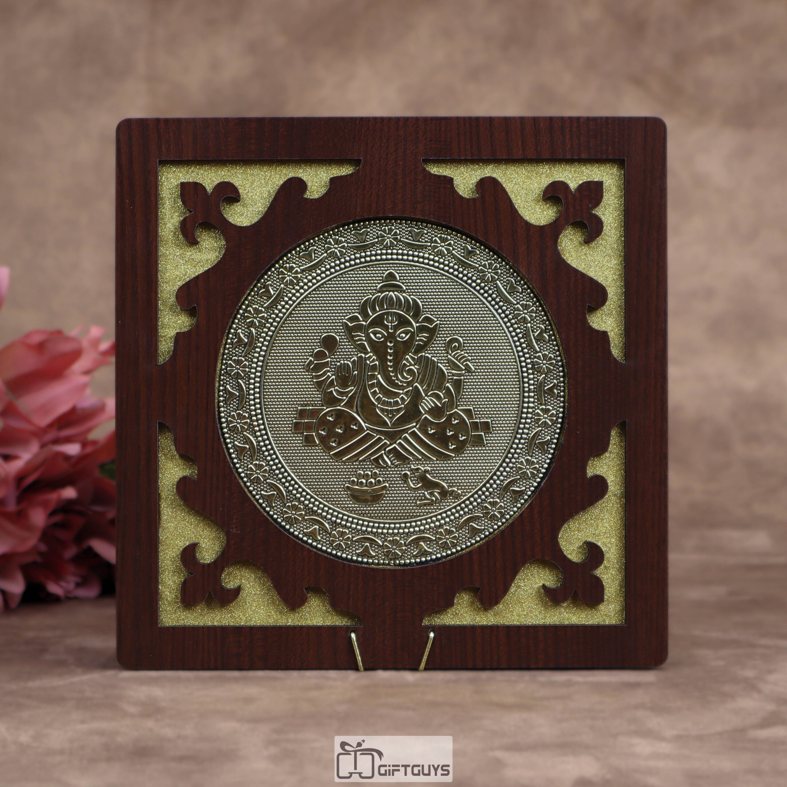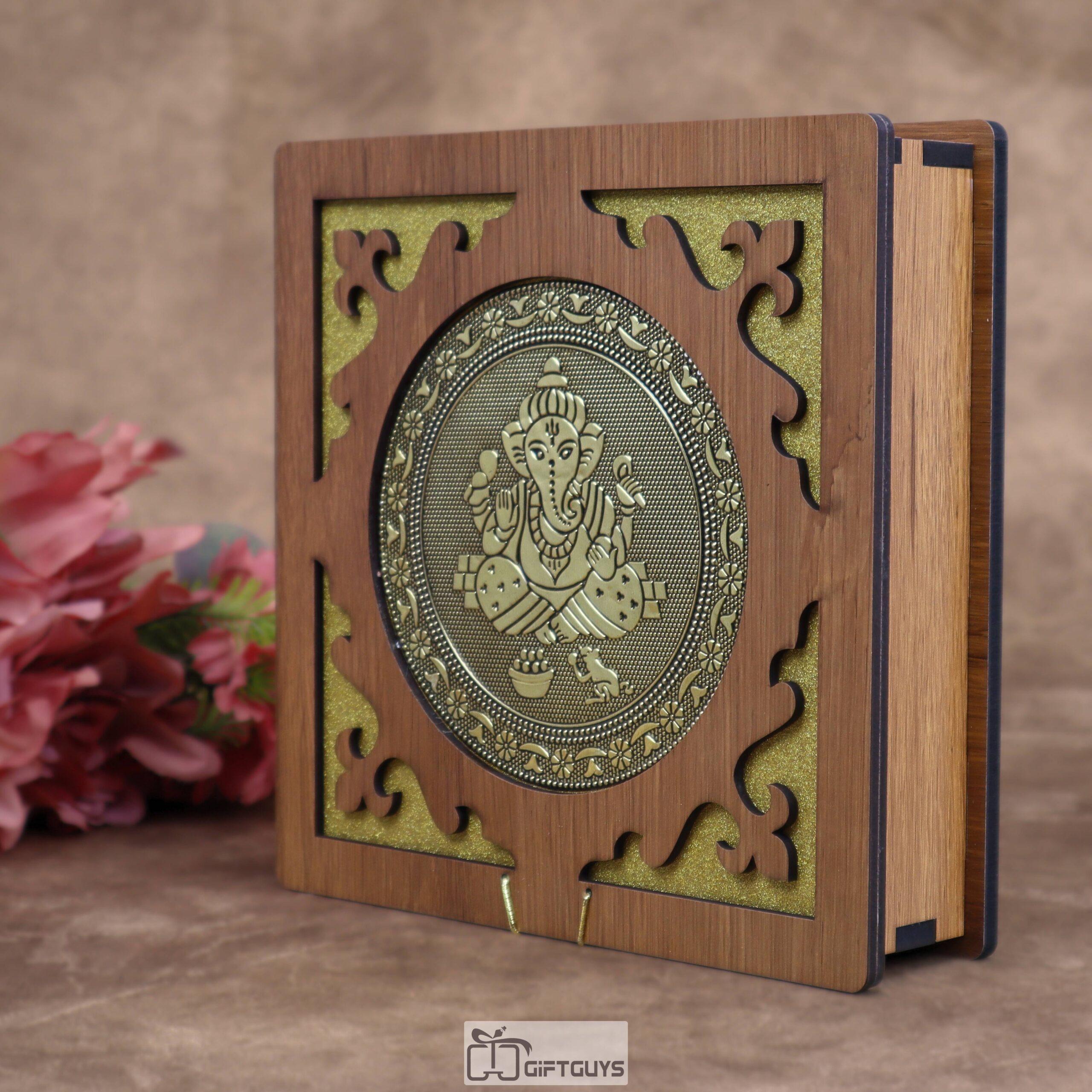 Elegant 8×8 inch wooden dry fruit box with intricate Ganesha metal carving and 4 compartments. Perfect for gifting and festive storage.