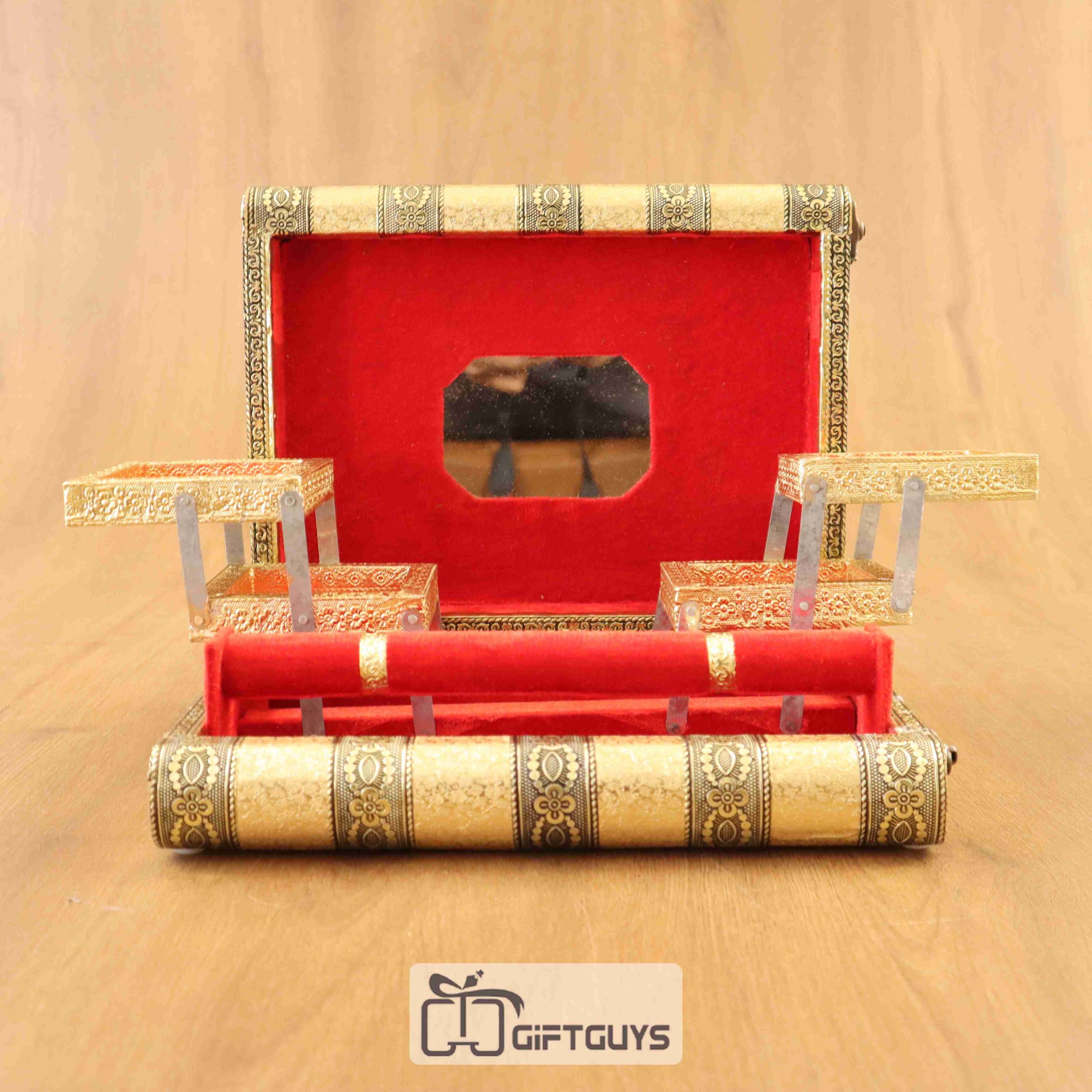 Luxury multi-tier golden jewellery box with mirror and red velvet finish.