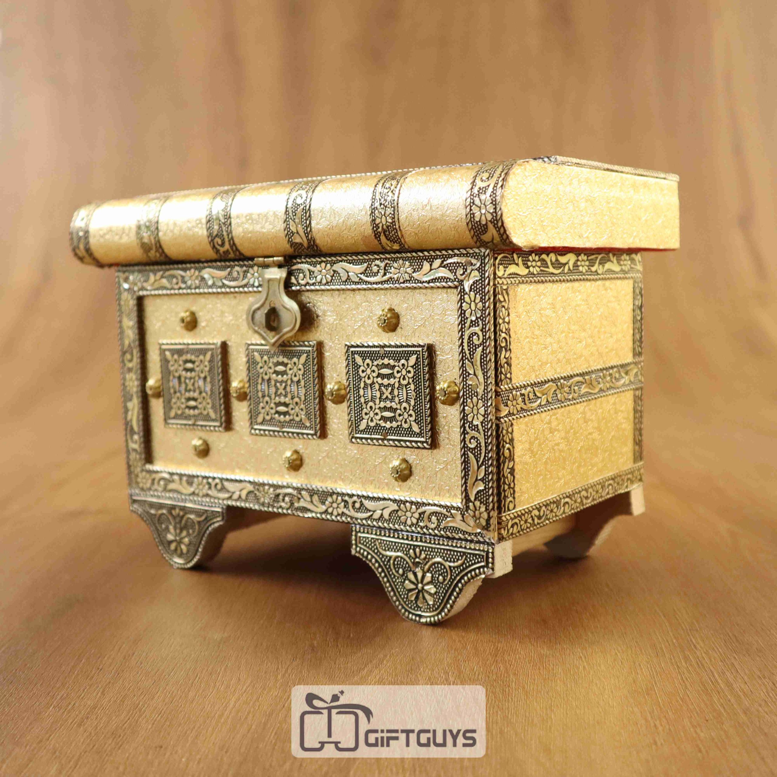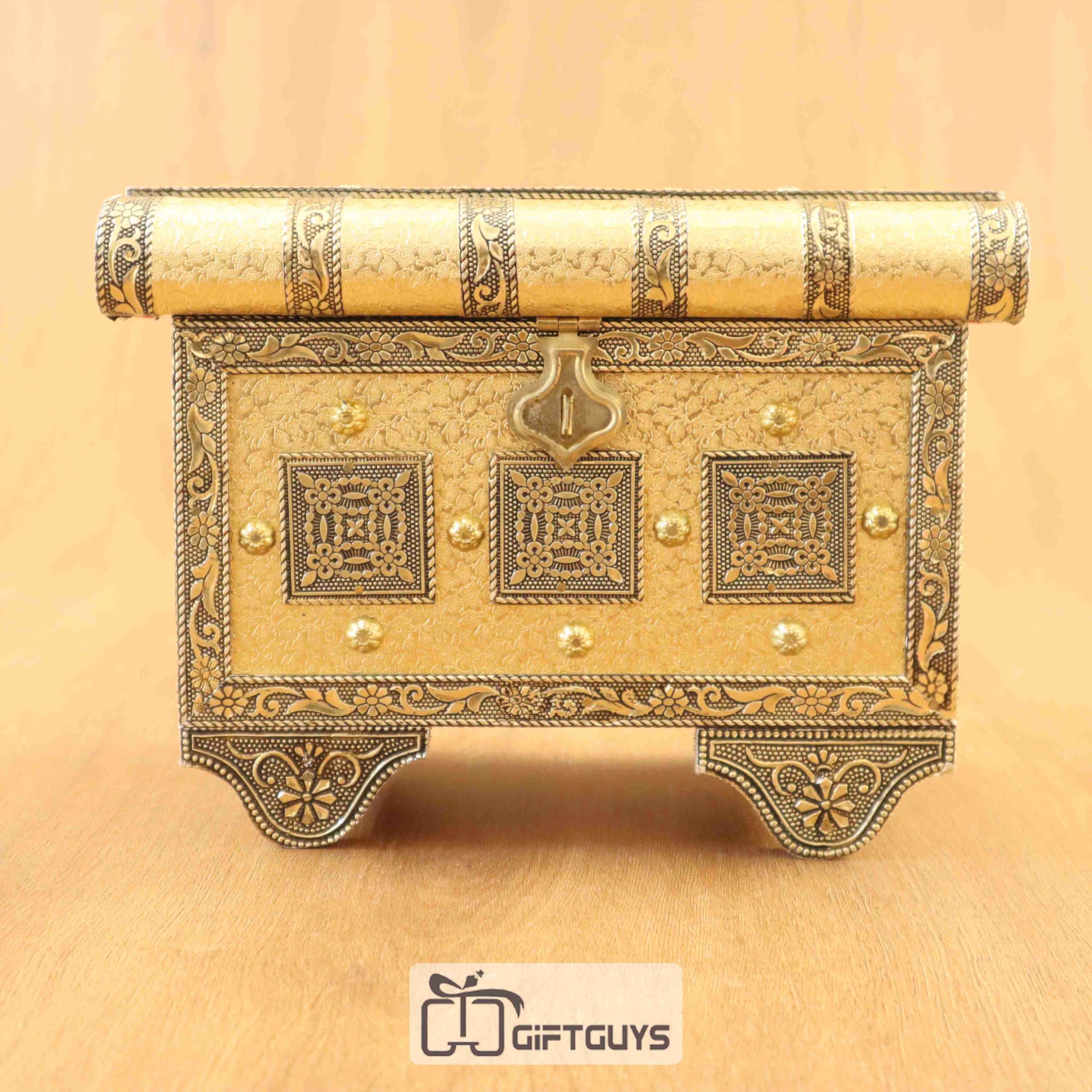 🔸 Elegant Design: Crafted in a traditional sandook (treasure chest) style with antique golden embossing and ornate detailing.